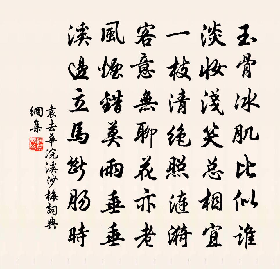 詩詞名句歷史字典書法欣賞書法字典國語詞典說文解字康熙字典古漢語字典標 題 作 者 詩 句 浣溪沙(梅)作者:袁去華 朝代:宋代浣溪沙(梅)原文玉骨冰肌比似誰。淡妝淺笑總相宜。一枝清絕照漣漪。客意無聊花亦老,風煙錯莫雨垂垂。溪邊立馬斷腸時。詩詞問答問:浣溪沙(梅)的作者是誰?答:袁去華問:浣溪沙(梅)寫於哪個朝代?答:宋代問:浣溪沙(梅)是什麼體裁?答:詞袁去華浣溪沙(梅)書法欣賞浣溪沙(梅)書法作品詩詞推薦春行洪咨夔〔宋代〕百舌梢頭一半春,日長無處著閒心。推枰競欲投機早,結眊誰知用意深。梅子胚胎鹽裹味,桐花擺布蜜邊陰。東皋點絳唇(金陵府會鼓子詞)侯置〔宋代〕春日遲遲,柳絲金淡東風軟。綠嬌紅淺。簾幕飛新燕。玉帳優遊,贏得花間宴。香塵遠。暫停歌扇。□醉深深院。大將軍宴會被命作詩陸雲〔魏晉〕祁祁臣僚。有來雍雍。薄言載考。承顏下風。俯覿嘉客。仰瞻玉容。施己唯約。於禮斯豐。天錫難老。如岳之崇。歐陽拾遺讀書堂項安世〔宋代〕茲行覽得失,撫已動競愧。暮景尚可鞭,毋使寸陰棄。山齋郭印〔宋代〕我本丘壑姿,脫巾為謀食。隨牒幾推遷,銅章領岩邑。初期竊餘閒,焚香弄書冊。文法何苦多,日力不暇給。訟紙宿西湖上竺王鎡〔宋代〕不收石上著殘棋,山月無聲鶴睡時。落葉打窗霜滿屋,有僧吟得夜寒詩。奉酬樂天立秋夕有懷見寄李紳〔唐代〕深夜星漢靜,秋風初報涼。階篁淅瀝響,露葉參差光。冰兔半升魄,銅壺微滴長。薄帷乍飄卷,襟帶輕搖颺。此際古風其十二李白〔唐代〕松柏本孤直。難為桃李顏。昭昭嚴子陵。垂釣滄波間。身將客星隱。心與浮雲閒。長揖萬乘君。還歸富春山。清風灞陵亭高蟾〔唐代〕一條歸夢朱弦直,一片離心白羽輕。明日灞陵新霽後,馬頭煙樹綠相迎。次兒輩戲商卿設醴韻二首陳造〔宋代〕水豢山膚自土宜,況邀從事到青齊。賓筵大嚼寧虛口,灶婦深顰想噬臍。爛醉豈無醒酒鱠,明朝重閱不鳴雞。扶頭呈高庵偈釋自圓〔宋代〕外國言音不可窮,起雲亭下一時通。口門廣大無邊際,吞盡楊歧栗棘蓬。橫吹曲辭出關魏徵〔唐代〕中原還逐鹿,投筆事戎軒。縱橫計不就,慷慨志猶存。策杖謁天子,驅馬出關門。請纓羈南越,憑軾下東藩。鬱紆醉太平(壽須溪)顏奎〔宋代〕茶邊水經。琴邊鶴經。小窗甲子初晴。報梅花小春。小冠晉人。小車洛人。醉扶兒子門生。指黃河解清。雜詩絕句十七首梅堯臣〔宋代〕有蟲托斷葑,斷葑日夕流。不知止息處,隨夫非自由。挽京口使君豐郎中十首劉宰〔宋代〕持橐無由侍玉皇,含香僅長漢諸郎。豐碑不用書成績,自有司勛紀太常。送何子溫提刑奉使江東張舜民〔宋代〕奉使江東知幾春,此行重駕赤車輪。青綾故被留歸我,白髮祠郎便乞親。老大豈堪愁桂玉,秋風依舊長鱸蒪。宦途月岩儲泳〔宋代〕天然合成璧,落月透岩暉。不盡團圓影,應知晦蝕機。騎蟾人已去,搗藥兔忘歸。惟有婆娑桂,吹香度客衣。永淳中童謠佚名〔唐代〕新禾不入箱,新麥不入場。迨及 * 月,狗吠空垣牆。題義門胡氏華林書院何蒙〔宋代〕滿眼煙霞與宅連,義高孝弟代相傳。彤庭召對曾承詔,內府頒書特奉宣。學古一門遵法度,禮賓群仆盡精賢。竺齋蟲豸詩。蟆子(三首)元稹〔唐代〕蟆子微於蚋,朝繁夜則無。毫端生羽翼,針喙噆肌膚。暗毒應難免,羸形日漸枯。將身遠相就,不敢恨非辜。晦景名句推薦村北村南,穀雨才耕遍。范成大《蝶戀花·春漲一篙添水面》 暮雲收盡溢清寒。銀漢無聲轉玉盤。蘇軾《陽關曲 / 中秋月》 眼見的吹翻了這家,吹傷了那家,只吹的水盡鵝飛罷!王磐《朝天子·詠喇叭》 流年莫虛擲,華發不相容。方乾《送從兄郜 / 韋郜 / 途中別孫璐》 有兼聽之明,而無矜奮之容;有兼覆之厚,而無伐德之色。荀子《荀子·正名》 右手畫圓,左手畫方,不能兩成。韓非及後人《韓非子·功名》 別來不寄一行書。尋常相見了,猶道不如初。晁沖之《臨江仙·憶昔西池池上飲》 冬宜密雪,有碎玉聲。王禹偁《黃岡竹樓記》 齊唱憲王春樂府,金梁橋外月如霜。李夢陽《汴京元夕》 昨夜吳中雪,子猷佳興發。李白《答王十二寒夜獨酌有懷》