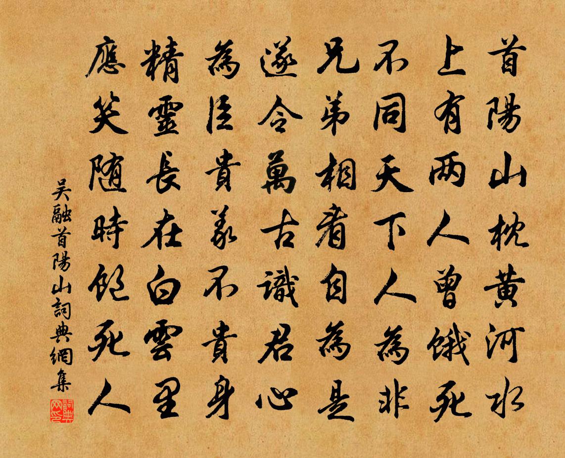 詩詞名句歷史字典書法欣賞書法字典國語詞典說文解字康熙字典古漢語字典標 題 作 者 詩 句 首陽山作者:吳融 朝代:唐代首陽山原文首陽山枕黃河水,上有兩人曾餓死。不同天下人為非,兄弟相看自為是。遂令萬古識君心,為臣貴義不貴身。精靈長在白雲里,應笑隨時飽死人。詩詞問答問:首陽山的作者是誰?答:吳融問:首陽山寫於哪個朝代?答:唐代問:首陽山是什麼體裁?答:七古吳融首陽山書法欣賞首陽山書法作品注釋全唐詩:卷687-41詩詞推薦早秋宿崔業居處秦系〔唐代〕從來席不暖,為爾便淹留。雞黍今相會,雲山昔共游。次韻張秀才雪陳造〔宋代〕可是春皇吝物華,群仙剪水作奇葩。壺中天地渾糜玉,風處園林盡勒花。宿火暖寒聊榾柮,夜光落手急驚嗟。忍飢浣溪沙(春題別墅)吳儆〔宋代〕暖日和風並馬蹄。畦秧隴麥綠新齊。人家桑柘午陰迷。山色解隨春意遠,殘陽還傍遠山低。晚風歸路杜鵑啼。謁金門呂勝己〔宋代〕芳思切,舊事不堪重說。濃露凝香花噴血。花心雙蛺蝶。燕語鶯啼都歇。又過清明時節。記得離歌三兩闋。未歌先晚登江樓有懷李嘉祐〔唐代〕獨坐南樓佳興新,青山綠水共為鄰。爽氣遙分隔浦岫,斜光偏照渡江人。心閒鷗鳥時相近,事簡魚竿私自親。只憶頌古一○一首釋子淳〔宋代〕劫火洞然無相宅,金門不睹玉樓家。寶天雲淡銀河冷,浩浩波瀾豈動沙。關成嘉父崔與之〔宋代〕諸老不敢吏,我來容友之。調高械夏曲,局熟弈秋棋。南斗捩船柁,西風吹鬢絲。莫將金玉質,膏沐畫長眉。地僻陸游〔宋代〕地僻臨湍瀨,門幽長綠苔。客書疑誤達,僧刺媿虛來。清露苹花坼,斜陽燕子回。自憐猶有恨,佳日對空罍。送靈江住金華講院釋行海〔宋代〕名自黃扉遴選來,山中亦有禰衡材。清風八詠雙溪月,講徹蓮花第一回。荷橋暮坐三首楊萬里〔宋代〕橋剪荷花兩段開,荷花留我不容回。不勝好處荷橋坐,政是涼時蚊子來。春日雜題陸游〔宋代〕梅花三十本,圍以疏竹籬,入春甫十日,開遍南北枝。少年輕節物,老大復苦衰,坐見零落盡,一杯初未持。次韻東魯省游石龜山戴表元〔宋代〕一舸悠悠醉又醒,溪山無語意分明。龜身何日化蒼石,鶴背有人游紫清。百榼頒空看少俊,千金難買是春晴。筵端和用明梅十三絕胡寅〔宋代〕雪消天氣一審新,水際逢春淑且真。未信長安多麗者,定知空谷有佳人。己已秋七月不雨人心焦然乃戊午齋宿致城隍清牟巘五〔宋代〕老火猶驕氣蘊隆,爐香爇罷日方中。片雲忽卷天河落,頃刻難名造化功。西園十詠錦亭吳中復〔宋代〕簾幕臨彫檻,窗疏照爛霞。園林初過雨,風日猛催化。香入遊人袖,紅堆刺史家。四時俱好景,終不似春華。晚渡蘇泂〔宋代〕小雨濕詩人,人疑過渡頻。望山高著眼,就樹巧遮身。有句尋鷗說,無家認鶴親。明朝上京去,釃酒酹溪神。午枕陸游〔宋代〕老嬾開編早欠伸,強搔短髮照青熒。齏鹽二十年前夢,尚想長廊撼夜鈴。喜雪李商隱〔唐代〕朔雪自龍沙,呈祥勢可嘉。有田皆種玉,無樹不開花。班扇慵裁素,曹衣詎比麻。鵝歸逸少宅,鶴滿令威家。寂寞題城南書院三十四詠張栻〔宋代〕秋風颯颯林塘晚,萬綠叢中數點紅。若識榮枯是真實,不知何物更談空。和答魏道輔寄懷十首黃庭堅〔宋代〕排江鬼瞰室,貫朽粟紅陳。君行誰為容,款門定生嗔。諒無綈袍故,儘是白頭新。天涯阿介老,有鼻可揮斤。名句推薦舊相思、偏供閒晝。吳文英《夜遊宮·春語鶯迷翠柳》 合軍聚眾, 務在激氣孫臏《孫臏兵法·延氣》 涼風起天末,君子意如何。杜甫《天末懷李白》 凡與敵戰,必須料敵詳審而後出兵。佚名《百戰奇略·第五卷·輕戰》 一點烽傳散關信,兩行雁帶杜陵秋。陸游《秋晚登城北樓》 永豐柳,無人盡日飛花雪。張先《千秋歲·數聲鶗鴂》 馬逢伯樂而嘶,人遇知己而死。羅貫中《三國演義·第六十回》 明妃留在兩眉愁,萬古春山顰不盡元好問《玉樓春·驚沙獵獵風成陣》 落木千山天遠大,澄江一道月分明。黃庭堅《登快閣》 明朝又是孤舟別,愁見河橋酒幔青。竇叔向《夏夜宿表兄話舊》
