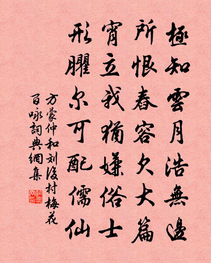 詩詞名句歷史字典書法欣賞書法字典國語詞典說文解字康熙字典古漢語字典標 題 作 者 詩 句 和劉後村梅花百詠作者:方蒙仲 朝代:宋代和劉後村梅花百詠原文極知雲月浩無邊,所恨舂容欠大篇。宵立我猶嫌俗士,形臞爾可配儒仙。詩詞問答問:和劉後村梅花百詠的作者是誰?答:方蒙仲問:和劉後村梅花百詠寫於哪個朝代?答:宋代方蒙仲和劉後村梅花百詠書法欣賞和劉後村梅花百詠書法作品詩詞推薦東齋雜書陸游〔宋代〕有客可劇談,有酒可盡醉;老夫老更窮,終日惟坐睡。既無客款門,酒亦未易致。頹然北窗下,兀兀有餘味。送楊大年知處州二首錢若水〔宋代〕夫子厭承明,還求領郡行。兩章乾負扆,數刻對延英。豈獨彩衣樂,兼為晝錦榮。聖朝循吏傳,首得見君名。句張秉〔宋代〕疊石自然成雁塔,貯泓依舊作龍塘。猛虎行·飢不從猛虎佚名〔兩漢〕飢不從猛虎食,暮不從野雀棲。野雀安無巢,遊子為誰驕。奉酬吳洪二公三和之什劉克莊〔宋代〕衰容懶鑷白髭鬚,新詠難追紀少瑜。攀檻公曾排禹佞,下帷我亦鄙弘諛。瓶沽何必太玄也,褐博嘗聞大勇乎。捽茹酬哥舒大見贈白居易〔唐代〕去歲歡游何處去,曲江西岸杏園東。花下忘歸因美景,尊前勸酒是春風。各從微宦風塵里,共度流年離別中。今日江豚詩孔武仲〔宋代〕黑者江豚,白者白鬐。狀異名殊,同宅大水。淵有群魚,掠以肥已。是謂小害,顧有可喜。大川夷平,縞素不起。光山謠張耒〔宋代〕艤舟淮南望新息,天遣清淮限南北。崎嶇細路入光山,野色蒼涼秋日白。八月獲稻田無水,蚱蜢群飛稻 * 。危橋愁思魚玄機〔唐代〕落葉紛紛暮雨和,朱絲獨撫自清歌。放情休恨無心友,養性空拋苦海波。長者車音門外有,道家書卷枕前多。布衣贈別王侍御赴上都韓翃〔唐代〕翩翩馬上郎,執簡佩銀章。西向洛陽歸鄠杜,回頭結念蓮花府。朝辭芳草萬歲街,暮宿春山一泉塢。青青樹色傍行暑中自遣陸游〔宋代〕名山處處得幽尋,破硯時時出苦吟。上藥和平無近效,古詩簡淡有遺音。蘇門隱去聞孤嘯,栗里歸來弄素琴。尚恐和顏長官百詠客路朱繼芳〔宋代〕是處人家搗練忙,天寒日短路偏長。蛬聲四壁無時歇,不遣羈人夢到鄉。次黃司戶紅糟韻四首項安世〔宋代〕江南水作桃花紅,釀成十五女兒容。眉山先生忽驚見,一曲便欲拚千鍾。誰傅春過信江北,小槽殘滴何能豐。相逢十離詩。馬離廄薛濤〔唐代〕雪耳紅毛淺碧蹄,追風曾到日東西。為驚玉貌郎君墜,不得華軒更一嘶。謁金門黃機〔宋代〕風雨後。枝上綠肥紅瘦。樂事參差團不就。一春如病酒。樓外暖煙楊柳。憶得年時攜手。燕子雙雙來未久。頗知人過京山李曾伯〔宋代〕總角嬉遊處,重來轉盼然。溪山猶昨日,朋友盡中年。舊話逢人說,新詩為客傳。喚迴風雨夢,猶記北窗眠。寄黃龍清老三首黃庭堅〔宋代〕風前橄欖星宿落,日下桄榔羽扇開。昭默堂中有相憶,清愁忽遣化人來。南楚懷古劉長卿〔唐代〕南國久蕪沒,我來空鬱陶。君看章華宮,處處生蓬蒿。但見陵與谷,豈知賢與豪。精魂托古木,寶劍捐江皋。倚棹西園晚步二首楊萬里〔宋代〕為愛荷池日日來,一來一度眼雙開。畫船不曉風相戲,猛觸花堤得倒回。新春感事八首終篇因以自解陸游〔宋代〕烏藤即是碧油幢,百萬天魔指顧降。酣枕不知霜縞瓦,下床已見日烘窗。名句推薦迴廊一寸相思地,落月成孤倚。納蘭性德《虞美人·銀床淅瀝青梧老》 當家才知鹽米貴,養子方知父母恩。佚名《增廣賢文·上集》 人生貴得適意爾,何能羈宦數千里以要名爵!劉義慶《世說新語·識鑒》 泥上偶然留指爪,鴻飛那復計東西。蘇軾《和子由澠池懷舊》 月落烏啼霜滿天,江楓漁火對愁眠。張繼《楓橋夜泊 / 夜泊楓江》 路逢險處須迴避,事到臨頭不自由。佚名《增廣賢文·上集》 情之所鍾,雖醜不嫌。沈復《浮生六記·閨房記樂》 竹竿有甘苦,我愛抱苦節。孟郊《苦寒吟》 移舟水濺差差綠,倚檻風擺柄柄香鄭谷《蓮葉》 客里看春多草草,總被詩愁分了張炎《清平樂·采芳人杳》