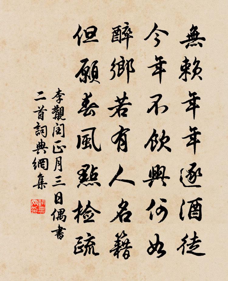 詩詞名句歷史字典書法欣賞書法字典國語詞典說文解字康熙字典古漢語字典標 題 作 者 詩 句 閏正月三日偶書二首作者:李覯 朝代:宋代閏正月三日偶書二首原文無賴年年逐酒徒,今年不飲興何如。醉鄉若有人名籍,但願春風點檢疏。詩詞問答問:閏正月三日偶書二首的作者是誰?答:李覯問:閏正月三日偶書二首寫於哪個朝代?答:宋代李覯閏正月三日偶書二首書法欣賞閏正月三日偶書二首書法作品詩詞推薦六醜楊 * 〔宋代〕歡濃歡易散,便忍把、恩情拋擲。恁時寸心,情思牛翅翼。別後蹤跡。不定如萍泛,暫拋江沔,又留連京國。芳容登西靈塔陳潤〔唐代〕塔廟出招提,登臨碧海西。不知人意遠,漸覺鳥飛低。稍與雲霞近,如將日月齊。遷喬未得意,徒欲躡雲梯。題五畏齋葉適〔宋代〕曹滕亦據南面權,坐衙吏貼群趨先。敢雲威福自我出,下有赤子高蒼天。聖人鬼興建皇極,付祝長管尤惻惻。前碑中酒韋莊〔唐代〕南鄰酒熟愛相招,蘸甲傾來綠滿瓢。一醉不知三日事,任他童稚作漁樵。題梅花便面陳郁〔宋代〕白團橫寫向南枝,冷蕊寒梢手自持。絕似曉空涼影里,月明中有桂花詩。雜詠一百首豫子劉克莊〔宋代〕紛紛荊聶輩,猶有利而為。智氏已無後,先生欲報誰。晴日元稹〔唐代〕多病苦虛羸,晴明強展眉。讀書心緒少,閒臥日長時。昭陽殿柴望〔宋代〕禍水流來漢火亡,白頭宮女恨昭陽。至今人見飛來燕,猶為君王暗斷腸。破山八詠龍門澗劉拯〔宋代〕白龍門巍峰,長澗落千尺。靈泉應奇蹤,高連暮雲碧。寒影凌蒼崖,清流動危石。八月苗正枯,猶能變甘澤。清平樂 寄復初省郎,兼簡希孟文友曹伯啟〔元代〕情懷渺渺。客舍天將曉。百慮攻心渾未了。不似漫郎多少。人生傀儡棚中。此行那計西東。指日雲泥超異,重占口呂文靖亭候帖贊岳珂〔宋代〕嘉定乙亥,珂丞軍器,居於寶蓮。鄰有善士,曰范擇能,實祖太史。百年相承,文獻攸萃。暇日啟鑰,扶奇出秘。積雪未晴正旦朝賀大慶殿口號八章程公許〔宋代〕萬點華星續續來,宮門未放玉{上竹下氐}開。忍寒少待晨光透,不住催班引上台。山居雜詩九十首曹勛〔宋代〕天地有大德,好生洽民心。炎雲漲毒暑,此風散重陰。欲驅冞旬熱,忽作三日霖。人物荷造化,喜歸田畝深。周美成友議帖贊岳珂〔宋代〕左太沖賦三都十年,門牆藩溷皆著紙筆。予意其因心寓墨池模倣之妙,而未必徒以詫記事備言之述。不然則亦焉用米元章臨顏真卿放生池帖贊岳珂〔宋代〕楷正而端方,維顏之長。軒昂而自善,維米之體。多嗜而博愛,故能有其態。略跡而取神,故不沒其真。是曰唐放將游太平宮小詩呈趙季茂岳珂〔宋代〕聖治峰前松檜寒,舊遊從此解歸鞍。著身泉石無心客,主掌雲山正額官。老去隱居居紫府,新來雜壓壓黃冠。門東攤破浣溪沙/山花子李清照〔宋代〕病起蕭蕭兩鬢華。臥看殘月上窗紗。豆蔻連梢煎熟水,莫分茶。枕上詩書閒處好,門前風景雨來佳。終日向人多醞知遇華岳〔宋代〕淮陰西漢一英雄,史氏持衡論亦工。不向追亡羨蕭相,卻於援死著滕公。豈知並績三人傑,皆自當時一語功。後世山偈奉餞九江純禪者歸東林受業釋心月〔宋代〕年來佛法帶譊訛,十卜乾千不較多。寄語東林略抬手,看伊眼腦是如何。呈審知二首趙蕃〔宋代〕秋風已作重陽雨,客子將回下水船。卒歲褐裘悲破篋,豐年稌黍欠多田。平生漫說詩書學,滿眼不祛兒女煎。頗怪名句推薦今年海角天涯。蕭蕭兩鬢生華。李清照《清平樂·年年雪裡》 愛而知其惡,憎而知其善。戴聖《禮記·曲禮上》 柘彈何人發,黃鸝隔故宮。溫庭筠《清明日》 責人勿厲,小惠或有大得。來俊臣《羅織經·保身卷第七》 雨里雞鳴一兩家,竹溪村路板橋斜。王建《雨過山村》 春路雨添花,花動一山春色。秦觀《好事近·夢中作》 犬吠水聲中,桃花帶露濃。李白《訪戴天山道士不遇》 千里澄江似練,翠峰如簇。王安石《桂枝香·登臨送目》 微微風簇浪,散作滿河星。查慎行《舟夜書所見》 踏破鐵鞋無覓處,得來全不費工夫。馮夢龍《醒世恆言·卷十三》