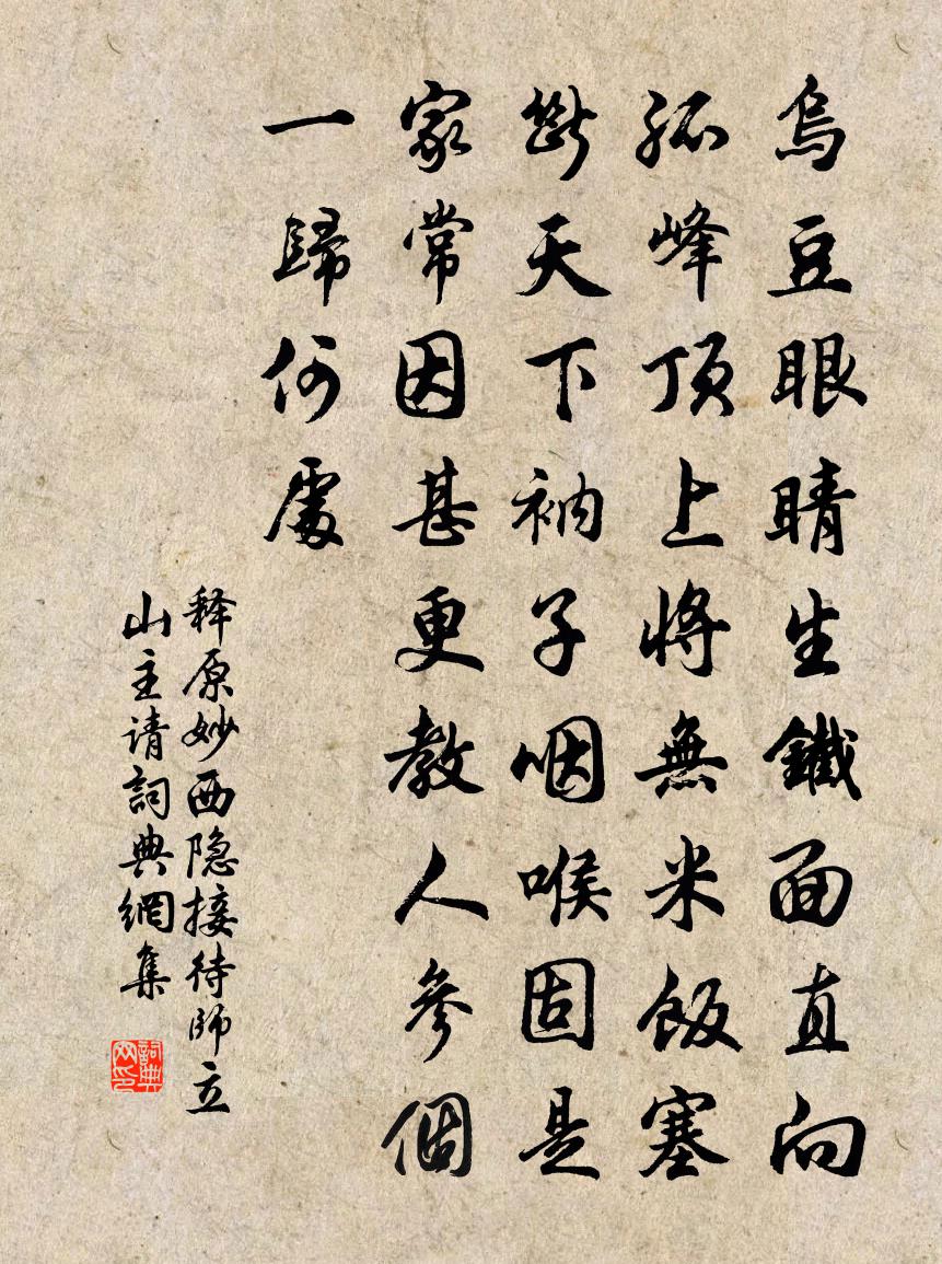 詩詞名句歷史字典書法欣賞書法字典國語詞典說文解字康熙字典古漢語字典標 題 作 者 詩 句 西隱接待師立山主請作者:釋原妙 朝代:宋代西隱接待師立山主請原文烏豆眼睛生鐵面,直向孤峰頂上。將無米飯塞斷天下衲子咽喉,固是家常,因甚更教人參個一歸何處。詩詞問答問:西隱接待師立山主請的作者是誰?答:釋原妙問:西隱接待師立山主請寫於哪個朝代?答:宋代釋原妙西隱接待師立山主請書法欣賞西隱接待師立山主請書法作品詩詞推薦送韋邕少府歸鐘山李嘉祐〔唐代〕祈門官罷後,負笈向桃源。萬卷長開帙,千峰不閉門。綠楊垂野渡,黃鳥傍山村。念爾能高枕,丹墀會一論。武昌松風閣黃庭堅〔宋代〕依山築閣見平川,夜闌箕斗插屋椽。我來名之意適然。老松魁梧數百年,斧斤所赦今參天。風鳴媧皇五十弦,洗耳次韻張龍使君十絕黎廷瑞〔宋代〕塵里一籠天地窄,樓頭萬幅水雲寬。何當化作千年鶴,卻伴遼東管幼安。菖蒲歌謝枋得〔宋代〕有石奇峭天琢成,有草夭夭冬夏青。人言菖蒲非一種,上品九節通仙靈。異根不帶塵埃氣,孤操愛結泉石盟。明窗開元夜遊圖周邦彥〔宋代〕潞州別駕年十八,彎弓射鹿無虛發。真龍絕水魚鱉散,參軍後騎鳧鷗沒。鹹原瑞氣映壺關,城南書生知阿瞞。解鞍皇雅十首《帝制》五章尹洙〔宋代〕帝制萬邦,罔有弗賓。蠻夷戎狄,羈而勿臣。威格三方,稽顙獻珍。單于革心,願交使人。初涼與次公子共讀書冊楊萬里〔宋代〕暑嬾皈投簟,涼醒打當書。罷吟唇欲裂,起坐膝難舒。汲古微瀾動,悲秋小雨余。五言未針線,百過且階除。導引佚名〔宋代〕穆清沖境,金闕秘寥陽。二後侍虛皇。真人恭默欽先烈,肖象啟琳房。巋然神物護靈光。玉色粹逾彰。虎旌龍節輝游熙六年端午帖子詞皇后合五首崔敦詩〔宋代〕瑞麥登時物,香蒲薦壽祺。珠囊新樣小,蹙就葛覃詩。聞李六景儉自河東令授唐鄧行軍司馬以詩賀之白居易〔唐代〕誰能淮上靜風波?聞道河東應此科。不獨文詞供奏記,定將談笑解兵戈。泥埋劍戟終難久,水借蛟龍可在多?四十山行見月作趙蕃〔宋代〕意行何之,陟此雲嶺。如夢而覺,如昏而醒。紀事(八首選一)黃遵憲〔清代〕眾人耳目外,重以甘言誘;濃綠茁芽茶,淺碧釀花酒。斜紋黑普羅,雜俎紅氈竓,瑣屑到釵釧,取足供媚婦。上謁成伯家宴造坐無由輒欲效顰而酒已盡入夜不欲蘇軾〔宋代〕道士令嚴難繼和,僧伽帽小卻空回。隔籬不喚鄰翁飲,抱瓮須防吏部來。題王欽州子澤雙清閣曾豐〔宋代〕馬蹏車轍前門外,江聲山色後堂背。左手持盤右把杯,家人怪問翁何在。小閣崢嶸負後堂,圖書左右翁中央。一塵春殘歸思方回〔宋代〕春殘江水匝江城,尚憶初來雪未晴。果菜芳辛頻代謝,禽魚孕育各生成。晝長獨坐拍棋子,夜靜不眠欹柝聲。南望姚源憶故人馬鈺〔元代〕悟來頓覺從前錯。怎敢起心生惡。斡運蓬萊銀廓。個內如抬掇。無中嬰奼憑媒妁。須用黃婆為謔。和會出離瓊槨。驀山溪(和人冬至韻)朱敦儒〔宋代〕西江東去,總是傷時淚。北陸日初長,對芳尊、多悲少喜。美人去後,花落幾春風,杯漫洗。人難醉。愁見飛灰細洛陽春吟邵雍〔宋代〕桃李花開人不窺,花時須是牡丹時。牡丹花發酒增價,夜半遊人猶未歸。將行陪貳車觀燈晁補之〔宋代〕行歌紅粉滿城歡,猶作常時五馬看。忽憶使君身是客,一時揮淚逐金鞍。吊屈原文柳宗元〔唐代〕 後先生蓋千祀兮,余再逐而浮湘。求先生之汨羅兮,攬蘅若以薦芳。願荒忽之顧懷兮,冀陳辭而有光。 先名句推薦青海陣雲匝,黑山兵氣沖。高適《塞下曲》 認得醉翁語,山色有無中蘇軾《水調歌頭·黃州快哉亭贈張偓佺》 情共天涯秋黯,朱橋鎖深巷。吳文英《解蹀躞·醉雲又兼醒雨》 日暮九疑何處?認舜祠叢竹。文廷式《好事近·湘舟有作》 墉集欺貓鼠,林藏逐雀鸇。徐威《中秋詠懷借杜子美秋日述懷一百韻和寄柳州假鳴桑先生》 探其懷,奪之威。主上用之,若電若雷。韓非及後人《韓非子·揚權》 雪岸叢梅發,春泥百草生。杜甫《陪裴使君登岳陽樓》 權者,人莫離也。來俊臣《羅織經·控權卷第四》 萬里想龍沙,泣孤臣吳越張元乾《石州慢·己酉秋吳興舟中作》 客里看春多草草,總被詩愁分了張炎《清平樂·采芳人杳》