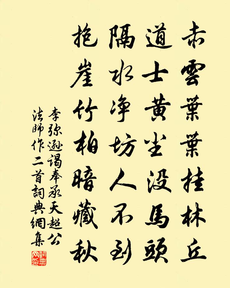 詩詞名句歷史字典書法欣賞書法字典國語詞典說文解字康熙字典古漢語字典標 題 作 者 詩 句 謁奉承天超公法師作二首作者:李彌遜 朝代:宋代謁奉承天超公法師作二首原文赤雲葉葉掛林丘,道士黃塵沒馬頭。隔水淨坊人不到,抱崖竹柏暗藏秋。詩詞問答問:謁奉承天超公法師作二首的作者是誰?答:李彌遜問:謁奉承天超公法師作二首寫於哪個朝代?答:宋代李彌遜謁奉承天超公法師作二首書法欣賞謁奉承天超公法師作二首書法作品詩詞推薦客舍月下對酒,醉後寄畢四耀獨孤及〔唐代〕鄉路風雪深,生事憂患迫。天長波瀾廣,高舉無六翮。獨立寒夜移,幽境思彌積。霜月照膽淨,銀河入檐白。沽酒秋夜讀書示兒子陸游〔宋代〕久病少睡眠,往往中夕起,呼燈取書讀,不能盡數紙。喟然置之嘆,生世後闕里。持蠡欲測海,遽復迫老死。人生木芙蓉盛開四解宋祁〔宋代〕浩露津緗花,大風獵絳英。繁霜不可拒,慎勿愛空名。諸葛武侯王安石〔宋代〕慟哭楊顒為一言,餘風今日更誰傳。區區庸蜀支吳魏,不是虛心豈得賢。為王漕壽釋寶曇〔宋代〕十日西風便老成,挽回金氣愈高明。朱轓玉節非吾事,雪竹霜松不世情。未可買山歸卜築,卻須持橐慰平生。如公張南溟山長相邀紫極宮西雪樓登高姚南榿言北趙文〔宋代〕寫韻亭高樓更高,百年登覽著吾曹。客和月日成三九,我與鯤鵬共一毫。山吐南雲飛砲石,江橫西雪涌波濤。黃花豫章行謝靈運〔南北朝〕短生旅長世。恆覺白日欹。覽鏡睨頹容。華顏豈久期。茍無回戈術。坐觀落崦嵫。春日絕句陸游〔宋代〕桃李吹成九陌麈,客中又過一年春。余寒漠漠城南路,只見鞦韆不見人。綠鬢徐夤〔唐代〕綠鬢先生自出林,孟光同樂野雲深。躬耕為食古人操,非織不衣賢者心。眼眾豈能分瑞璧,舌多須信爍良金。君看寄周文顯二首趙蕃〔宋代〕我敬周夫子,安貧得士常。眇然居陋巷,隱若臥襄陽。應對昔為役,滯濡今阻方。雖慚壽陵步,猶擬舊君傍。贈嗣持上人張鎡〔宋代〕持也眈眈老比邱,吾如松澗瀑春流。經年俗見渾無便,連日相逢若舊遊。柏子軒窗翻梵夾,荷香亭上款茶甌。真成二月三十日作吳則禮〔宋代〕鵓鴣端復喚雨來,韻此朱朱兼白白。試問游梁余幾錢,今朝且作官寒食。宿州張耒〔宋代〕野雲不作雪,仲冬氣猶蒸。岸雨濕枯柳,北風生浪聲。昨日飲我者,主人出金觥。酒薄亦足醉,青蛾慣逢迎。紛紛浪淘沙·楊花李雯〔清代〕金縷曉風殘,素雪晴翻,為誰飛上玉雕闌?可惜章台新雨後,踏入沙間。沾惹忒無端,青鳥空銜,一春幽夢綠萍間即事四首劉克莊〔宋代〕牆角新開白版扉,時尋樵牧弄煙霏。代耕豈若收躬稼,賜帛可如出自機。湖海浪遊今已倦,山林獨往未全非。百年興龍節日渡江懷寄二友弟兼示同行賀鑄〔宋代〕燕庭冠佩拜爐香,丸劍紛紛想定場。江上烹魚猶得信,座中驚雁已離行。澆愁酩酊一樽酒,破睡咿啞兩櫓床。不特送祝熙載宋祁〔宋代〕昔誓繻仍在,今行綬已新。春鶯得遷友,夜鶴怨歸人。倦枕低潮月,征帆截渚蘋。清時偏樂職,寒鱉佐吳醇。胡定齋惠墨求詩儲泳〔宋代〕萬杵玄霜玉兔魂,度窗蜂影去來忙。自從野菜花開後,一月熏爐不炷香。訓世孝弟詩十一首邵雍〔宋代〕每日清晨一炷香,謝天謝地謝三光。所求處處田禾熱,惟願人人壽命長。國有賢臣安社稷,家無逆子惱爹娘。四方山陰陳跡蘇軾〔宋代〕當年不識此清真,強把先生擬季倫。等是人間一陳跡,聚蚊金谷本何人。名句推薦內官初賜清明火,上相閒分白打錢。韋莊《長安清明》 天下者非一人之天下,唯有道者處之。姜子牙《六韜·武韜·順啟》 正是霜風飄斷處,寒鷗驚起一雙雙。陸龜蒙《冬柳》 蠟炬風搖簾不下,竹影半牆如畫。項鴻祚《清平樂·池上納涼》 近來攀折苦,應為別離多王之渙《送別》 小兒呼叫走長街,雲有痴呆召人買。范成大《賣痴呆詞》 宰相必起於州部,猛將必發於卒伍。韓非及後人《韓非子·顯學》 月黑雁飛高,單于夜遁逃。盧綸《和張僕射塞下曲·其三》 一去二三里,煙村四五家。邵雍《山村詠懷》 燕子不來花又老,一春瘦的腰兒小。施耐庵《蝶戀花·一別家山音信杳》
