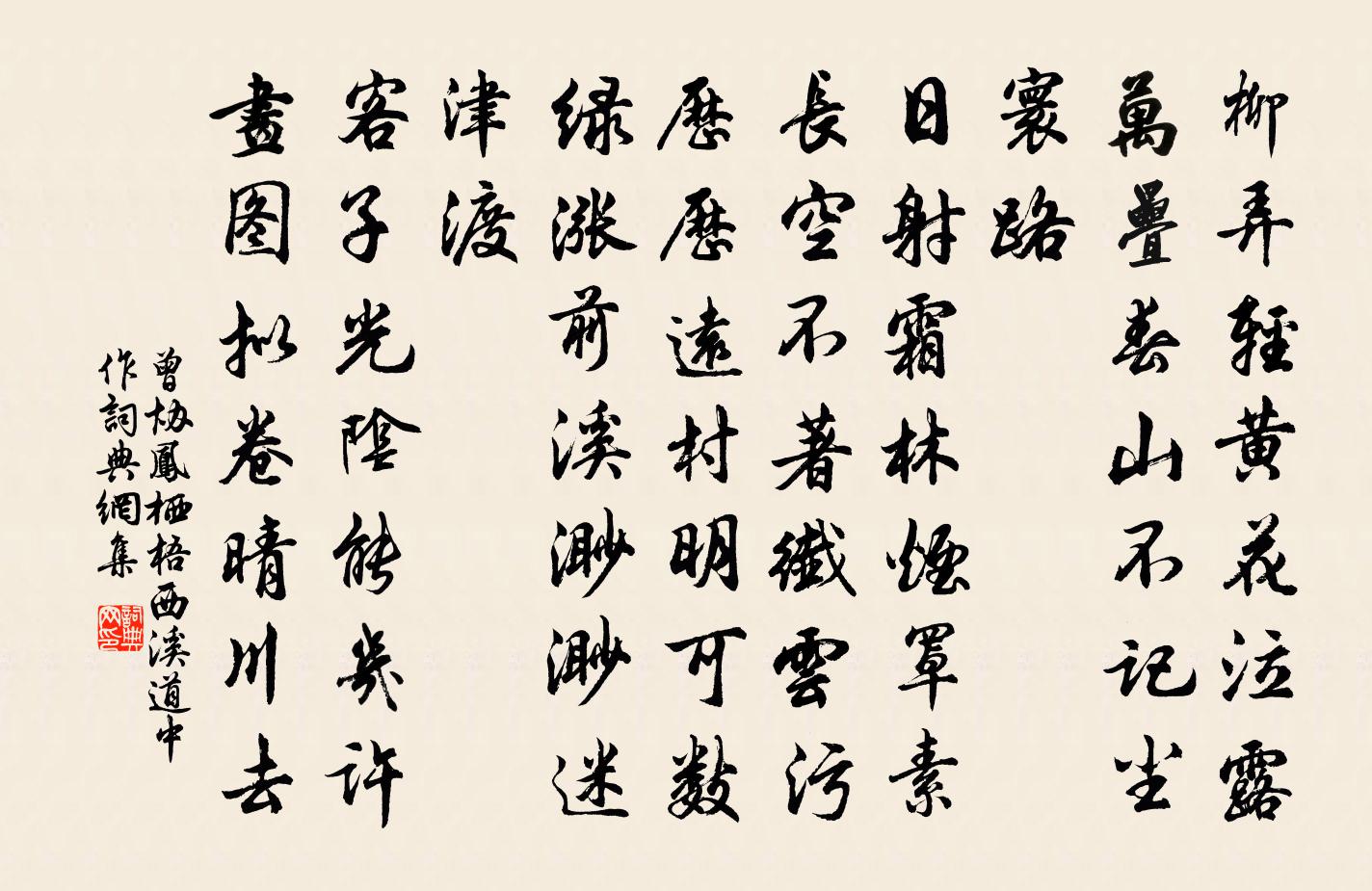 詩詞名句歷史字典書法欣賞書法字典國語詞典說文解字康熙字典古漢語字典標 題 作 者 詩 句 鳳棲梧(西溪道中作)作者:曾協 朝代:宋代鳳棲梧(西溪道中作)原文柳弄輕黃花泣露。萬疊春山,不記塵寰路。日射霜林煙罩素。長空不著纖雲污。歷歷遠村明可數。綠漲前溪,渺渺迷津渡。客子光陰能幾許。畫圖擬卷晴川去。詩詞問答問:鳳棲梧(西溪道中作)的作者是誰?答:曾協問:鳳棲梧(西溪道中作)寫於哪個朝代?答:宋代問:鳳棲梧(西溪道中作)是什麼體裁?答:詞曾協鳳棲梧(西溪道中作)書法欣賞鳳棲梧(西溪道中作)書法作品詩詞推薦游問政山次韻郡侯康慶之方回〔宋代〕住山應是勝游山,矧此仙區異俗寰。幾度出城行十里,何時築屋就三間。化猿君子高難問,射虎將軍老合閒。只慮國清寺泉時有綠蟾蹲崖石西高似孫〔宋代〕崖腰溜清水,素光搖玉宇。其陰透碧海,有石如砥柱。心知老龍都,直入蓬萊府。仙雲盪涼潤,積雪明深乾。陰陽酬夢得見喜疾瘳白居易〔唐代〕暖臥摩綿褥,寒傾藥酒螺。昏昏布裘底,病醉睡相和。末疾徒云爾,餘年有幾何?[傳云:風淫末疾。末謂四肢。項城主簿趙賦求書惹雲亭為系二絕李復〔宋代〕東西飄忽本無心,留礙危檐便不禁。向晚前山風力薄,等閒相引作輕陰。梅陸游〔宋代〕若耶溪頭春意慳,梅花獨秀愁空山。逢時決非桃李輩,得道自保冰雪顏。僊去要令天下惜,折來聊伴放翁閒。人中偈頌一百零二首釋紹曇〔宋代〕拽杖出煙霞,紅塵去路賒。淡金垂柳線,寒玉點梅花。觸目分群象,當機裂萬差。豈不見太原孚上座,樓頭吹畫角送司空曙之蘇州苗發〔唐代〕盤門吳舊地,蟬盡草秋時。歸國人皆久,移家君獨遲。廣陵經水宿,建鄴有僧期。若到西霞寺,應看江總碑。送僧歸日本錢起〔唐代〕上國隨緣住,來途若夢行。浮天滄海遠,去世法舟輕。水月通禪觀,魚龍聽梵聲。惟憐一燈影,萬里眼中明。題畫四首唐寅〔明代〕野店桃花萬樹低,春光多在畫橋西。幽人自得尋芳興,馬背詩成路欲迷。記雪三首張鎡〔宋代〕清曉疎籬尚露根,飯余俄復擁柴門。南湖水色君知否,萬斛鵝黃貯玉盆。即席次君禮年兄韻秦觀〔宋代〕情舒喜面山浮翠,袖滿薰風涼透時。萍碎錦鱗金網舉,影差簾燕玉鉤垂。輕輕篆鼎凝香細,款款方壼轉漏遲。清興石船澗陳岩〔宋代〕不怕掀天浪拍春,石船系在古溪濱。縱然水繞東流岸,猶勝虛舟誤觸人。月岩陳宓〔宋代〕常時百步馬先疲,今日岩前故不遲。回首兔宮猶未遠,會須千里巧相隨。遂寧家知府生日魏了翁〔宋代〕相去無多五日間,兩家牛酒賀生賢。二陽引類臨爻長,三壽為朋泰茹連。析木旁瞻星兩兩,大椿遙祝歲千千。相期依韻奉和司徒侍中元宵席上強至〔宋代〕席上香風轉綺羅,北門東道漢蕭何。燈搖萬井年光嫩,月覆千閭夜色多。樓閣影重占物阜,管弦聲洽驗民和。相公留遠亭文天祥〔宋代〕甘心賣國罪滔天,酒後猖狂詐作顛。把酒逢迎酋虜笑,從頭罵坐數時賢。落得稱呼浪子劉,樽前百媚佞旃裘。當年晨起觀雪趙蕃〔宋代〕荒雞號何多,鄰犬吠愈悍。初迷紙窗隙,旋失布衾暖。呼童戶先啟,走報雪且滿。為言果羞明,若爾真待伴。須臾點絳唇·波上清風魏夫人〔宋代〕波上清風,畫船明月人歸後,漸消殘酒。獨自憑闌久。聚散匆匆,此恨年年有,重回首。淡煙疏柳。隱隱蕪城漏。人日林滋〔唐代〕春輝新入碧煙開,芳院初將穆景來。共向花前圖瑞勝,試看池上動輕苔。林香半落沾羅幌。蕙色微含近酒杯。聞道答陸務觀佛祖道院之戲楊萬里〔宋代〕老禪分得破叢林,薄供微齋也不曾。道院敕差權院事,筠庵身是住庵僧。人間赤日方如火,松下清風獨似冰。別有名句推薦天外鳳凰誰得髓?無人解合續弦膠。杜牧《讀韓杜集》 濤瀾洶湧,風雲開闔。蘇轍《黃州快哉亭記》 白下有山皆繞郭,清明無客不思家。高啟《清明呈館中諸公》 斟酌乎質文之間,而隱括乎雅俗之際,可與言通變矣。劉勰《文心雕龍·通變》 望望不見君,連山起煙霧。李白《金鄉送韋八之西京》 財以成者,扶而埋之;後得生者,而久禁之。墨子《墨子·22章 節用(下)》 但存方寸地,留與子孫耕。馮夢龍《喻世明言·卷二十二》 士君子立言,貴平正,尤貴精詳。王永彬《圍爐夜話·第二五則》 孤雲與歸鳥,千里片時間。馬戴《落日悵望》 父母之年,不可不知也。一則以喜,一則以懼。孔子弟子《論語·里仁篇》