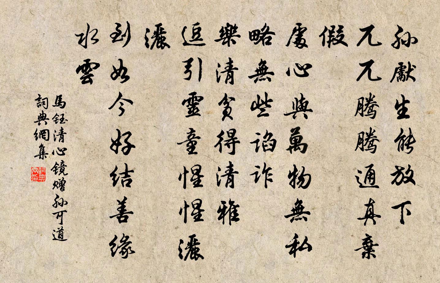 詩詞名句歷史字典書法欣賞書法字典國語詞典說文解字康熙字典古漢語字典標 題 作 者 詩 句 清心鏡 贈孫可道作者:馬鈺 朝代:元代清心鏡 贈孫可道原文孫先生,能放下。兀兀騰騰,通真棄假。處心與、萬物無私,略無些諂詐。樂清貧,得清雅。逗引靈童,惺惺灑灑。到如今、好結善緣,水雲詩詞問答問:清心鏡 贈孫可道的作者是誰?答:馬鈺問:清心鏡 贈孫可道寫於哪個朝代?答:元代問:清心鏡 贈孫可道是什麼體裁?答:詞馬鈺清心鏡 贈孫可道書法欣賞清心鏡 贈孫可道書法作品詩詞推薦秘閣儒榮堂程珌〔宋代〕天狼騰騰照單于,怒麛抗岳於上都。松漠城高沙萬里,其下穹廬育此胡。皇仁配天覆中宇,西垂北際香無區。七十送吳子隆節推之官信州五首陳造〔宋代〕連城照乘動分珍,他日詞壇著散人。詩筆有神官有暇,楚鱗燕翼要頻頻。墨竹石延年〔宋代〕昭陽雨過籠斜日,長信風來掃落花。無限春情與春恨,幾條分在后妃家。恨春遲歐陽修〔宋代〕欲借江梅薦飲。望隴驛、音息沈沈。住在柳州東,彼此相思,夢回雲去難尋。歸燕來時花期浸。淡月墜、將曉還陰乍歸九首劉克莊〔宋代〕手種梅無恙,蒼苔滿樹身。可憐開較早,不待遠歸人。大庾驛有懷蔣吉〔唐代〕一囊書重百餘斤,郵吏寧知去計貧。莫訝偏吟望鄉句,明朝便見嶺南人。漁歌子周巽〔元代〕負薪行唱路迢迢。幾朵梅花擔上挑。風正緊,雪初飄。曲中猶自憶前題金陵陸仁〔元代〕麗正門當天闕高,景陽台下草蕭蕭。江圍大地蟠三楚,石偃孤城見六朝。落日不將遺恨去,秋風能使旅魂消。忘情頌古四十八首釋慧開〔宋代〕鐵枷無孔要人擔,累及兒孫不等閒。欲得撐門並拄戶,更須赤腳上刀山。招韜光禪師(見鹹淳臨安志)白居易〔唐代〕白屋炊香飯,葷膻不入家。濾泉澄葛粉,洗手摘藤花。青芥除黃葉,紅姜帶紫芽。命師相伴食,齋罷一甌茶。送趙評事攝御史監軍嶺南孫逖〔唐代〕議獄持邦典,臨戎假憲威。風從閶闔去,霜入洞庭飛。篁竹迎金鼓,樓船引繡衣。明年拜真月,南斗使星歸。幽窗陳與義〔宋代〕貧士窗工用短,窗壯夫溺於窗詩。破壁窗為幽窗,我筆還得持。高鳥度遺影,風扉語移時。迨我休暇日,與物聊同送超上人歸天台(一作送天台道士)孟郊〔唐代〕天台山最高,動躡赤城霞。何以靜雙目,掃山除妄花。何以潔其性,濾泉去泥沙。靈境物皆直,萬松無一斜。月中夜聞訓狐方回〔宋代〕十載離鄉邑,言歸理舊鋤。僅憐空宅在,半駭近鄰無。古廟叢枯木,寒宵吠訓狐。兵余有乖氣,春色亦荒蕪。頌古三十六首釋惟一〔宋代〕不落宮商太古音,無勞弦上發清聲。高山流水有餘意,除卻子期誰解聽。歸美堂李新〔宋代〕妙齡通籍金閨里,三媺垂輝分鼎趾。君恩至重論報難,炯炯臣心罄歸美。太山深根蟠厚地,嵩華連鰲隆國址。黃河歸桐廬舊居寄嚴長史章八元〔唐代〕昨辭夫子棹歸舟,家在桐廬憶舊丘。三月暖時花競發,兩溪分處水爭流。近聞江老傳鄉語,遙見家山減旅愁。或在十月梅/十月桃佚名〔宋代〕千林凋盡,一陽未報,已綻南枝。獨對霜天,冒寒先占花期。清香映月浮動,臨淺水、疏影斜敧。孤標不似,綠李善謔驛淳于髠墓上有木斜出口占項安世〔宋代〕秦人磨斧闖山東,七澤青邱入夢中。齊楚君臣正行樂,辟宮除道送金籠。閒吟初冬真山民〔宋代〕一架琴書一筆床,杜門荏苒送年光。囊空儘可償詩債,腳倦猶能入醉鄉。即老菊花偏耐久,未開梅蕊已先香。眼邊名句推薦拆桐花爛熳,乍疏雨、洗清明。柳永《木蘭花慢·拆桐花爛熳》 擬把傷離情緒,待曉寒重說。納蘭性德《好事近·簾外五更風》 自是相思抽不盡,卻教風雨怨秋聲。鄭燮《詠芭蕉》 舍南舍北皆春水,但見群鷗日日來。杜甫《客至》 鴻雁在雲魚在水。惆悵此情難寄。晏殊《清平樂·紅箋小字》 夜雪初霽,薺麥彌望。姜夔《揚州慢·淮左名都》 桂林之一枝,崑山之片玉。房玄齡《晉書·列傳·第二十二章》 青衫匹馬萬人呼,幕府當年急急符。辛棄疾《送湖南部曲》 心生,種種魔生;心滅,種種魔滅。吳承恩《西遊記·第十三回》 樹頭幽鳥,對調新語,語罷雙飛卻。顧德輝《青玉案·春寒惻惻春陰薄》