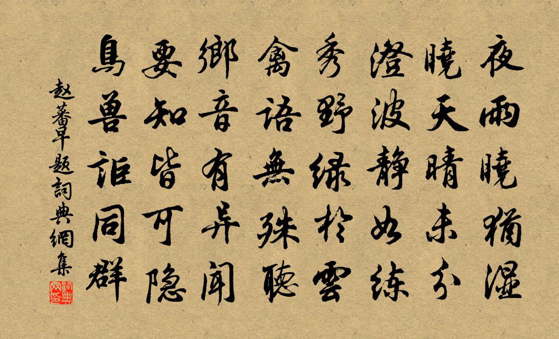 詩詞名句歷史字典書法欣賞書法字典國語詞典說文解字康熙字典古漢語字典標 題 作 者 詩 句 早題作者:趙蕃 朝代:宋代早題原文夜雨曉猶濕,曉天晴未分。澄波靜如練,秀野綠於雲。禽語無殊聽,鄉音有異聞。要知皆可隱,鳥獸詎同群。詩詞問答問:早題的作者是誰?答:趙蕃問:早題寫於哪個朝代?答:宋代趙蕃早題書法欣賞早題書法作品詩詞推薦丁酉重九藥市呈坐客范成大〔宋代〕莫向登臨怨落暉,自緣羈宦阻歸期。年來厭把三邊酒,此去休喔萬里詩。烏帽不辭欹短髮,黃花終是欠東籬。若無水龍吟(和韻)李曾伯〔宋代〕荊州咫尺神州,幾番得失孫劉手。山河天險,東南牖戶,鉞何輕授。淚落碑存,鶴歸城是,不堪回首。喜大堤草色效白樂天體自詠二十韻蔡戡〔宋代〕人生七十稀,我今六十六。幼小承門資,長大竊科目。平步登瀛洲,超遷應郎宿。省寺久徊翔,京華厭馳逐。七持歡喜吟邵雍〔宋代〕歡喜又歡喜,喜歡更喜歡。吉士為我友,好景為我觀。美酒為我飲,美食為我餐。此身生長老,盡在太平間。桃源憶故人趙子發〔宋代〕芳菲已有東風露。寒著輕羅未去。午夜鸞車鶴馭。散入千蓮步。粉香度曲嬉遊女。草草相逢無據。腸斷淚零無數。別灊皖二山王安石〔宋代〕鄉壘新恩借舊朱,欲辭灊皖更躊躕。攢峰列岫應譏我,飽食窮年報禮虛。偈頌一百三十六首釋惟一〔宋代〕秋雨乍晴,秋天如洗。九日菊花新,千林黃葉墜。人人只知驟步登高,往往蹉過自家穩密田地。切忌,切忌。楊柳元好問〔金代〕楊柳青青溝水流,鶯兒調舌弄嬌柔。桃花記得題詩客,斜倚春風笑不休。 明堂觀禮雜詠十三首觀景靈宮恭謝王同祖〔宋代〕膳羞進徹靜無嘩,宰執齋宮坐賜花。不比常朝添覆奏,報來除目十餘家。【中呂】仙客張可久〔元代〕春思魚尾釵,風頭鞋,花邊美人安在哉?煙冷寶爐香,塵昏玉鏡台。燕子歸來,月淡朱簾外。括山道中雲冉冉,草龍興客旅效子美寓居同谷七歌李新〔宋代〕殞我父天悲入骨,更有諸昆寄吳越。拊膺灑血欲長號,畏傷孀母輒不發。罪逆自合當刑誅,神譴人怒豈汝忽。嗚呼次韻陳殿丞除夜感懷李覯〔宋代〕浮世因循過。流年次第新,回思舊來事,都似夢中人。不飲偏嫌雪,多愁卻怕春。星魁欲寅位,五鼓莫頻頻。題崇聖寺許渾〔唐代〕西林本行殿,池榭日坡阤。雨過水初漲,雲開山漸多。曉街垂御柳,秋院閉宮莎。借問龍歸處,鼎湖空碧波。重九才四日爾風雨如此病臥殊亡聊小兒輩取酒趙蕃〔宋代〕久不觀陶詩,仿佛如前生。忽此迫重九,意是渠所我。我方臥病中,齋居忘昏明。不知檐雨落,但覺奔濤聲。兩兒獨鶴衛宗武〔宋代〕獨鶴來有年,置彼三徑曲。挈至此靖廬,幽絕山林屋。戛然髮長唳,清亮振虛谷。炳炳千歲丹,不受烏兔促。乘之送晦庵南歸尤袤〔宋代〕二年摩手撫瘡痍,恩與廬山五老齊。合侍玉皇香案側,卻持華節大江西。鼎新白鹿諸生學,築就長虹萬丈堤。待哺平原郡王南園詩二十一首豁望姜特立〔宋代〕高亭四望與天開,乘興登臨亦快哉。胸次如公無滯念,時時只合眺崔嵬。南歌子(時方自僉廳會議催科,事罷即作此游)姚述堯〔宋代〕誤入紅蓮幕,來依玉樹叢。也將塵跡寄東風。忙裡偷閒同到、此山中。迥野韶華麗,晴嵐秀色鍾。憑高凝望倦扶筇通真觀施樞〔宋代〕不到凝安二十年,丹青一幅尚依然。青牛已去仙蹤遠,卻有山禽下玉田。接梅李龍高〔宋代〕中條隱士裂唐麻,角里先生就漢車。一種寒酸真本色,羞將槁淡博繁華。名句推薦江南無所有,聊贈一枝春。陸凱《贈范曄詩》 十有九人堪白眼,百無—用是書生。黃景仁《雜感》 衣冠未必皆男子,巾幗如何定婦人?馮夢龍《醒世恆言·卷十》 江上往來人,但愛鱸魚美范仲淹《江上漁者》 不鳴則已,一鳴驚人。司馬遷《滑稽列傳》 凡與敵戰,必須料敵詳審而後出兵。佚名《百戰奇略·第五卷·輕戰》 蓮朝開而暮合,至不能合,則將落矣王永彬《圍爐夜話·第六九則》 博學之,審問之,慎思之,明辨之,篤行之。子思《中庸·第二十章》 一日官軍收海服,驅牛駕車食牛肉,歸來攸得牛兩角。元稹《田家詞 / 田家行》 當關不報侵晨客,新得佳人字莫愁。李商隱《富平少侯》