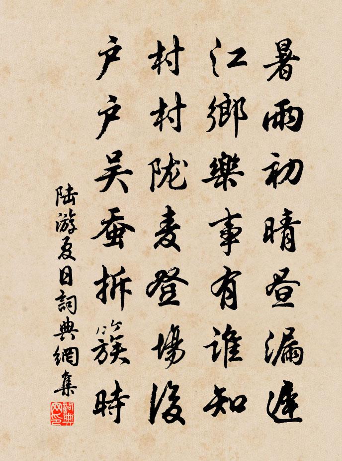 詩詞名句歷史字典書法欣賞書法字典國語詞典說文解字康熙字典古漢語字典標 題 作 者 詩 句 夏日作者:陸游 朝代:宋代夏日原文暑雨初晴晝漏遲,江鄉樂事有誰知?村村隴麥登場後,戶戶吳蠶拆簇時。詩詞問答問:夏日的作者是誰?答:陸游問:夏日寫於哪個朝代?答:宋代問:陸游的名句有哪些?答:陸游名句大全陸游夏日書法欣賞夏日書法作品詩詞推薦與江梅景德夜歸韓維〔宋代〕吾交陳與謝,屢結東城游。春宵燈火繁,躍馬此道周。懷人邈可遠,念歲忽以遒。況自抱私感,歸來清淚流。睹軍回戈韋莊〔唐代〕關中群盜已心離,關外猶聞羽檄飛。御苑綠莎嘶戰馬,禁城寒月搗征衣。漫教韓信兵塗地,不及劉琨嘯解圍。昨日陳臨春閣孫元晏〔唐代〕臨春高閣上侵雲,風起香飄數里聞。自是君王正沈醉,豈知訊息報隋軍。句王子俊〔宋代〕沙鷗背人去。高郵野望二首楊萬里〔宋代〕江南十里九青山,江北無山只野田。更遣野田無遠樹,郭熙盡巧若為傳。偈頌十五首釋寶印〔宋代〕六月初一,燒空赤日。十字街頭,雪深一尺。掃除不暇,迴避不及。凍得東村廖鬍子,半夜著鞋水上立。依韻和子聰夜雨梅堯臣〔宋代〕窗燈光更迥,宿霧晦層檐。寒氣微生席,輕風欲度簾。濕螢依草沒,暗溜想池添。況值相如渴,無嫌魯酒甜。啄木齊己〔唐代〕啄木啄啄,鳴林響壑。貪心既緣,利嘴斯鑿。有朽百尺,微蟲斯宅。以啄去害,啄更彌劇。層崖豫章,聳乾蒼蒼。偈釋如本〔宋代〕李四有錢不解飲,張三解飲又無錢。相招豐樂樓中看,不怕寒威雪滿天。朝中措(賀益齊仿嗣娶婦)趙必〔宋代〕鳳凰台上聽 * 。銀燭萬紅搖。要覓瓊漿玉飲,隔牆便是藍橋。大兒清徹,小喬初嫁,雨膩雲嬌。愁怕沈郎銷瘦,蠟梅唐仲友〔宋代〕凌寒不獨早梅芳,玉艷更為一樣妝。懶著霓裳貪野服,自然仙骨有天香。輕明最是宜風日,冷淡從來傲雪霜。欲識和李士舉陪提刑徽猷游中梁山臨秀遠軒以望江王之望〔宋代〕京口追游地,錢塘執別年。飄流恍如夢,聚散豈其天。夙駕行趨詔,當朝正急賢。紫荷持從橐,去去入林泉。寄兄弟(又見《許渾集》,題作寄小弟)杜牧〔唐代〕江城紅葉盡,旅思倍淒涼。孤夢家山遠,獨眠秋夜長。道存空倚命,身賤未歸鄉。南望仍垂淚,天邊雁一行。賤和一諸友有祝頌語以五十六字謝之陳文蔚〔宋代〕庸庸不作世間奇,空負生成造化機。歲月漫驚多發積,功程殊未進毫微。不貪腰下懸金印,且自尊前戲彩衣。多謝瑞鶴仙(勸酒)史浩〔宋代〕瑞煙籠繡幕。正玳席歡燕,觥籌交錯。高情動寥廓。恣清談雄辯,珠璣頻落。鏘鏘妙樂。且贏取、昇平快樂。又何石城寺滕宗諒〔宋代〕山勢如城繞楚宮,幾人登賞我心同。溪雲去作人間雨,澗水來生坐上風。蓮葉李群玉〔唐代〕根是泥中玉,心承露下珠。在君塘下種,埋沒任春浦。石鐘山喻良能〔宋代〕坡翁文字妙來今,仙去遺蹤杳莫尋。惟有石鐘還好在,未須霜降自清音。偈頌四十二首釋祖先〔宋代〕節屆書雲,陰極陽升。冰河發焰,枯木抽英。惟有拄杖子,依舊黑輪皴。不遷不變,無辱無榮。笑殺當年面壁人。絕葷宋祁〔宋代〕多年臥病厭腥{左月右婁},香飯初依竺國流。宣父蒲葅真可學,鍾岏蚶蠣更無求。爐銷午篆天花泊,幾隱宵燈偈名句推薦敵之大,無過不知;禍之烈,友敵為甚。來俊臣《羅織經·制敵卷第五》 野水參差落漲痕,疏林欹倒出霜根。蘇軾《書李世南所畫秋景二首》 道狹草木長,夕露沾我衣。陶淵明《歸園田居·其三》 樂遊原上清秋節,鹹陽古道音塵絕。李白《憶秦娥·簫聲咽》 倚高寒、愁生故國,氣吞驕虜。張元乾《賀新郎·寄李伯紀丞相》 不愁屋漏床床濕,且喜溪流岸岸深曾幾《蘇秀道中》 涼月如眉掛柳灣,越中山色鏡中看。戴叔倫《蘭溪棹歌》 鶴髮垂肩尺許長,離家三十五端陽。殷堯藩《同州端午》 千里稻花應秀色,五更桐葉最佳音。曾幾《蘇秀道中》 想見廣寒宮殿,正雲梳風掠。辛棄疾《好事近·中秋席上和王路鈐》