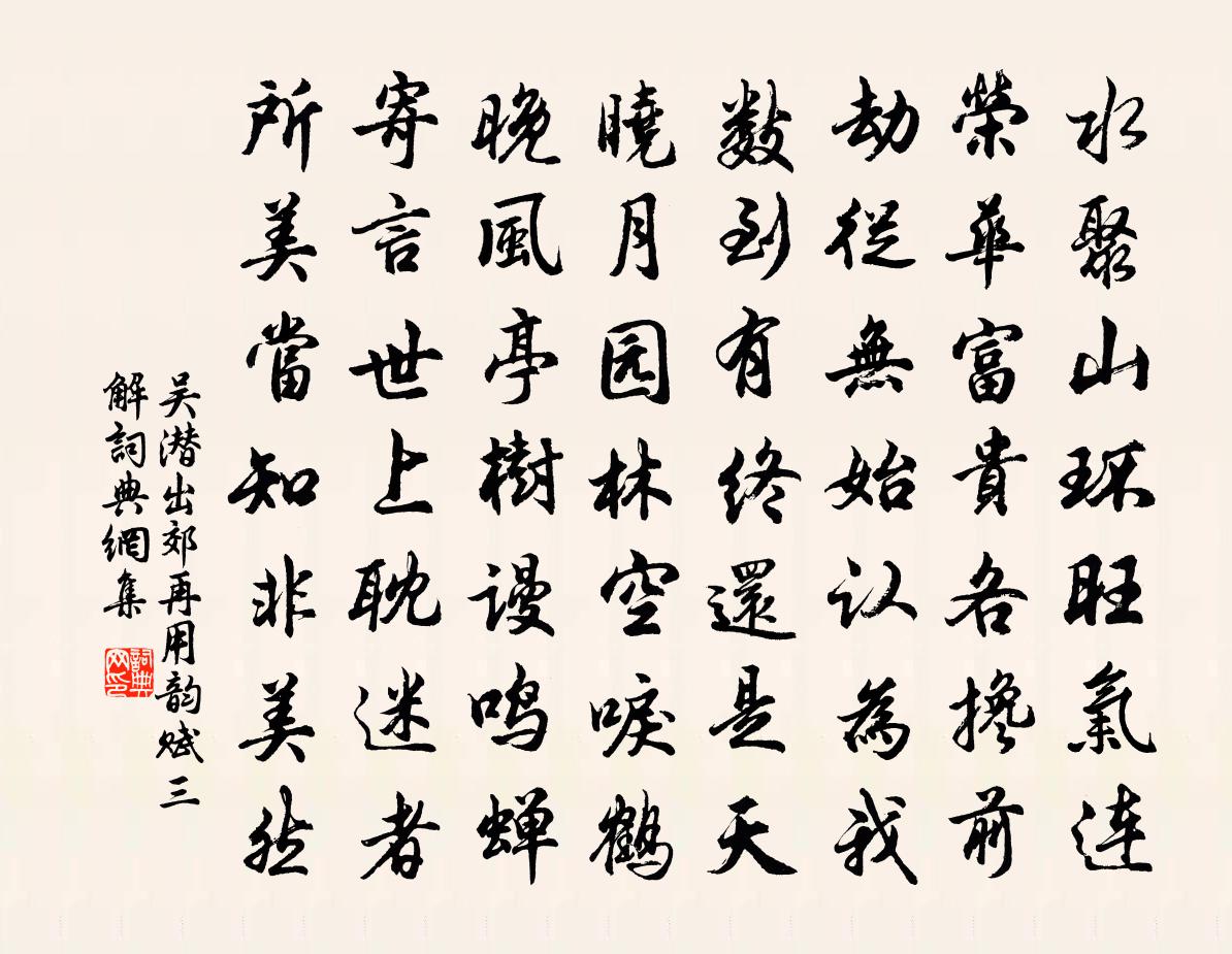 詩詞名句歷史字典書法欣賞書法字典國語詞典說文解字康熙字典古漢語字典標 題 作 者 詩 句 出郊再用韻賦三解作者:吳潛 朝代:宋代出郊再用韻賦三解原文水聚山環旺氣連,榮華富貴各攙前。劫從無始認為我,數到有終還是天。曉月園林空唳鶴,晚風亭樹謾鳴蟬。寄言世上耽迷者,所美當知非美然。詩詞問答問:出郊再用韻賦三解的作者是誰?答:吳潛問:出郊再用韻賦三解寫於哪個朝代?答:宋代問:吳潛的名句有哪些?答:吳潛名句大全吳潛出郊再用韻賦三解書法欣賞出郊再用韻賦三解書法作品詩詞推薦謝景濬卿東州名士未曾傾蓋因僧悟策有詩寄余馮時行〔宋代〕客唱凌天路,僧傳到野亭。人間聞譽處,句裹識儀形。學道荒文律,嬰愁鈍性靈。只如老瞽史,音節尚能聽。九日陰雨不止病中把酒示諸子三首蘇轍〔宋代〕庭菊兼黃白,村醪雜聖賢。微吟還自喜,不飲信徒然。陶亮貧非病,孟嘉醒亦顛。相看莫相夭,與爾各當年。送任御史江南發糧以賑河北百姓張說〔唐代〕河朔人無歲,荊南義廩開。將興泛舟役,必仗濟川才。夜月臨江浦,春雲歷楚台。調飢坐相望,繡服幾時回。舟過三游洞知遂脫兵火矣喜賦陽枋〔宋代〕萬里扁舟歸自東,干戈滿地路難通。弟兄一榻聊相對,叔侄雙頭未許同。峽入三游千太險,水連西蜀百憂空。家山鷓鴣天元好問〔金代〕枕上清風午夢殘。華胥東望海漫漫。湖山似要閒身管,花柳難將病眼看。三徑在,一枝安。小齋容膝有餘寬。鹿裘奉使契丹二十八首其五絕句二首之一蘇轍〔宋代〕亂山環合疑無路,小徑縈迴長傍溪。仿佛夢中尋蜀道,興州東谷鳳州西。三月十六日石湖書事三首范成大〔宋代〕春事日以闌,暑陰正清美。拖筇入林下,秀綠照衣袂。盧橘梅子黃,櫻桃桑椹紫。荷依浪花顫,筍破苔色起。風日晚春關中黃滔〔唐代〕忍歷通莊出,東風舞酒旗。百花無看處,三月到殘時。游塞聞兵起,還吳值歲飢。定唯荒寺里,坐與噪蟬期。清溪許希賢自號拙逸為賦四絕黎廷瑞〔宋代〕能言鸚鵡鎖金籠,夜夜家山桂子風。羨殺雙鳩有閒福,相呼相喚柳陰中。貞方翥〔宋代〕牛背穩如千斛舟,斜煙細雨任遨遊。春風草綠江南岸,不因人喚始回頭。南康天開圖畫樓劉過〔宋代〕樓外煙波渺去鴻,樓頭廬阜翠摩空。故知造物鋪張巧,不費丹青點染工。赤壁江山橫夜月,輞川庭館臥秋風。祗今送閻寀赴東川辟韋應物〔唐代〕冰炭俱可懷,孰雲熱與寒。何如結髮友,不得攜手歡。晨登嚴霜野,送子天一端。只承簡書命,俯仰豸角冠。上陟村校書劉克莊〔宋代〕短衣穿結半瓢空,所住茅檐僅蔽風。久誦經書皆默記,試挑史傳亦旁通。青燈窗下研孤學,白首山中聚小童。卻羨次韻分寧羅簿贈行二首王炎〔宋代〕已醜太常第,君家登兩翁。黃鵠久仙去,不亡有流風。小阮最逸群。未幾魚化龍。江城始解後,岩邑仍過從。謂予白菊三首司空圖〔唐代〕不疑陶令是狂生,作賦其如有定情。猶勝江南隱居士,詩魔終裊負孤名。自古詩人少顯榮,逃名何用更題名。詩中秋晚與許端甫山行顧逢〔宋代〕山行多妙處,妙在倚筇中。到此興難盡,吟成詩不同。松濤鳴絕壑,葉雨下晴空。鐘鼓雲邊寺,應知有路通。癸丑正月二日陸游〔宋代〕朱顏不老畫中人,綠酒追歡夢裡身。堪笑三山衰病叟,閉門寂寂過新春。蒼蒼吟邵雍〔宋代〕人人共戴天,我戴豈徒然。須識天人理,方知造化權。功名歸酒盞,器業入詩篇。料得閒中樂,無如我得全。浪淘沙(上元)謝逸〔宋代〕料峭小桃風。凝淡春容。寶燈山列半天中。麗服靚妝攜手處,笑語匆匆。酒滴小槽紅。一飲千鍾。銅荷擎燭絳紗籠臨江仙 對花懷洛陽舊遊元好問〔金代〕紫玉雙華相照映,錦兒仍是瓊兒。天邊誰與慰相思。洗妝無別物,只有斷腸詩。水北水南渾一夢,眼中紅袖烏絲。名句推薦致君堯舜上,再使風俗淳。杜甫《奉贈韋左丞丈二十二韻》 稻根科斗行如塊,田水今年一尺寬。范成大《夏日田園雜興》 為地戰者不能成王,為祿仕者不能成政劉向《說苑·君道》 玉皇開碧落,銀界失黃昏。毛滂《臨江仙·都城元夕》 爾來從軍天漢濱,南山曉雪玉嶙峋。陸游《金錯刀行》 笑指吾廬何處是?一池荷葉小橋橫。陳繼儒《浣溪沙·初夏夜飲歸》 惠子曰:子非魚,安知魚之樂?佚名《莊子與惠子游於濠梁》 又送王孫去,萋萋滿別情。白居易《草 / 賦得古原草送別》 歲歲金河復玉關,朝朝馬策與刀環。柳中庸《征人怨 / 征怨》 垓下美人泣楚歌,定陶美人泣楚舞,真龍亦鼠虎亦鼠。王象春《書項王廟壁》