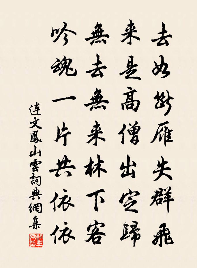 詩詞名句歷史字典書法欣賞書法字典國語詞典說文解字康熙字典古漢語字典標 題 作 者 詩 句 山雲作者:連文鳳 朝代:宋代山雲原文去如斷雁失群飛,來是高僧出定歸。無去無來林下客,吟魂一片共依依。詩詞問答問:山雲的作者是誰?答:連文鳳問:山雲寫於哪個朝代?答:宋代連文鳳山雲書法欣賞山雲書法作品詩詞推薦短褐鄭谷〔唐代〕閒披短褐杖山藤,頭不是僧心是僧。坐睡覺來清夜半,芭蕉影動道場燈。贈逸民詩 五蕭衍〔南北朝〕仁者博愛。大士兼撫。慈均春陽。澤若時雨。心忘分別。情無去取。等皆長養。同加嫗煦。譬流趨海。如子歸父。寄吳拾遺齊己〔唐代〕新竹將誰榷重輕,皎然評里見權衡。非無苦到難搜處,合有清垂不朽名。疏雨晚沖蓮葉響,亂蟬涼抱檜梢鳴。野橋送僧歸吳司馬光〔宋代〕高枕聊成夢,晴空忽見花。浮生儘是客,何處得為家。旅食帝城久,歸舟澤國賒。角因菰菜味,回首浩無涯。詠史下魏徵陳普〔宋代〕東宮無德倚儀刑,又似當年傅建成。可笑鄭公如百舌,春前夏後兩般聲。七夕前二日與窺堂莊使君江橫觀水望霓悵然蒲壽宬〔宋代〕倚闌人不識,懷古尚心驚。坐想瀰漫意,臥聞鞺鞳聲。浪翻京口寺,潮打石頭城。莫說南柯事,相寬老大情。【中呂】滿庭芳張弘范〔元代〕天風海濤,昔人曾此,酒聖詩豪。我到此閒登眺,日遠天高。山接水茫茫渺渺,水連天隱隱迢迢。供吟笑,功名事塞翁吟(大石)周邦彥〔宋代〕暗葉啼風雨,窗外曉色瓏璁。散水麝,小池東。亂一岸芙蓉。蘄州簟展雙紋浪,輕帳翠縷如空。夢念遠別、淚痕重次鄔文伯城南夜歸韻史彌寧〔宋代〕孤嶼清江落木天,十分詩思滿歸船。岩犀稛載香浮鼻,一味書窗惱夜眠。檀溪尋故人(一題作檀溪尋古)孟浩然〔唐代〕花伴成龍竹,池分躍馬溪。田園人不見,疑向洞中棲。韓耕道交八絕句韻見寄因和答之曹彥約〔宋代〕我句拙於妯女妝,尊前替戾敢承當。何人錯比羅敷艷,枉賦詩人陌上桑。寄友人陳瓘〔宋代〕行人征轡路西東,霜葉翩翩舞亂紅。曉色冥濛溪浸月,陰容黯澹馬嘶風。浮生信若萍隨浪,遠意徒驚鳥在籠。萬事謹次十七叔去鄭詩韻二章以寄家叔一章以自詠陳與義〔宋代〕蚍蜉堪笑亦堪憐,撼樹無功更怫然。賦就柳州聊解祟,詩成彭澤要歸田。身謀共悔蛇安居,理遣須看佛舉拳。懷祖弦歌堂王洋〔宋代〕曹務琴日以渾,琴令君心自清。散彼愁歡氣,化作難愉聲。歡愉何所寄,寄此弦歌鳴。歌如珠累累,弦以桐鏗鏗。挽袁正言吳芾〔宋代〕言路同遊記昔年,英風凜凜共推賢。從容峨豸霜台上,感慨嬰鱗黼扆前。持橐自應登禁闥,乘軺聊復向江壖。一朝慧禪人這萬年釋智愚〔宋代〕鼠入錢筒伎已窮,十年蹤跡眼頭空。如今又問平田路,山舍半吹黃葉風。發成都三首劉望之〔宋代〕一夜孤舟浪打頭,不容客夢到滄洲。誰言江上煙波急,未抵歸心一半流。題壁二首福州僧〔宋代〕當初只欲轉頭銜,轉得頭銜轉不堪。何似仁王高閣上,倚欄閒唱望江南。水調歌頭(題永豐楊少游提點一枝堂)辛棄疾〔宋代〕萬事幾時足,日月自西東。無窮宇宙,人是一粟太倉中。一葛一裘經歲,一缽一瓶終日,老子舊家風。更著一杯酒題禹廟張伯玉〔宋代〕寶穴千峰下,嚴祠一水傍。夜聲滄海近,秋勢越山長。薄葬超前古,貽謀啟後王。萬靈何以報,終古詠懷襄。名句推薦斜倚畫闌嬌不語,暗移梅影過紅橋,裙帶北風飄。納蘭性德《望江南·詠弦月》 露蓼香涇,記年時相識吳文英《尾犯·甲辰中秋》 天不老,情難絕。張先《千秋歲·數聲鶗鴂》 匈奴草黃馬正肥,金山西見煙塵飛,漢家大將西出師。岑參《走馬川行奉送出師西征 / 走馬川行奉送封大夫出師西征》 留戀海棠顏色、過清明。張輯《南歌子·柳戶朝雲濕》 大雪北風催,家家貧白屋。環山樵《薛寶釵·雪竹》 千古風流八詠樓,江山留與後人愁。李清照《題八詠樓》 霸圖今已矣,驅馬復歸來。陳子昂《燕昭王》 苜蓿闌乾滿上林,西風殘秣獨沉吟。王鵬運《浣溪沙·題丁兵備丈畫馬》 橋北橋南千百樹,綠煙金穗映清流。朱栴《官橋柳色》
