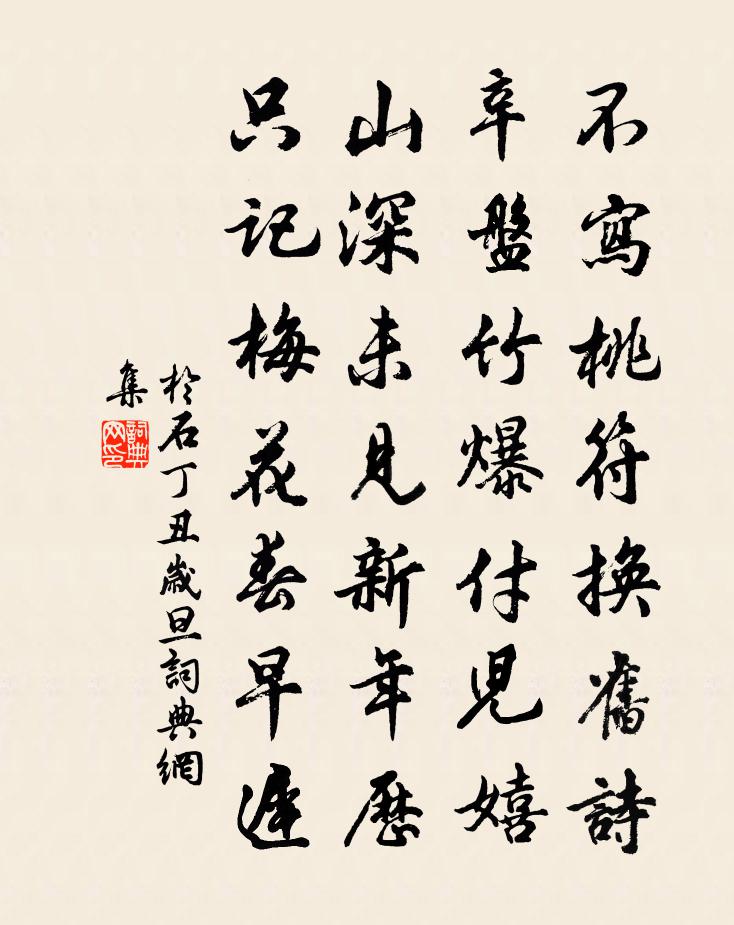 詩詞名句歷史字典書法欣賞書法字典國語詞典說文解字康熙字典古漢語字典標 題 作 者 詩 句 丁丑歲旦作者:於石 朝代:宋代丁丑歲旦原文不寫桃符換舊詩,辛盤竹爆付兒嬉。山深未見新年曆,只記梅花春早遲。詩詞問答問:丁丑歲旦的作者是誰?答:於石問:丁丑歲旦寫於哪個朝代?答:宋代於石丁丑歲旦書法欣賞丁丑歲旦書法作品詩詞推薦臨江仙(離懷)王觀〔宋代〕別岸相逢何草草,扁舟兩岸垂楊。繡屏珠箔綺香囊。酒深歌拍緩,愁入翠眉長。燕子歸來人去也,此時無奈昏黃。秋懷次韻晁應之三首張耒〔宋代〕衰鬢不堪洗,病軀先覺陰。天寒白日短,歲暮亂山深。薄酒醒無力,危弦奏不禁。謀身老逾拙,三聽洛陽砧。雪封寺二首李昴英〔宋代〕征輿六月度梅關,大地清涼樹影班。行客不須梅止渴,流泉到耳冷潺潺。頌古一百首釋智愚〔宋代〕見說閩山多蠱毒,千方百計避無由。殤中既有催魂鬼,一命還他方始休。旅次二首葛立方〔宋代〕山行砍犖趁雲程,食寢無多但有名。作夢方成雞喚起,加餐未竟馬催行。鼓風飛壒渾無際,敲日吹炎似有聲。埃息晚坐觀風亭三首宋庠〔宋代〕百尺空台河上城,遠波虛籟助秋聲。過窮旅雁書難得,啼殺飢烏曲未成。急節何當容白髮,流塵只欲傍華纓。臨高魯港文天祥〔宋代〕方夸金塢築,豈料玉床搖。國體真三代,江流舊六朝。鞭投能幾日,麗解不崇朝。千古燕山恨,西風卷怒潮。拋球樂李從周〔宋代〕風罥薦紅雨易晴。病花中酒過清明,綺窗幽夢亂於柳。羅袖淚痕凝似餳。冷地思量著,春色三停早二停。楊柳枝·桃源仙子不須夸司空圖〔唐代〕桃源仙子不須夸,聞道惟裁一片段預告。何似浣紗溪畔住,綠陰相間兩三家。卜運算元張元乾〔宋代〕涼氣入熏籠,暗影敧花砌。紫玉誰人三弄寒,細吹斷、江梅意。花底濕春衣,隔坐風輕遞。卻笑笙簫緱嶺人,明日山中主人楊巨源〔唐代〕十里青山有一家,翠屏深處更添霞。若為說得溪中事,錦石和煙四面花。丁香結陳允平〔宋代〕塵擁妝檯,翠閒歌扇,金井碧梧風隕。聽豆蟲聲小,伴寂寞、冷逼莓牆蒼潤。料淒涼宋玉,悲秋恨、此際怎忍。蓮中秋夜八絕蘇轍〔宋代〕誰遣常時月,偏從此夜明。暗添珠百倍,潛感兔多生。贈臧汝舟次韻陳造〔宋代〕昔人得珠沒濤淵,悟後悚惕悔厥先。世間萬事無真是,辯口莫究然不然。此心疑然古井水,與俗方圓寧得已。紋楸頌古四首釋祖欽〔宋代〕九九八十一,窮漢受罪畢。才擬展腳眠,蚊蟲獦蚤出。玉台體利登〔宋代〕兩彎弓月眉端照,一朵忪雲鬢畔歸。欲默不能言不可,嬌心無著憑青衣。澹軒李處權〔宋代〕野鶴元同性,晴山正滿門。那知有城市,初不異丘樊。水靜嫌風撓,花開畏蝶喧。應當如是觀,客至亦忘言。岐王席上詠美人張諤〔唐代〕半額畫雙蛾,盈盈燭下歌。玉杯寒意少,金屋夜情多。香艷王分帖,裙嬌敕賜羅。平陽莫相妒,喚出不如他。送徐仲洪尉南安八首彭龜年〔宋代〕椎牛酌酒是民頑,明約科條墟裡間。若更寬他衣食路,桑間陌上自閒閒。句焦宗古〔宋代〕南陽客自稱龍臥,東魯人應嘆鳳衰。名句推薦請君試問東流水,別意與之誰短長。李白《金陵酒肆留別》 危樓高百尺,手可摘星辰。李白《夜宿山寺》 人患志之不立,亦何憂令名不彰邪?劉義慶《世說新語·自新》 自古明王聖帝,猶須勤學,況凡庶乎!顏之推《顏氏家訓·勉學篇》 黃師塔前江水東,春光懶困倚微風。杜甫《江畔獨步尋花·其五》 利出者實及,怨往者害來。列子及其弟子《列子·說符》 遇酒且呵呵,人生能幾何!韋莊《菩薩蠻·勸君今夜須沈醉》 論至德者不和於俗,成大功者不謀於眾。司馬遷《史記·趙世家》 江上往來人,但愛鱸魚美范仲淹《江上漁者》 堂上遠於百里,堂下遠於千里,門庭遠於萬里。管仲《管子·法法》