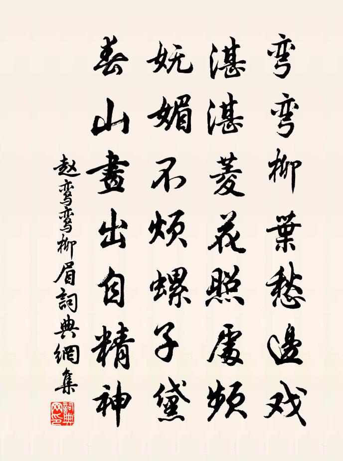 詩詞名句歷史字典書法欣賞書法字典國語詞典說文解字康熙字典古漢語字典標 題 作 者 詩 句 柳眉作者:趙鸞鸞 朝代:唐代柳眉原文彎彎柳葉愁邊戲,湛湛菱花照處頻。嫵媚不煩螺子黛,春山畫出自精神。詩詞問答問:柳眉的作者是誰?答:趙鸞鸞問:柳眉寫於哪個朝代?答:唐代問:柳眉是什麼體裁?答:七絕趙鸞鸞柳眉書法欣賞柳眉書法作品注釋全唐詩:卷802-35詩詞推薦劍池黃昭〔宋代〕一劍已飛去,千年池尚存。浮圖入雲表,古寺倚山根。虎踞石形險,龍潛水氣昏。闔閭成底事,遺恨滿乾坤。韓玉汝遺澄心紙二軸初得此物歐陽永叔又得於梅堯臣〔宋代〕三得澄心紙,吾嘗再有詩。粗能條本末,不復語興衰。堪入右軍跡,慚無幼婦辭。君家兄弟意,將此比烏絲。西江月(石夷仲去姬復歸)朱敦儒〔宋代〕織素休尋往恨,攀條幸有前緣。隔河彼此事經年。且說蓬萊清淺。障面重新團扇,傾鬟再整花鈿。歌雲舞雪畫堂前謁三門禹祠司馬光〔宋代〕信矣禹功美,獨兼人鬼謀。長山忽中斷,巨浸失橫流。跡與在地久,民無魚鱉憂。誰能報盛德,空爾蘆醪羞。贔屭寄司錄朝奉兼簡伯壽鄧肅〔宋代〕老松古柏爭清勁,社稷元勛李文正。風流千古照人寒,家有白眉聲益振。十年遊宦落窮山,妾無衣帛日號寒。只余沁園春 壽節秋谷平章十一月朔程文海〔元代〕河漢無雲,淡月疏星,玉宇初澄。漸金仙掌上,露華高潔,西風陣里,霜氣崚嶒。浪蕊浮花,狂茨怪蔓,此日紛紛偈頌一百零二首釋慧遠〔宋代〕道大兮功不立,隅無兮方莫存。跨鰲頭兮歸巨海,挾月角兮出天門。立春二首劉克莊〔宋代〕枯槁蒙膏潤,誰非喜雨人。兒童翻懊惱,惜不看鞭春。舟中感懷三絕句呈太傅相公兼簡岳大用郎中陸游〔宋代〕浪中鼞鞳雨聲寒,孤夢初回燭半殘。甲子一周胡未滅,關山還帶淚痕看。惠州弟哀詩二首劉克莊〔宋代〕同產居慚余最長,二尊尤向汝鍾情。斑衣猶記循陔樂,白髮皆從陟岵生。一老吹壎無復和,十年廢樂未能平。傷心重送李逢原歸蘇州梅堯臣〔宋代〕吳客歸從楚,霜華著馬蹄。倦童持弊橐,呼艇過寒溪。索寞區中飯,依稀日午雞。張儀猶舌在,不必愧於妻。登胡氏樓陶夢桂〔宋代〕草際露華白,天邊雲浪開。好風何處起,和月入簾來。余泛舟不能具舫創為隆蓬加牖戶焉葉適〔宋代〕雖然一槳匆匆去,也要身寬對好山。新拗蓬窗高似屋,諸峰獻狀住中間。尚書省受誓誡貽太廟裴丞儲光羲〔唐代〕皇家有恆憲,齋祭崇明祀。嚴車伊洛間,受誓文昌里。沉沉雲閣見,稍稍城烏起。曙色照衣冠,虛庭鳴劍履。裴回寄竹院方丈孚師胡仲參〔宋代〕江湖歲月易銷磨,振錫歸來鬢欲皤。性懶吟編多散逸,門閒俗客少經過。虛檐 * 懸蛛網,落葉空中見鳥窠。一片益壽美金花侯善淵〔元代〕擘開鬼窟。杳杳冥冥精恍惚。滿目華陽。*耀靈珠映日光。至真無物。寶燦精*明返復。致死不忘。星*丹霄得久題定山寺法遠上人壁賀鑄〔宋代〕支郎風味喜相親,乘興來尋雪後春。夾徑竹陰疑礙馬,隔江山色似招人。豈無暇日容高臥,如有閒田願卜鄰。預約早赴東寺行香仇遠〔宋代〕衝風冒雨過南橋,馬上聞鍾覺寺遙。客發頓驚秋信早,飛蓬落葉兩蕭蕭。書事王維〔唐代〕輕陰閣小雨,深院晝慵開。坐看蒼苔色,欲上人衣來。落星寺洪咨夔〔宋代〕春秋隕石於宋五,分作金焦與星渚。大圓鏡裹八窗開,面面魚龍聽人語。瀑長一線吹不動,山擁萬綺明可數。嗟哉名句推薦酒亂性,色迷人。施耐庵《水滸傳·第四十五回》 黃鶯百舌正相呼,玉樹後庭花帶雨。牛殳《琵琶行》 千嬌面、盈盈佇立,無言有淚,斷腸爭忍回顧。柳永《採蓮令·月華收》 已向丹霞生淺暈,故將清露作芳塵。睦石《玉蘭》 橋成漢渚星波外,人在鸞歌鳳舞前。晏幾道《鷓鴣天·當日佳期鵲誤傳》 人生易老天難老,歲歲重陽。 * 《採桑子·重陽》 烽火照西京,心中自不平。楊炯《從軍行》 時危見臣節,世亂識忠良。鮑照《代出自薊北門行》 空對著,山中高士晶瑩雪曹雪芹《終身誤》 勞而不伐,有功而不德,厚之至也。佚名《易傳·繫辭傳上·第八章》
