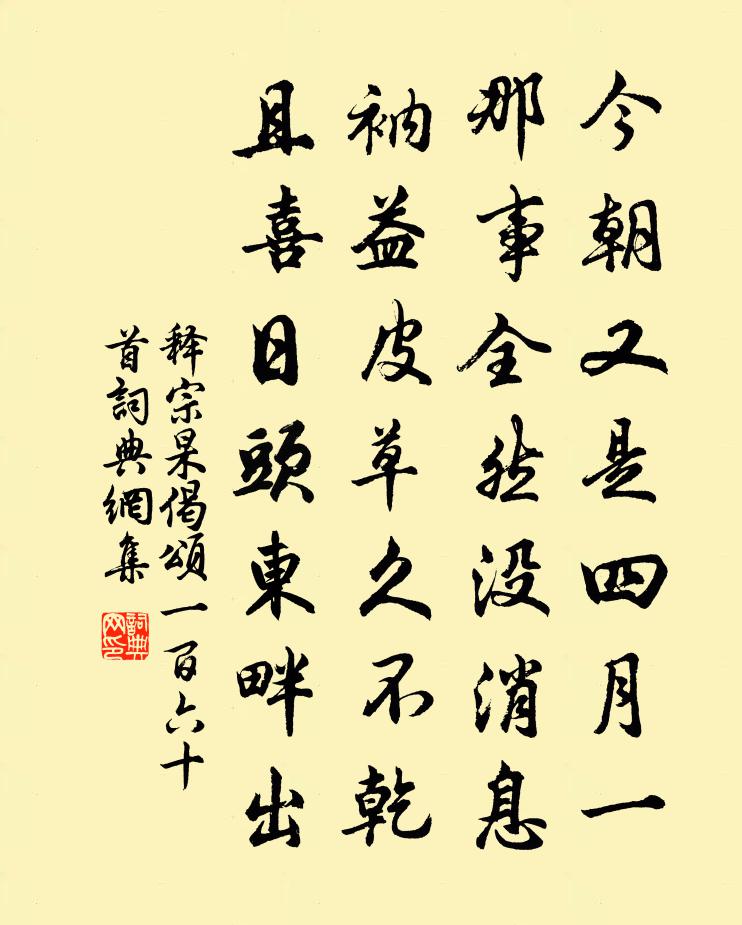 詩詞名句歷史字典書法欣賞書法字典國語詞典說文解字康熙字典古漢語字典標 題 作 者 詩 句 偈頌一百六十首作者:釋宗杲 朝代:宋代偈頌一百六十首原文今朝又是四月一,那事全然沒訊息。衲益皮草久不乾,且喜日頭東畔出。詩詞問答問:偈頌一百六十首的作者是誰?答:釋宗杲問:偈頌一百六十首寫於哪個朝代?答:宋代釋宗杲偈頌一百六十首書法欣賞偈頌一百六十首書法作品詩詞推薦溝泥二首張耒〔宋代〕溝泥不可步,況復雨清晨。下直休半日,閉門閒晚春。著書聊爾耳,隱市笑徒雲。買酒待新月,奈茲千里雲。和張子野見寄三絕句 過舊遊蘇軾〔宋代〕前生我已到杭州,到處長如到舊遊。更欲洞霄為隱吏,一庵閒地且相留。蝶戀花李久善〔宋代〕鶯擲垂楊,一點黃金溜。都中留隨州李判官劉過〔宋代〕幸白東南好,西歸未可忙。茶添橄欖味,酒借蛤蜊香。絕品宜春醉,新烹趁日長。倒囊煩厚載,歸遣北人嘗。雪後觀梅吳芾〔宋代〕春色三分已一分,江梅猶自占青春。有花堪折須拼醉,莫待東風吹作塵。宿天台石橋林季仲〔宋代〕今人議論只從多,簣土那能障大河。我有室廬亦方廣,歸途不向石橋過。友善堂為張以道題沈繼祖〔宋代〕上士與下士,多聞或寡聞。子誠能尚友,我亦嘆離群。磨琢功當進,金蘭志不分。孝標何所見,但廣絕交文。念奴嬌佚名〔宋代〕對景真奇絕。梨花王鎡〔宋代〕一身嬌韻倚東風,骨膩肌香易粉融。好向曉光垂露看,楊妃梳洗出唐宮。醉夢迷/採桑子賀鑄〔宋代〕深坊別館蘭閨小,障掩金泥,燈映玻璃。一枕濃香醉夢迷。醒來擬作清晨散,草草分攜。柳巷鴉啼。又是明朝日向酬金部王郎中省中春日見寄盧綸〔唐代〕南宮樹色曉森森,雖有春光未有陰。鶴侶正疑芳景引,玉人那為簿書沈。山含瑞氣偏當日,鶯逐輕風不在林。更有別錢筠甫三首張耒〔宋代〕春燈欲盡曉雞啼,殘月影中征馬嘶。為語相逢不消喜,相逢終有道分離。姚源憶故人 贈亭川眾道友馬鈺〔元代〕塵中個個貪名利。要賽石崇富貴。爭奈前程不諱。莫也難逃避。悟來詐做**地。便是脫家奇計。鍊氣全神圓備。和趙從道賦菜畦春富貴鄭清之〔宋代〕多生菜氣粥魚僧,味菜還如好色登。戲學桃根和露煮,正堪摘稻配香蒸。芝田不減商山樂,蔬食誰言孔色矜。蒲筍梅二首張嵲〔宋代〕兩京當日見初開,尚想凌雲繞故台。倚竹姱姿應小駐,高樓急管未須催。傷春遠目空千里,急景愁腸自九回。為說張翰徐鈞〔宋代〕曠達清才輕爵祿,秋風才動便思鱸。此中杯酒一時樂,卻道他時名不如。寄彥博二首李流謙〔宋代〕世途今若此,吾道竟何如。學古疑無用,謀身忌太疎。引杯空慷慨,看鏡獨躊躇。千萬胸中語,因人略寄書。宿山館儲嗣宗〔唐代〕寂寞對衰草,地涼凝露華。蟬鳴月中樹,風落客前花。山館無宿伴,秋琴初別家。自憐千萬里,筆硯寄生涯。溪中早春白居易〔唐代〕南山雪未盡,陰嶺留殘白。西澗冰已銷,春溜含新碧。東風來幾日,蟄動萌草坼。潛知陽和功,一日不虛擲。愛此早春秦觀〔宋代〕黃金蔌蔌滿垂楊,尚有春寒到畫堂。酒力漸銷歌扇怯,入簾飛雪帶梅香。名句推薦但怪得、當年夢緣能短。吳文英《三姝媚·過都城舊居有感》 山圍故國周遭在,潮打空城寂寞回。劉禹錫《金陵五題·石頭城》 淡淡橫朝煙,脈脈深秋思。劉道著《湘江秋曉》 大丈夫相時而動。曹雪芹《紅樓夢·第四回》 半夜倚喬松,不覺滿衣雪。孟郊《苦寒吟》 天與秋光,轉轉情傷,探金英知近重陽。李清照《行香子·天與秋光》 願學秋胡婦,貞心比古松。李白《湖邊採蓮婦》 吹到一片秋香,清輝了如雪。納蘭性德《琵琶仙·中秋》 聞道春還未相識,走傍寒梅訪訊息。李白《早春寄王漢陽》 泰山嵯峨夏雲在,疑是白波漲東海。李白《早秋單父南樓酬竇公衡》