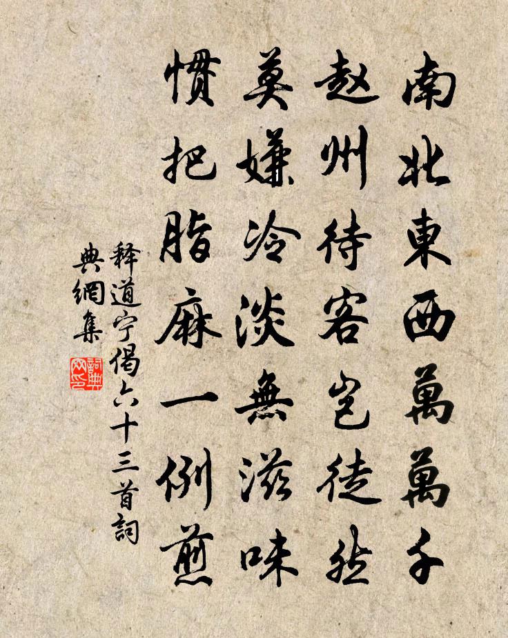 詩詞名句歷史字典書法欣賞書法字典國語詞典說文解字康熙字典古漢語字典標 題 作 者 詩 句 偈六十三首作者:釋道寧 朝代:宋代偈六十三首原文南北東西萬萬千,趙州待客豈徒然。莫嫌冷淡無滋味,慣把脂麻一例煎。詩詞問答問:偈六十三首的作者是誰?答:釋道寧問:偈六十三首寫於哪個朝代?答:宋代釋道寧偈六十三首書法欣賞偈六十三首書法作品詩詞推薦沁園春程節齋〔宋代〕髧彼兩髦,未幾見兮,突而弁兮。記昔年犀玉,奇資秀質,今朝簪佩,豐頰修眉。滿面春風,一團和氣,發露胸中雨寒寄姜堯草劉過〔宋代〕一冬無此寒,十日不得出。閉門坐如鉤,老去萬感入。治游亦餘事,況乃燈火畢。獨憐鏡湖春,一一各秀髮。枝條同盧明府早秋宴張郎中海亭孟浩然〔唐代〕側聽弦歌宰,文書游夏徒。故園欣賞竹,為邑幸來蘇。華省曾聯事,仙舟復與俱。欲知臨泛久,荷露漸成珠。廬山太平宮一首王阮〔宋代〕貝闕岧嶢不可攀,遙分絳節下人間。起元立道幾千歲,擇勝棲神第一山。膏雨應時豐綠野,真風與世養朱顏。山前相和歌辭。銅雀妓喬知之〔唐代〕金閣惜分香,鉛華不重妝。空餘歌舞地,猶是為君王。哀弦調已絕,艷曲不須長。共看西陵暮,秋煙起白楊。鷓鴣天(腹疾困睡和朱希真詞)劉克莊〔宋代〕前度看花白髮郎。平生痼疾是清狂。幸然無事污青史,省得教人奏赤章。遊俠窟,少年場。輸他群謝與諸王。居人題東觀壁謝枋得〔宋代〕老樹猶能識道回,好懷長對碧天開。青山綠水何人管,明月清風要我來。少日曾聞黃石教,平生幾擲左慈杯。道兄過玉山莊居張埴〔宋代〕踏到城隅路盡頭,烝湘兩水忽交流。爐薰不斷征蠻祀,碣墨空遺責楚羞。石鼓無聲山落木,朱陵未覺月生洲。冷吟又次韻二首陳造〔宋代〕向來湖上扶攜醉,醉里清吟雜雨聲。此去淮西望京國,詩邊處若為情。頌四賓主釋印肅〔宋代〕主中主,無相光中施法雨。醍醐一味灌群機,皆入無為涅磐宇。驀山溪劉菊房〔宋代〕醉魂離夢,捻合難成片。惡味怕黃昏,更西風,梧桐深院。蟬松翠嫵,記那日相逢,情繾綣。語玲瓏,人靜凌波見感遇之十六陳子昂〔唐代〕聖人去已久。公道緬良難。蚩蚩誇毗子。堯禹以為謾。驕榮貴工巧。勢利迭相干。燕王尊樂毅。分國願同歡。魯連雨過閒步楊公遠〔宋代〕霏微雨過不成泥,小步何妨曳杖藜。半露好山雲斷續,輕籠淡日樹高低。池塘有夢春生草,桃李無言下自蹊。政此鍾陵崔大夫罷鎮攀隨再經匡廬寺宿羅鄴〔唐代〕一拋文戰學從公,兩逐旌旗宿梵宮。酒醒月移窗影畔,夜涼身在水聲中。侯門聚散真如夢,花界登臨轉悟空。明發千秋歲(別情)李流謙〔宋代〕玉林照坐。簌簌花微墮。春院靜,煙扉鎖。黛輕妝未試,紅淡唇微破。清瘦也,算應都是風流過。把盞對橫枝,尚書帷陳宓〔宋代〕青編有補曾無損,白璧難全易作瑕。欲下涼帷玩真味,莫將絲履染塵沙。代梅所戲答正仲用韻贈管城子二絕舒岳祥〔宋代〕誰將明月作邊愁,玉兔毫成是素秋。縛取山中毛氏族,盛行文教寢旄頭。睹亡友題詩處歐陽詹〔唐代〕舊友親題壁上詩,傷看緣跡不緣詞。門前猶是長安道,無復回車下筆時。晚春二首二晁補之〔宋代〕春歸風雨一朝盡,畫靜園林諸趣嘉。蜻蜓出水群掠蚋,鵯鵊衛巢雙趁鴉。和答趙生師白見寄孫應時〔宋代〕田可躬耕溪可漁,此身屬我不關渠。養生誰學嵇中散,避謗吾非陸敬輿。風月滿懷高士傳,江山到眼故人書。相思名句推薦人間夢隔西風,算天上、年華一瞬。吳文英《惜秋華·七夕》 想今宵、也對新月,過輕寒、何處小橋。趙汝茪《戀繡衾·柳絲空有千萬條》 釀泉為酒,泉香而酒洌;歐陽修《醉翁亭記》 紫菊氣,飄庭戶,晚煙籠細雨。李煜《謝新恩·冉冉秋光留不住》 驚起卻回頭,有恨無人省。蘇軾《卜運算元·黃州定慧院寓居作》 歸鴻聲斷殘雲碧。背窗雪落爐煙直。李清照《菩薩蠻·歸鴻聲斷殘雲碧》 凡人之患,蔽於一曲,而闇於大理。荀子《荀子·解蔽》 縱浪大化中,不喜亦不懼。陶淵明《形影神三首》 故國雖大,好戰必亡;天下雖安,忘戰必危。姜子牙《司馬法·仁本》 念天地之悠悠,獨愴然而涕下。陳子昂《登幽州台歌》