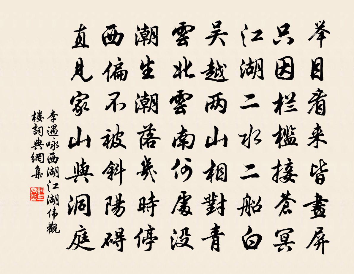 詩詞名句歷史字典書法欣賞書法字典國語詞典說文解字康熙字典古漢語字典標 題 作 者 詩 句 詠西湖江湖偉觀樓作者:李遇 朝代:宋代詠西湖江湖偉觀樓原文舉目看來皆畫屏,只因欄檻接蒼冥。江湖二水二船白,吳越兩山相對青。雲北雲南何處沒,潮生潮落幾時停。西偏不被斜陽礙,直見家山與洞庭。詩詞問答問:詠西湖江湖偉觀樓的作者是誰?答:李遇問:詠西湖江湖偉觀樓寫於哪個朝代?答:宋代李遇詠西湖江湖偉觀樓書法欣賞詠西湖江湖偉觀樓書法作品詩詞推薦謝傳神平上人李覯〔宋代〕蕞陋徒煩妙筆傳,呼兒看了獨悽然。丹青不解隨人老,相似都來得幾年。早春北亭見城隅荒寂宋庠〔宋代〕荒城樓堞少,野色偏高低。蔓草無名綠,幽禽取意啼。天形岡樹北,日腳嶺雲西。不覺凝笳動,春風引夕鼙。離京兆日獨里人葉舜舉秘丞胡從道戶曹遠餞至強至〔宋代〕兩經辟命住秦關,府罷東隨相國還。物態當時傾附後,人情今日有無間。青門雨送歸行色,白酒風吹上別顏。相見潛鶴鼓楊備〔宋代〕端門擊破使人驚,潛鶴雙飛上玉清。怪得舊時聲太遠,沖天合自九臯鳴。松原山行七絕趙蕃〔宋代〕一日周遭度九溪,快儂雙腳淨無泥。真同落落石為枕,寧愧區區沙築堤。瑞鶴仙佚名〔宋代〕正迎長佳節。宴啟華筵,有誰能說。子孫盡環列。見瑞香香裊,壽星明徹。絲絲華發。記瑤池、宴班曾接。笑人間雜曲歌辭羽林行孟郊〔唐代〕朔雪寒斷指,朔風勁裂冰。胡中射鵰者,此日猶不能。翩翩羽林兒,錦臂飛蒼鷹。揮鞭決白馬,走出黃河凌。二疏釋文珦〔宋代〕漢朝諸公卿,鮮有能自全。廣愛信明哲,獨悟於機先。托之老氏訓,辭祿偕歸田。祖帳東都門,萬口稱其賢。於今如歸亭順風王安石〔宋代〕春江窈窈來無地,飛帆浩浩窮天際。朝天吳川夕霅溪,回首喬林吹岸薺。柁師高臥自嘯歌,戲彼挽舟行復止。人生沁園春劉將孫〔宋代〕壬戌之秋,七夕既望,蘇子泛舟。正赤壁風清,舉杯屬客,東山月上,遺世乘流。桂棹叩舷,洞簫倚和,何事嗚嗚八月十三夜與張檢法泛武溪朱翌〔宋代〕川淨波平五板舟,天開地辟一輪秋。白銀國放黃金色,宮錦袍添紫綺裘。坐久星河掛瓔珞,夜深風露走珠旒。人間旬休日過仁王寺曾鞏〔宋代〕雜花飛盡綠陰成,處處黃鸝百囀聲。隨分笙歌與樽酒,且偷閒日試閒行。青房並蒂蓮(維揚懷古)周邦彥〔宋代〕醉凝眸。正楚天秋晚,遠岸雲收。草綠蓮紅,□映小汀洲。芰荷香里鴛鴦浦,恨菱歌、驚起眠鷗。望去帆、一派湖送謝方伯赴試陽枋〔宋代〕春桑催蠶日遲遲,春蠶食葉開文闈。桃源雖好不可住,高人夢故山薇。金雞啁啪喚出日,輕舟短棹風吹衣。莫問虹句傅九萬〔宋代〕笑他思著專鱸者,欲感秋風始去官。終南幽居獻蘇侍郎三首時拜太祝未上儲光羲〔唐代〕暮春天氣和,登嶺望層城。朝日懸清景,巍峨宮殿明。聖君常臨朝,達士復懸衡。道近無艮足,歸來臥山楹。靈階問答梅堯臣〔宋代〕青雲梯,尺木為階行勿迷。勤修道業生羽翼,天門九襲須攀隮。和紅梅釋寶曇〔宋代〕此花不是施朱手,醉里何妨取次開。地近恐遭繁杏污,月明先遣暗香來。為君繞樹須千匝,老我逢春復幾回。詩到行香子王吉昌〔元代〕震內藏金,金乙成姻。假沖和、雷電交陳。龍吟虎嘯,幽谷澄神。向杳冥中,風雲里,傲全身。煙雨ㄨㄨ,芝草芽題岫上人院許渾〔唐代〕病客與僧閒,頻來不掩關。高窗雲外樹,疏磬雨中山。離索秋蟲響,登臨夕鳥還。心知落帆處,明月浙河灣。名句推薦半生已分孤眠過,山枕檀痕涴。納蘭性德《虞美人·曲闌深處重相見》 寒英坐銷落,何用慰遠客。柳宗元《早梅》 風無纖埃,雨無微津。左思《三都賦》 丈夫志四海,萬里猶比鄰。曹植《贈白馬王彪·並序》 關城榆葉早疏黃,日暮雲沙古戰場。王昌齡《從軍行七首》 半夜倚喬松,不覺滿衣雪。孟郊《苦寒吟》 淺情終似,行雲無定,猶到夢魂中。晏幾道《少年游·離多最是》 蒂有餘香金淡泊,枝無全葉翠離披。曹雪芹《殘菊》 盤心清露如鉛水,又一夜、西風吹折。張炎《疏影·詠荷葉》 遠路應悲春晼晚,殘霄猶得夢依稀。李商隱《春雨》