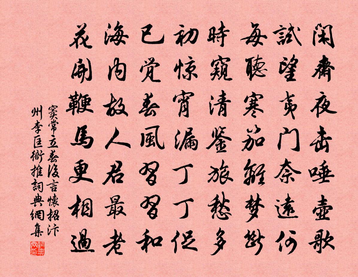 詩詞名句歷史字典書法欣賞書法字典國語詞典說文解字康熙字典古漢語字典標 題 作 者 詩 句 立春後言懷招汴州李匡衙推作者:竇常 朝代:唐代立春後言懷招汴州李匡衙推原文閒齋夜擊唾壺歌,試望夷門奈遠何。每聽寒笳離夢斷,時窺清鑒旅愁多。初驚宵漏丁丁促,已覺春風習習和。海內故人君最老,花開鞭馬更相過。詩詞問答問:立春後言懷招汴州李匡衙推的作者是誰?答:竇常問:立春後言懷招汴州李匡衙推寫於哪個朝代?答:唐代竇常立春後言懷招汴州李匡衙推書法欣賞立春後言懷招汴州李匡衙推書法作品注釋全唐詩:卷271_26詩詞推薦和黃彥華帥機六言十首劉克莊〔宋代〕吾嘗評論齊物,未知彭殤孰賢。蒙莊略曉些子,分別小年大年。約劉良叔觀苔梅方岳〔宋代〕白玉為堂月一欄,何如茅屋雪中看。笑堪索否便堪醉,盟可尋歟不可寒。杜北春風驚婉娩,江南煙雨幾悲酸。清香畫屏鄭獬〔宋代〕翠筱疏明臨晚水,紫葵點綴落晴沙。山雞對臥綠蒲葉,野鴨爭銜黃荇花。山居寂寥與世如隔是非不到榮辱兩忘因憶秋崖吳錫疇〔宋代〕我愛山居好,扶藜步晚晴。俗醇存古意,境寂快詩情。杜老銀絲膾,坡翁玉糝羹。隨緣清供足,盡可佚餘生。有感吳芾〔宋代〕自度吾生不久長,老懷猶自愛風光。春來扶杖觀花急,夏到穿林看筍忙。無限故人成鬼錄,幾多逐客寓他鄉。我今費子范以予銘其父墓持錦物相餉盡歸之姑留洮晁公溯〔宋代〕大費家聲星斗垂,乃翁名跡世人知。平生於此辭無愧,不減東京有道碑。杏花王禹偁〔宋代〕紅芳紫萼 * ,蓓蕾粘枝密作團。記得觀燈鳳樓上,百條銀燭淚闌乾。賀新郎楊冠卿〔宋代〕具能歌張仲宗目盡青天等句,音韻洪暢,聽之慨然。戲用仲宗韻呈張君量府判薄暮垂虹去。正江天、殘霞冠日,亂詠史詩虞坂胡曾〔唐代〕悠悠虞坂路欹斜,遲日和風簇野花。未省孫陽身沒後,幾多騏驥困鹽車。臨江仙(閨怨)韓淲〔宋代〕脆管繁弦無覓處,小樓空掩遙山。柳絲直下曲闌乾。海棠紅欲褪,玉釧怯春衫。殢酒不成芳信斷,社寒新燕呢喃。和韓宗弼暴雨〈次韻〉蘇轍〔宋代〕執熱臥北窗,淋漓汗流注。蛟龍遁水府,誰起叩天戶。偶然終日風,振擾北山霧。崩騰轉相軋,變化不容睹。雷聲深夜謠二首曹勛〔宋代〕花落春猶在,人存事已非。草侵迎仗路,塵滿舊熏衣。獨立空憐影,當歌但斂眉。羞見長門月,曾同步輦歸。王寺丞借西第避暑因有寄贈楊億〔宋代〕滕公甲第冠神州,書日青煙瓦上浮。南榭薰風偏解慍,北階萱草更忘憂。朝回門閉人疑病,雨過涼生景似秋。角忱頌證道歌證道歌釋印肅〔宋代〕中下多聞多不信,文章學解增心病。閻公未肯便饒伊,碓搗磨磨終不靜。思遠寄師厚梅堯臣〔宋代〕馬蹄踐霜雪,不畏道路寒。遊子重衣裘,慈母懸心肝。懸心幾千里,冉冉歲已殘。大河今漸涸,遠目常不乾。度雁和吳處士題村叟壁李鹹用〔唐代〕因閱鄉居景,歸心寸火然。吾家依碧嶂,小檻枕清川。遠雨籠孤戍,斜陽隔斷煙。沙虛遺虎跡,水洑聚蛟涎。糲曲次韻王宣義見過夜飲四絕毛滂〔宋代〕淒風落日酒家天,何事囊中長一錢。快見渴虹橫酒戶,歸須殘月上吟韉。山橋月夜方岳〔宋代〕寒聲策策琅玕碧,香氣浮浮菡萏紅。六月人間苦炎熱,獨搔殘雪月明中。豳州文同〔宋代〕昔年戎馬盡南豳,今日風光已太文。雅吹夜喧金府月,靚妝春艷玉峰雲。泉亭柳色濃將滴,水寨荷香遠更薰。邏候重陽前一日大風雨項安世〔宋代〕天公著意做重陽,風伯驅除特地忙。掃盡殘花與紅葉,放教籬菊占秋光。名句推薦皎皎窗中月,照我室南端。潘安《悼亡詩三首》 黃埃散漫風蕭索,雲棧縈紆登劍閣。白居易《長恨歌》 何處可為別,長安青綺門。李白《送裴十八圖南歸嵩山二首》 曾苦傷春不忍聽,鳳城何處有花枝李商隱《流鶯》 春未綠,鬢先絲。人間別久不成悲。姜夔《鷓鴣天·元夕有所夢》 天下之百姓皆上同於天子,而不上同於天,則災猶未去也。墨子《墨子·11章 尚同(上)》 輕則寡謀,驕則無禮。左丘明《國語·周語·王孫滿觀秦師》 夫禮之初,始諸飲食戴聖《禮記·禮運》 大廈將顛,非一木所支也。王通《中說·卷三·事君篇》 冰雪襟懷,琉璃世界,夜氣清如許。黃升《酹江月·夜涼》