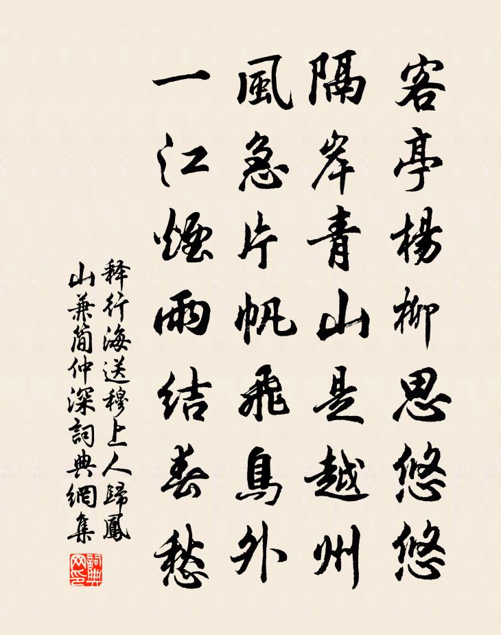 詩詞名句歷史字典書法欣賞書法字典國語詞典說文解字康熙字典古漢語字典標 題 作 者 詩 句 送穆上人歸鳳山兼簡仲深作者:釋行海 朝代:宋代送穆上人歸鳳山兼簡仲深原文客亭楊柳思悠悠,隔岸青山是越州。風急片帆飛鳥外,一江煙雨結春愁。詩詞問答問:送穆上人歸鳳山兼簡仲深的作者是誰?答:釋行海問:送穆上人歸鳳山兼簡仲深寫於哪個朝代?答:宋代釋行海送穆上人歸鳳山兼簡仲深書法欣賞送穆上人歸鳳山兼簡仲深書法作品詩詞推薦讀趙張嵲〔宋代〕赤鳳謾言最可傷,君王不謂有他腸。併疑池上將仙去,只恐留連為侍郎。過西海隘即事李曾伯〔宋代〕江帶湖襟護一堤,人煙落落柳依依。白鷗世界秋容澹,紅蓼汀州水際肥。斷岸馬危遲弗驟,中流舟順疾於飛。歸來題陳朝乾山亭二首翠微姜特立〔宋代〕高蹈煙霞遠世塵,翠微深處一紛巾。若非嚴瀨垂竿客,即是桃源避世人。自梁園至敬亭山見會公談陵陽山水兼期同游因有此贈李白〔唐代〕我隨秋風來,瑤草恐衰歇。中途寡名山,安得弄雲月。渡江如昨日,黃葉向人飛。敬亭愜素尚,弭棹流清輝。冰谷點絳唇元好問〔金代〕夢裡梁園,暖風遲日熏羅綺。滿城桃李。車馬紅塵起。客枕三年,故國雲千里。更殘未。夜寒如水。茅屋清霜底。轎中望泛仙山楊萬里〔宋代〕上卻籃輿卷卻簾,曉寒旋索熟衣添。孤松已自三千丈,更在仙山第一尖。游山步陸游〔宋代〕蹇驢渺渺過雲邊,旋了三生物外緣。平日視家真逆旅,此行出戶若登仙。飢從野店烹葵飯,困就僧床借枕眠。所恨暮熱游荷池上五首楊萬里〔宋代〕玉礫金沙一逕長,暑中無處可追涼。獨行行到荷池上,荷不生風水不香。題公牘曾國藩〔清代〕官兒盡大有何榮?字數太多看不清。減去數行重刻過,留教他日作銘旌。赴京道中逢還鄉友高啟〔明代〕我去君卻歸,相逢立途次。欲寄故鄉言,先詢上京事。來上人乾延壽院乞頌釋正覺〔宋代〕披蓁卜築古林阿,百丈心於老病多。照徹有無方得我,緣分生滅不 * 。谷雲冷抱松根石,山月明懸屋角蘿。若子晨起東軒李復〔宋代〕影暗才分竹,煙低正滿檐。雨斜侵藥裹,風過亂書籤。篆滅香猶在,塵昏硯未添。靜中時有興,著論不為潛。姑熟雜詠天門山李赤〔唐代〕迥出江水上,雙峰自相對。岸映松色寒,石分浪花碎。參差遠天際,縹緲晴霞外。落日舟去遙,回首沈青靄。出真州文天祥〔宋代〕戎衣嘖嘖嘆忠臣,為說城頭不識人。押出相公州界去,真州城裡榜安民。藍田溪雜詠二十二首松下雪錢起〔唐代〕雖因朔風至,不向瑤台側。唯助苦寒松,偏明後凋色。南歌子洪适〔宋代〕雲拂山腰過,風吹雨點來。田園好處有池台。記著相逢時節、海棠開。蝴蝶那無夢,鴛鴦亦有媒。藏鉤解佩兩三杯次韻子云盱眙道中三首韓元吉〔宋代〕海上狼烽不起煙,兵戈猶記舊年前。岩居有客能招飲,肉食何人為給鮮。但得生涯類盤谷,可無風景似斜川。共尋題長安壁主人張謂〔唐代〕世人結交須黃金,黃金不多交不深。縱令然諾暫相許,終是悠悠行路心。次韻袁德夫春日書事二首郭印〔宋代〕公餘蕭散步晴暉,正是韶光懶困時。官事暫能逃倥傯,物情深覺變神奇。風傳小樹香浮砌,水接平湖綠滿池。春草蘇州故吏白居易〔唐代〕江南故吏別來久,今日池邊識我無?不獨使君頭似雪,華亭鶴死白蓮枯。[蓮鶴皆蘇州同來。]名句推薦苟不至德,至道不凝焉。子思《中庸·第二十七章》 無材可去補蒼天,枉入紅塵若許年。曹雪芹《紅樓夢·第一回》 以欲從人者昌,以人樂己者亡。吳兢《貞觀政要·卷六·論儉約》 酒後競風采,三杯弄寶刀。李白《白馬篇》 一家二貴,事乃無功。韓非及後人《韓非子·揚權》 積學以儲寶,酌理以富才劉勰《文心雕龍·神思》 獨立揚新令,千營共一呼。盧綸《和張僕射塞下曲·其一》 遠上寒山石徑斜,白雲生處有人家。杜牧《山行》 重幃深下莫愁堂,臥後清宵細細長。李商隱《無題·重幃深下莫愁堂》 夫知人之性,莫難察焉。諸葛亮《將苑·卷一·知人性》