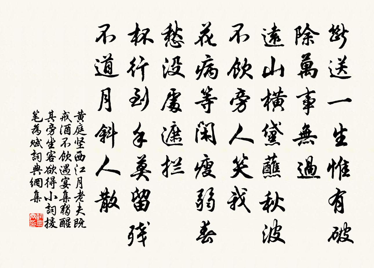 此詞作于山谷貶謫黔州之後。詞中以作者戒酒後重又開戒飲酒之事為題材,表達了作者被貶謫後企圖借酒澆愁的意念和及時行樂的狂放曠達胸懷。全詞感慨世事人生,帶有詼諧玩世的情趣,又使人觸摸到作者內心的隱痛,讀來意味無窮。