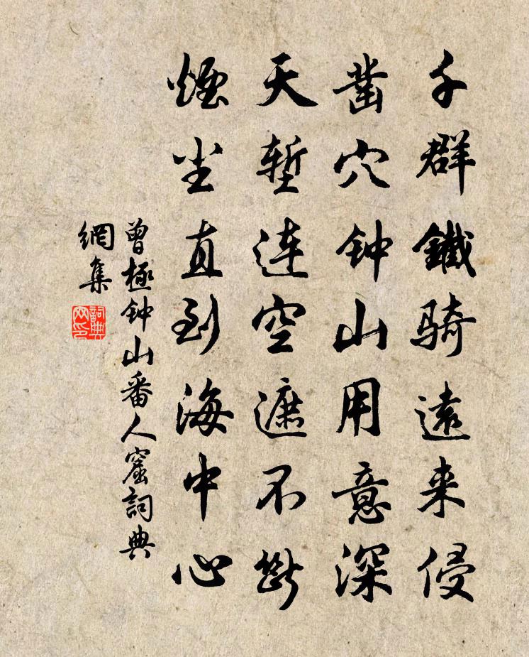 詩詞名句歷史字典書法欣賞書法字典國語詞典說文解字康熙字典古漢語字典標 題 作 者 詩 句 鐘山番人窟作者:曾極 朝代:宋代鐘山番人窟原文千群鐵騎遠來侵,鑿穴鐘山用意深。天塹連空遮不斷,煙塵直到海中心。詩詞問答問:鐘山番人窟的作者是誰?答:曾極問:鐘山番人窟寫於哪個朝代?答:宋代曾極鐘山番人窟書法欣賞鐘山番人窟書法作品詩詞推薦清涼山贊佛詩 四首吳偉業〔清代〕西北有高山,雲是文殊台。台上明月池,乾葉金蓮開。花花相映發,葉葉同根栽。王母攜雙成,綠蓋雲中來。漢王龜山寺納涼呈宗衍師孔武仲〔宋代〕寶洞然香罷,山堂問話中。日將秋共淡,心與境渾空。彈指看浮世,披襟納遠風。因知宴坐者,白首樂無窮。別黃山文天祐〔宋代〕黃山別去恨綿綿,華表重尋第幾巔。馬跡苔肥連碧漢,龍潭水暖漲靈泉。斷無花逐桃溪外,別有春留藥圃邊。鶗鴃溫其示梅詩用韻為謝兼簡士特李處權〔宋代〕可喜劉郎鬢未霜,能容宋玉近東牆。自知老眼無春事,誰意窮途得放光。前日桃園真有路,何時蘭室可無香。便須次太守鄭安恭探梅過西湖韻二首張棟〔宋代〕金方正位鑿平湖,物景堪將入畫圖。兩岸雨垂楊柳重,一汀沙立鷺鷥孤。泓澄良夜搖明月,瀲灩高秋蘸碧蘆。寓目喜見單君范八句陳著〔宋代〕世衰交道薄,相好獨金蘭。見面驚雙瘦,知心話百難。老饕蔥本暖,清坐杏花寒。明日休輕別,流年水赴灘。思佳客陳允平〔宋代〕一曲清歌酒一鍾。舞裙搖曳石榴紅。寶箏弦矗冰蠶縷,珠箔香飄水麝風。嬌婭奼,笑迎逢。合歡羅帶兩心同。彩雲識時梅歌謝璡〔宋代〕寇至人遠避,寇退人復歸。歸來尋舊址,草蕪迷荒基。哀哉住傍梅,清夢常相依。可憐歲寒心,能識存亡機。不欲餞高紫微視師黃岡岳珂〔宋代〕秋風九月邊塵同,千艘夜下宮錦袍。文章不特動蠻貊,要識金版開六弢。孫曹已矣等陳跡,喚起坡仙同赤壁。喧闐呈似表李處權〔宋代〕聞說煙塵近,驚奔道路長。人生何草草,天意竟茫茫。山鳥寒亡路,溪花濕更香。飄零值君子,老眼慰悲涼。送貓兒釋普濟〔宋代〕大慈悲種小斑斑,軟血功能也是閒。首尾直兮眸子正,不知走卻屋頭山。次韻文潛立春日三絕句黃庭堅〔宋代〕江山也似隨春動,花柳真成觸眼新。清濁盡須歸瓮蟻,吉凶更莫問波臣。千里思木待問〔宋代〕君行千里輕所歷,妾馳千里心匪石。春房酌酒意匆匆,愁不在離愁在憶。鴛鴦瓦上昏無色,鸚鵡杯中塵更積。燈前藍田溪雜詠二十二首竹間路錢起〔唐代〕暗歸草堂靜,半入花園去。有時載酒來,不與清風遇。去思堂會飲得春字歐陽修〔宋代〕世事紛然百態新,西岡一醉十三春。自慚白髮隨年少,猶把金鍾勸主人。黃鳥亂飛深夏木,紅榴初發艷清晨。佳時水調歌頭(三月初三)包恢〔宋代〕羽觴隨曲水,佳氣溢雙清。真賢瑞世,恰與真聖日同生。出侍紅雲一朵,出按皇華六轡,特地福吾閩。底是長生籙雨霽獨夜張嵲〔宋代〕繁星凝夜氣,黑月惟西山。一室空林迥,逾知天地寬。葉乾風有韻,石亂水多湍。獨坐澄諸念,憂來信有端。次韻郎中弟見寄李彌遜〔宋代〕浮木隨流誰見招,春江無盡水雲遙。只今瘴海投閒地,魑魅為鄰資正驕。排悶陸游〔宋代〕丈夫結髮志功名,大事真當以死爭。我昔駐車籌筆驛,孔明千載尚如生。盡山亭張嵲〔宋代〕南嶺與北岑,千同萬峰起。木末置危亭,眾山窮表里。名句推薦為有雲屏無限嬌,鳳城寒盡怕春宵。李商隱《為有》 天清一雁遠,海闊孤帆遲。李白《送張舍人之江東》 惜分長怕君先去,直待醉時休。賀鑄《眼兒媚·蕭蕭江上荻花秋》 自見之謂明。韓非及後人《韓非子·喻老》 近來攀折苦,應為別離多王之渙《送別》 正是霜風飄斷處,寒鷗驚起一雙雙。陸龜蒙《冬柳》 北客翩然,壯心偏感,年華將暮。朱敦儒《水龍吟·放船千里凌波去》 更待菊黃家醞熟,共君一醉一陶然。白居易《與夢得沽酒閒飲且約後期》 君行四月草萋萋,柳花桃花半委泥。納蘭性德《送蓀友》 佳期悵何許,淚下如流霰謝朓《晚登三山還望京邑》