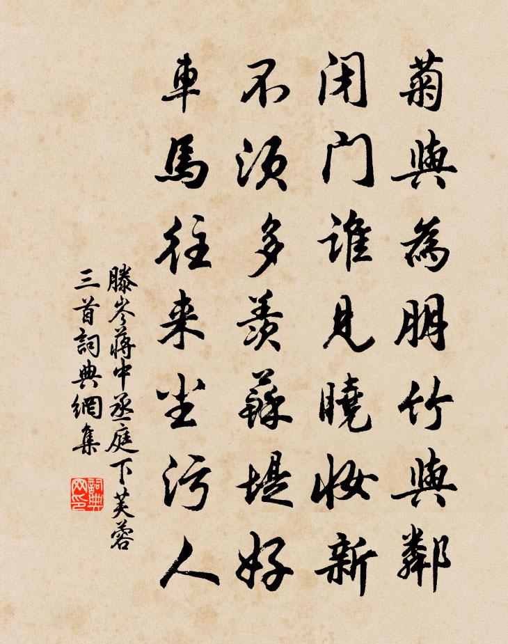詩詞名句歷史字典書法欣賞書法字典國語詞典說文解字康熙字典古漢語字典標 題 作 者 詩 句 蔣中丞庭下芙蓉三首作者:滕岑 朝代:宋代蔣中丞庭下芙蓉三首原文菊與為朋竹與鄰,閉門誰見曉妝新。不須多羨蘇堤好,車馬往來塵污人。詩詞問答問:蔣中丞庭下芙蓉三首的作者是誰?答:滕岑問:蔣中丞庭下芙蓉三首寫於哪個朝代?答:宋代滕岑蔣中丞庭下芙蓉三首書法欣賞蔣中丞庭下芙蓉三首書法作品詩詞推薦喜遷鶯佚名〔宋代〕霜凝雪沍,正斗標臨醜,三陽將近。萬木凋零,群芳消歇,禁苑有梅初盛。異香似薰瀋水,素色瑞如玉瑩。人盡道游峨眉十一首馮時行〔宋代〕雖知仙可學,酒盞喚淵明。未遂山中隱,聊為地上行。留人垂雨意,送客走泉聲。初上乘危慣,歸途更不驚。金陵上李公垂侍郎殷堯藩〔唐代〕海國微茫散曉暾,郁蔥佳氣滿乾坤。六朝空據長江險,一統今歸新地尊。西北諸峰連朔漠,東南眾水合崑崙。願從臨江仙向滈〔宋代〕亂後此身何計是,翠微深處柴扉。即今雙鬢已如絲。虛名將底用,真意在鴟夷。治國無謀歸去好,衡門猶可棲遲。期頤堂龔明之〔宋代〕少年已自樂杯觴,種秫安排老醉鄉。試問幾回供酒事,真成三萬六千場。青玉案王炎〔宋代〕深紅數點吹花絮。又燕子、飛來語。遠水平蕪春欲暮。年年長是,清明時候,故遣人憔悴。竹雞啼罷山村雨。正寥立秋日迓宣諭中丞奉懷宋嗣宗喻良能〔宋代〕繡斧離朝右,羸驂走道周。侵星宵不寐,曝日夕初休。天地方炎暑,山林漫早秋。廣文官舍靜,應念汗交流。管寧員興宗〔宋代〕幼安湖海士,氣香秋空雲。遠目隘九州,誰識中領軍。真命寒柏獨,逸氣崇蘭熏。超遙首陽山,夫子猶二君。題陸秀夫負帝蹈海圖林景熙〔宋代〕紫宸黃閣共樓船,海氣昏昏日月偏。平地已無行在所,丹心猶數中興年。生藏魚腹不見水,死抱龍髯直上天。板蕩春晴王守仁〔明代〕林下春晴風漸和,高崖殘雪已無多。遊絲冉冉花枝靜,青壁迢迢白鳥過。忽向山中懷舊侶,幾從洞口夢煙蘿。客衣赤岸道中呈斯遠趙蕃〔宋代〕小雨洗紅葉,青山舒白雲。秋風有奇處,我友得平分。禪人寫真求贊釋正覺〔宋代〕骨氣能朴,精神愈憨。閒身無所系,冷眼莫相瞞。遠霽摩秋兮天河斗轉,清霜結夜兮月窟蟾寒。和林養正龜符惠詩王邁〔宋代〕殿陛程文被十行,要搜鯁論獻朝堂。點頭只欠饒三好,強項須教受一章。耿耿古心憎骯髒。茫茫俗眼笑荒唐。大官清商怨沈蔚〔宋代〕城上鴉啼斗轉。漸漸玉壺冰滿。月淡寒梅,清香來小院。誰遣鸞箋寫怨。翻錦字、疊疊如愁卷。夢破胡笳,江南煙句鄭準〔唐代〕護犢橫身立,逢人揭尾跳。送稅官仇副使詩十首熊禾〔宋代〕正直男子身,自有神與謀。世治天理現,何必事禱求。請趙季憲主玉虛道院張爚〔宋代〕來自東山東復東,飛空一劍伴絲桐。能令矮屋疏籬下,如在十洲三島中。鍊句入神敲夜月,談玄動客笑春風。聞師挽封州太守趙次公二首楊萬里〔宋代〕鴈峰三徑古,融水貳車新。自此相從後,還成永別晨。只今耆舊傅,誰是老成人。剩欲書遺德,心悲語不真。詠孤桐詩沈約〔南北朝〕龍門百尺時。排雲少孤立。分根蔭玉池。欲待高鸞集。十月菊潘牥〔宋代〕夕陽西去一憑欄,眼底黃花自歲寒。姚魏終皆非正色,請君細把楚騷看。名句推薦人者多欲,其性尚私。來俊臣《羅織經·閱人卷第一》 與人不求備,檢身若不及佚名《尚書·商書·伊訓》 夜闌更秉燭,相對如夢寐杜甫《羌村》 恨鐵不成鋼曹雪芹《紅樓夢·第九十六回》 止凡人之斗鬩,則堯舜之道,不如寡妻之誨諭。顏之推《顏氏家訓·序致篇》 念佳人、音塵別後,對此應解相思。晁端禮《綠頭鴨·詠月》 鄉淚客中盡,孤帆天際看。孟浩然《早寒江上有懷 / 早寒有懷 / 江上思歸》 枝枝相覆蓋,葉葉相交通。佚名《孔雀東南飛 / 古詩為焦仲卿妻作》 擲地,當作金石聲房玄齡《晉書·列傳·第二十六章》 昔別君未婚,兒女忽成行杜甫《贈衛八處士》