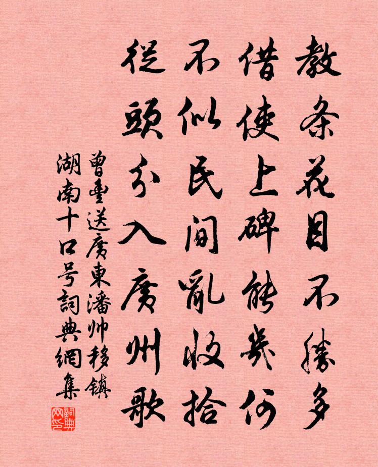 詩詞名句歷史字典書法欣賞書法字典國語詞典說文解字康熙字典古漢語字典標 題 作 者 詩 句 送廣東潘帥移鎮湖南十口號作者:曾豐 朝代:宋代送廣東潘帥移鎮湖南十口號原文教條花目不勝多,借使上碑能幾何。不似民間亂收拾,從頭分入廣州歌。詩詞問答問:送廣東潘帥移鎮湖南十口號的作者是誰?答:曾豐問:送廣東潘帥移鎮湖南十口號寫於哪個朝代?答:宋代曾豐送廣東潘帥移鎮湖南十口號書法欣賞送廣東潘帥移鎮湖南十口號書法作品詩詞推薦池亭夜遊趙善漣〔宋代〕踏月清詩骨,露華夜已深。樹搖知鳥宿,波靜覺魚沉。報國慚無術,思親空有心。躊躇誰與語,唧唧亂蛩吟。嘆息高翥〔宋代〕嘆息閒身不自如,長年借屋客中居。事多隻為人情熟,貧甚還因世法疏。兄弟候歸應有夢,交遊散去更無書。攢心次韻九華葉見思鶴山書院詩魏了翁〔宋代〕天空地迥托吾廬,何處山川不裕如。太極光陰寧有閒,環中事業本無書。道亨誰謂大人否,夷陋不妨君子居。昨夢偈頌一百零四首釋紹曇〔宋代〕共信孤峰頂,霜牙咬菜根。一身塵不染,千古道長存。石竹閒眠鹿,岩松冷掛猿。我行荒草里,汝又入荒村。奉和武功學士舍人紀贈文懿大師淨公徐鉉〔唐代〕霜髯病叟掩閒扃,禪客相尋有故情。每憶江南初識面,至今猶得愛才名。戲贈高述六言黃庭堅〔宋代〕江湖心計不淺,翰墨風流有餘。相期乃千載事,要須讀五車書。送提刑李學士移使東路陳師道〔宋代〕襟袖從前相向開,倡酬於此未多陪。身更寵辱談彌勝,路別東西意自哀。隱几忘言終不近,白頭青簡兩相催。孰知覺來儲泳〔宋代〕西風吹夢過錢塘,獨上孤山叩冷香。紙帳四垂燈影薄,覺來疑是月錯黃。再用前韻張九成〔宋代〕憑誰為斲鳳凰枝,欲寄朱弦寫我思。著葉浪同煙雨里,開花獨向晚霜時。羞隨燕麥爭春色,故伴喬松棲敗籬。喚取桃源篇權德輿〔唐代〕小年嘗讀桃源記,忽睹良工施繪事。岩徑初欣繚繞通,溪風轉覺芬芳異。一路鮮雲雜彩霞,漁舟遠遠逐桃花。漸入菩薩蠻·翠翹金縷雙鸂鶒溫庭筠〔唐代〕翠翹金縷雙鸂鶒,水紋細起春池碧。池上海棠梨,雨晴花滿枝。繡衫遮笑靨。菸草黏飛蝶。青瑣對芳菲,玉關音信丹霞誧法弟新建暖堂以頌慶之釋子淳〔宋代〕暖堂新構侵雲表,桂月松風常滿抱。玉燭光中靜應時,言前妙唱般陽道。採桑行顧禧〔宋代〕男耕女蠶治有餘,使君何不思。使君策馬城南隅,妾歸深閣繅新絲。贈無咎以既見君子云胡不喜為韻八首張耒〔宋代〕觸有羸其角,進有跋其胡。膏車秣吾馬,白日在修途。雖乏亡何杯,頗多未見書。力學致事功,良田本深鋤。齊州送祖三 / 河上送趙仙舟 / 淇上別趙仙舟王維〔唐代〕相逢方一笑,相送還成泣。祖帳已傷離,荒城復愁入。天寒遠山淨,日暮長河急。解纜君已遙,望君猶佇立。代賣薪女贈諸妓白居易〔唐代〕亂蓬為鬢布為巾,曉踏寒山自負薪。一種錢塘江畔女,著紅騎馬是何人?農家陸游〔宋代〕吳農耕澤澤,吳牛耳濕濕。農功何崇崇,農事常汲汲。冬休築陂防,丁壯皆雲集。春耕人在野,農具已山立。房櫳送賀知章入道姚鵠〔唐代〕若非堯運及垂衣,肯許巢由脫俗機。太液始同黃鶴下,仙鄉已駕白雲歸。還披舊褐辭金殿,卻捧玄珠向翠微。羈束答李泉州元善劉克莊〔宋代〕平生陳無己,白首欠吟債。未嘗交馬呂,況肯見章蔡。附熱生可鄙,中寒死亦快。吾方尚此友,巾車與同載。前瞻天慶知觀蕭惟清寫予真求贊周必大〔宋代〕塵滿形容雪滿頭,分無仙骨到瀛洲。希夷更請旁人看,曾急流中勇退不。名句推薦非得賢之難,用 之難。非用之難,信之難。房玄齡《晉書·列傳·第二十二章》 以亂攻治者亡,以邪攻正者亡,以逆攻順者亡韓非及後人《韓非子·初見秦》 人生不滿百,常懷千歲憂。佚名《增廣賢文·上集》 魯女東窗下,海榴世所稀。李白《詠鄰女東窗海石榴》 君子和而不同,小人同而不和。孔子弟子《論語·子路篇》 夜寒驚被薄,淚與燈花落納蘭性德《菩薩蠻·蕭蕭幾葉風兼雨》 落盡梨花春又了。滿地殘陽,翠色和煙老。梅堯臣《蘇幕遮·草》 本來無一物,何處惹塵埃!惠能《菩提偈》 林鶯啼到無聲處,青草池塘獨聽蛙。曹豳《春暮·門外無人問落花》 木落雁南度,北風江上寒。孟浩然《早寒江上有懷 / 早寒有懷 / 江上思歸》