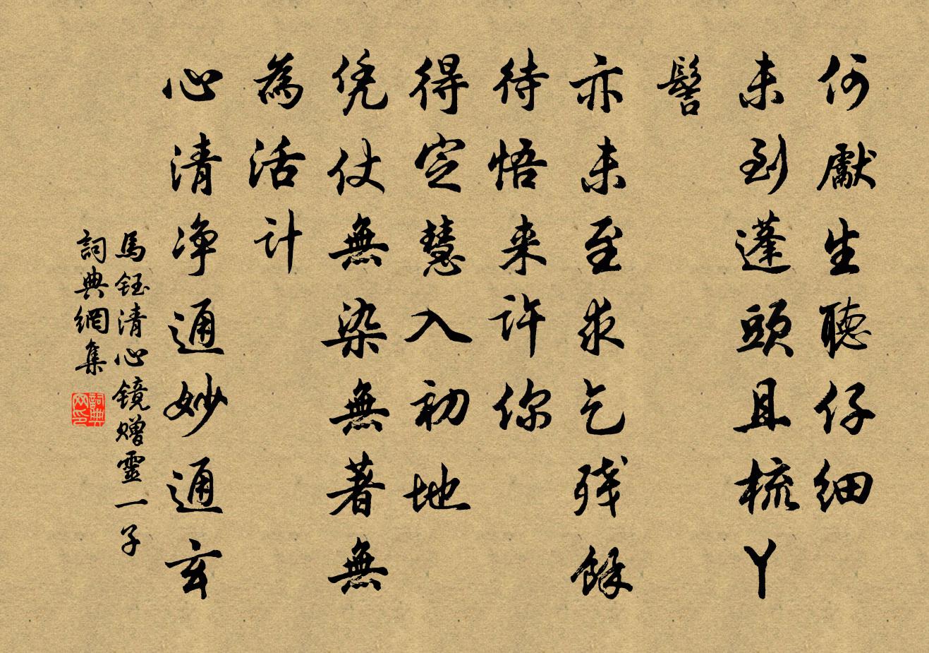 詩詞名句歷史字典書法欣賞書法字典國語詞典說文解字康熙字典古漢語字典標 題 作 者 詩 句 清心鏡 贈靈一子作者:馬鈺 朝代:元代清心鏡 贈靈一子原文何先生,聽仔細。未到蓬頭,且梳丫髻。亦未至、求乞殘餘,待悟來許你。得定慧,入初地。憑仗無染無著,無為活計。心清淨、通妙通玄,詩詞問答問:清心鏡 贈靈一子的作者是誰?答:馬鈺問:清心鏡 贈靈一子寫於哪個朝代?答:元代問:清心鏡 贈靈一子是什麼體裁?答:詞馬鈺清心鏡 贈靈一子書法欣賞清心鏡 贈靈一子書法作品詩詞推薦山中老宿釋文珦〔宋代〕雲壑居來歲月長,千株松下一間房。掃空心地苕花帚,熏徹根塵柏子香。施法定應拈塵柄,接人曾不下禪床。生緣牛水滴邵清甫〔宋代〕銅牛肚裡雖無物,中有深深似澗淵。牧童不暇閒吹笛,苦為詩人滴硯泉。句吳中復〔宋代〕前有牧之之風流,後有元之之篇詠。和陸郎中送出關姜特立〔宋代〕得失乘除誰使然,茲行猶作赤城仙。支風給雨元無禁,借竹判花不費錢。偈五首釋志璇〔宋代〕休去,歇去,一切萬年去,寒灰枯木去,古廟裡香爐去,一條白練去。中岩十八詠碧筠亭晁公溯〔宋代〕蕭然一叢竹,何當舉似人。不可妄認此,青青為法身。題武陵洞五首曹唐〔唐代〕此生終使此身閒,不是春時且要還。寄語桃花與流水,莫辭相送到人間。溪口回舟日已昏,卻聽雞犬隔前村。殷勤梁燕黃庚〔宋代〕梁間兩處燕成窠,來往銜泥帶落花。昵昵並頭休巧語,相依總在別人家。寄龔漕六首吳芾〔宋代〕自古知心不易逢,君心還與我心同。縱令自擇交成契,更有何人得似公。從拜陵登京峴詩鮑照〔南北朝〕孟冬十月交。殺盛陰欲終。風烈無勁草。寒甚有凋松。軍井冰晝結。士馬氈夜重。晨登峴山首。霜雪凝未通。息鞍聞子規雍陶〔唐代〕百鳥有啼時,子規聲不歇。春寒四鄰靜,獨叫三更月。法吏楊維楨〔元代〕法吏本止虐,非以虐為屠。仁君除肉刑,仁吏泣丹書。況以私怒逞,鍛鍊及非辜。冥理絕好還,天網元費疏。懷哉晚步江上陸游〔宋代〕萬里橋邊帶夕陽,隔江漁市似清湘。山林獨往吾何恨,車馬交流渠自忙。高柳陰中扶拄杖,平沙穩處據胡床。故人東莊小留四首陳造〔宋代〕夾溝欲插柳千株,繞舍先營五畝蔬。供爨禦冬須次第,西歸新得務農書。邊景曾邍〔宋代〕匹馬來逢寒草秋,淮雲一片隔神州。黃昏燈火西津渡,白晝風煙北固樓。猶有斷碑知晉宋,誰將遺石問孫劉。天荒山齋陳與義〔宋代〕雖愧荷鉏叟,朝來亦不閒。自剪牆角樹,盡納溪西山。經行天下半,送老此途間。日暮煙生嶺,離離飛鳥還。以人生五馬貴莫受侵為韻送胡獻叔守邵陽方岳〔宋代〕借籌渭陽幕,邊畫分毫毛。邵州二千里,能勿鑒寐勞。點絳唇(月夜)趙長卿〔宋代〕離緒千重,角聲偏著羈人枕。那堪酒醒。句引愁難整。門鎖黃昏,月浸梅花冷。人初靜。斗垂天迥。雁落清江影。頌一百則釋重顯〔宋代〕盧公付了亦何憑,坐倚休將繼祖燈。堪對暮雲歸未合,遠山無限碧層層。句魏野〔宋代〕放人少處先登第,舉族貧時已受官。名句推薦便縱有千種風情,更與何人說?柳永《雨霖鈴·寒蟬淒切》 劍花寒,夜坐歸心壯,又是他鄉。張可久《滿庭芳·客中九日》 平生不做皺眉事,世上應無切齒人。佚名《增廣賢文·上集》 東飛烏鵲西飛燕。盈盈一水經年見。陳師道《菩薩蠻·七夕》 裳裳者華,其葉湑兮。佚名《裳裳者華》 驚塞雁,起城烏,畫屏金鷓鴣。溫庭筠《更漏子·柳絲長》 萋萋芳草小樓西,雲壓雁聲低。劉基《眼兒媚·秋思》 一別家山音信杳,百種相思,腸斷何時了。施耐庵《蝶戀花·一別家山音信杳》 江亭暇日堪高會,醉諷離騷不解愁邊貢《午日觀競渡》 海畔風吹凍泥裂,枯桐葉落枝梢折。陳羽《從軍行》