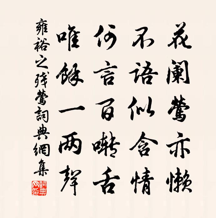 詩詞名句歷史字典書法欣賞書法字典國語詞典說文解字康熙字典古漢語字典標 題 作 者 詩 句 殘鶯作者:雍裕之 朝代:唐代殘鶯原文花闌鶯亦懶,不語似含情。何言百囀舌,唯餘一兩聲。詩詞問答問:殘鶯的作者是誰?答:雍裕之問:殘鶯寫於哪個朝代?答:唐代問:殘鶯是什麼體裁?答:五絕雍裕之殘鶯書法欣賞殘鶯書法作品注釋全唐詩:卷471-15詩詞推薦月華清(梨花)朱淑真〔宋代〕雪壓庭春,香浮花月,攬衣還怯單保欹枕裴回,又聽一聲乾鵲。粉淚共、宿雨闌乾,清夢與、寒雲寂寞。除卻,是月下李新〔宋代〕俗意款能免,高情誰與論。惟憐今夜月,依舊照衡門。奉和襲美酒中十詠酒星陸龜蒙〔唐代〕萬古醇酎氣,結而成晶熒。降為嵇阮徒,動與尊罍並。不獨祭天廟,亦應邀客星。何當八月槎,載我游青冥。月中行/月宮春陳允平〔宋代〕鬢雲斜插映山紅。春里澹香融。自攜紈扇出簾櫳。意欲撲飛蟲。薔薇架下偏宜酒,纖縴手、自引金鍾。倦歌佯醉倚代寄邊人鄭準〔唐代〕君去不來久,悠悠昏又明。片心因卜解,殘夢過橋驚。聖澤如垂餌,沙場會息兵。涼風當為我,一一送砧聲。偈六十三首釋道寧〔宋代〕開門待知識,知識不來過。知識既過,憑何施設。金果早期猨摘去,玉花晚後鳳銜來。宜甫家有金鈴菊客未這識因代菊贈宜甫司馬光〔宋代〕主人倦邀客,寂寞委蒼苔。此日開無益,明年不復開。即席重賦且約再游二首陳與義〔宋代〕牆頭花定覺風闌,牆外池深酒亦寒。馬健莫愁歸路遠,詩成未落俗人看。釣魚不用尋溫水,濯發真如到洧盤。一笑輯句招王國正四首項安世〔宋代〕萬里相逢貪握手,蓬門今始為君開。留連城郭今如此,有底忙時不肯來。壽利州趙漕李曾伯〔宋代〕幾載星軺惠漢關,埴培壽脈一分寬。數絲鶴鬢因民白,一片鷗心為國丹。綠野高風雖獨慕,黃花晚節正爭看。動名柳耳李劉〔宋代〕風絮起時無纊塞,雨絲添處有珠垂。黃鶯說盡千般語,舞困三眠總不知。水調歌頭(壽黃殿護母)王邁〔宋代〕天上一燈滿,引起萬燈明。不知今夕何夕,平地有蓬瀛。西母瑤池稱壽,南守鋒車催覲,二美一時並。一點魁星現聞里謠效古歌李紳〔唐代〕鄉里兒,桑麻鬱郁禾黍肥,冬有襤襦夏有絺。兄鋤弟耨妻在機,夜犬不吠開蓬扉。鄉里兒,醉還飽,濁醪初熟勸翁夜觀汝溪二侄象棋四首錢時〔宋代〕伏險藏機深復深,旁觀袖手獨沈吟。忍將局上閒棋子,礙卻怡怡兄弟心。送楊主簿項安世〔宋代〕誠齋四海一先生,詩滿江湖以字行。 * 親傅誰得缽,異聞獨立子趨庭。未能暇日詢三得,枉作經年共一城。眼底題海陵寓舍四首之四賀鑄〔宋代〕千里家園安在哉,羈棲猶喜占池台。酒非從事斷年別,風是故人彌日來。黃鳥綿蠻紫椹熟,白鷗瀺灂綠萍開。頗知永明樂 一謝朓〔南北朝〕帝圖開九有。皇風浮四溟。永明一為樂。鹹池無復靈。送陽翟張主簿之任獨孤及〔唐代〕舊聞陽翟縣,西接鳳高山。作吏同山隱,知君處劇閒。少年當效用,遠道豈辭艱。遲子揚名後,方期彩服還。惜黃花慢·孤雁賀雙卿〔清代〕碧盡遙天,但暮霞散綺,碎剪紅鮮。聽時愁近,望時怕遠,孤鴻一個,去向誰邊。素霜已冷蘆花渚,更休倩、鷗鷺賢者之孝二百四十首樂頤之林同〔宋代〕痛殊未易忍,絕不一呻吟。豈復知身疾,惟愁戚母心。名句推薦非知之難也,處知則難也。韓非及後人《韓非子·說難》 赤日炎炎似火燒,野田禾稻半枯焦。施耐庵《水滸傳·第十六回》 莫信直中直,須防仁不仁。佚名《增廣賢文·上集》 寧為太平犬,莫作亂離人!馮夢龍《醒世恆言·卷三》 窗前竹葉,凜凜狂風折。張淑芳《滿路花·冬》 關山四面絕,故鄉幾千里。劉昶《斷句》 細看茱萸一笑,詩翁健似常年。張可久《風入松·九日》 兒童漫相憶,行路豈知難。元好問《倪莊中秋》 千點寒梅曉角中,一番春信畫樓東。楊慎《鷓鴣天·元宵後獨酌》 無限春風來海上。便與春工。染得桃紅似肉紅。蘇軾《減字木蘭花·立春》