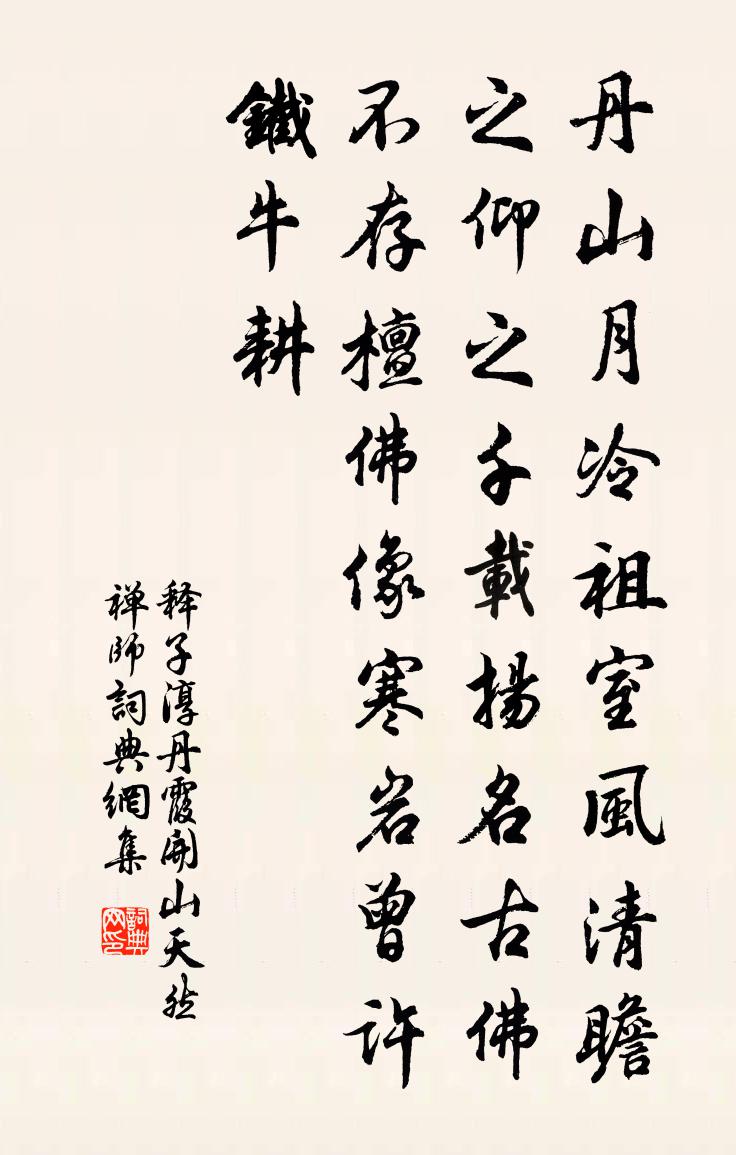 詩詞名句歷史字典書法欣賞書法字典國語詞典說文解字康熙字典古漢語字典標 題 作 者 詩 句 丹霞開山天然禪師作者:釋子淳 朝代:宋代丹霞開山天然禪師原文丹山月冷,祖室風清。瞻之仰之,千載揚名。古佛不存檀佛像,寒岩曾許鐵牛耕。詩詞問答問:丹霞開山天然禪師的作者是誰?答:釋子淳問:丹霞開山天然禪師寫於哪個朝代?答:宋代釋子淳丹霞開山天然禪師書法欣賞丹霞開山天然禪師書法作品詩詞推薦句李白〔唐代〕霜結梅梢玉,陰凝竹乾銀。下第有懷章碣〔唐代〕故鄉朝夕有人還,欲作家書下筆難。滅燭何曾妨夜坐,傾壺不獨為春寒。遷來鶯語雖堪聽,落了楊花也怕看。但使兩頭纖纖范成大〔宋代〕兩頭纖纖小秤衡,半白半黑月未明。腷腷膊膊扣戶聲,磊磊落落金盤冰。中秋扶病對月蘇泂〔宋代〕久病頭如石,中秋月似盆。起瞻惟一色,歸臥只空村。信有鄜州見,曾同秘省論。微吟到河漢,桂樹忽飛翻。再和堯夫同前韓維〔宋代〕教得新聲十二弦,每逢嘉客便開筵。春湖水綠花爭發,好引紅妝上畫船。期盧嵩,枉書稱日暮無馬不赴,以詩答韋應物〔唐代〕佳期不可失,終願枉衡門。南陌人猶度,西林日未昏。庭前空倚杖,花里獨留樽。莫道無來駕,知君有短轅。被詔考制科呈胡武平內翰三首王珪〔唐代〕忝班清禁接嚴徐,詔侍延英訪對初。滄海煙霞連太液,丹宵日月近雕浴。明廷已奏河汾策,紫府誰將姓字書。從此郊廟朝會歌辭建隆乾德朝會樂章二十八首佚名〔宋代〕神化妙無方,巍巍邁百王。鶴書搜隱逸,龍陛策賢良。拱揖朝群後,賓筵闢四方。洪圖基億載,淳曜德彌光。三謠蟠木謠白居易〔唐代〕蟠木蟠木,有似我身;不中乎器,無用於人。下擁腫而上轔菌,桷不桷兮輪不輪。天子建明堂兮既非梁棟,諸侯斫竹軒出筍曾幾〔宋代〕問訊東軒竹,新萌頗不齊。文章藏霧豹,頭角觸藩羝。逸氣先騰上,長鞭半落西。後來堪底用,采攝付山妻。資政入村造壽器謾賦陳宗遠〔宋代〕功成身退從來少,綠野超然洗俗埃。閒出西疇營六檟,勝傳南極映三槐。迎門村婦攜兒拜,遮道田翁帶犬回。競喜神君歌十首劉克莊〔宋代〕武當並灌口,聞說燬於兵。獨有東南遠,人神尚太平。聞沈元誠歸自臨漳喜而奉寄陳傅良〔宋代〕荔圃班班熟,蠔房個個肥。我雖緣此誤,公亦為何歸。吏事生衣垢,家山減帶圍。不無華袞字,卿月更光輝。文饒自昌國以詩見寄次韻二首陳瓘〔宋代〕海邦渺渺知何在,風入高帆頃刻過。何似一樽湖上酒。月明安穩照寒波。柳宋祁〔宋代〕濯濯縈春晚,依依帶暝饒。楚宮皆餓死,無計學織腰。澗舖嶺道中四首趙蕃〔宋代〕鉅竹差差合,青杉裊裊長。人多表池檻,此乃亘山岡。旅思陸游〔宋代〕百病集殘骸,閒遊且散懹。旅裝如遠役,蔬食似長齋。買藥停山步,求醫過縣街。春寒殊未已,閉戶夜燃秸。送鄭務拜伯父綦毋潛〔唐代〕名公作逐臣,驅馬拂行塵。舊國問鄖子,勞歌過郢人。一川花送客,二月柳宜春。奉料竹林興,寬懷此別晨。洋州三十景蓼嶼鮮于侁〔宋代〕盈枝紅欲滴,照水色更好。朝暮幾回新,何用催秋老。仙跡岩題詩二十三首鐘樓佚名〔宋代〕重樓高聳丹霄外,深夜聲摩碧落中。神通無量鴻音遠,永鎮名山有顯功。名句推薦松下茅亭五月涼,汀沙雲樹晚蒼蒼。戴叔倫《題稚川山水》 手攜稚子夜歸院,月冷空房不見人。白居易《為薛台悼亡》 芙蓉金菊斗馨香。天氣欲重陽。晏殊《訴衷情·芙蓉金菊斗馨香》 自我來黃州,已過三寒食。蘇軾《寒食雨二首》 空山新雨後,天氣晚來秋。王維《山居秋暝》 空對著,山中高士晶瑩雪曹雪芹《終身誤》 樂聽其音則知其俗,見其俗則知其化。劉安及其門客《淮南子·主術訓》 似此星辰非昨夜,為誰風露立中宵。黃景仁《綺懷》 仁暴者,皆亡國者也。韓非及後人《韓非子·八說》 飄風不終朝,驟雨不終日。老子《老子·道經·第二十三章》