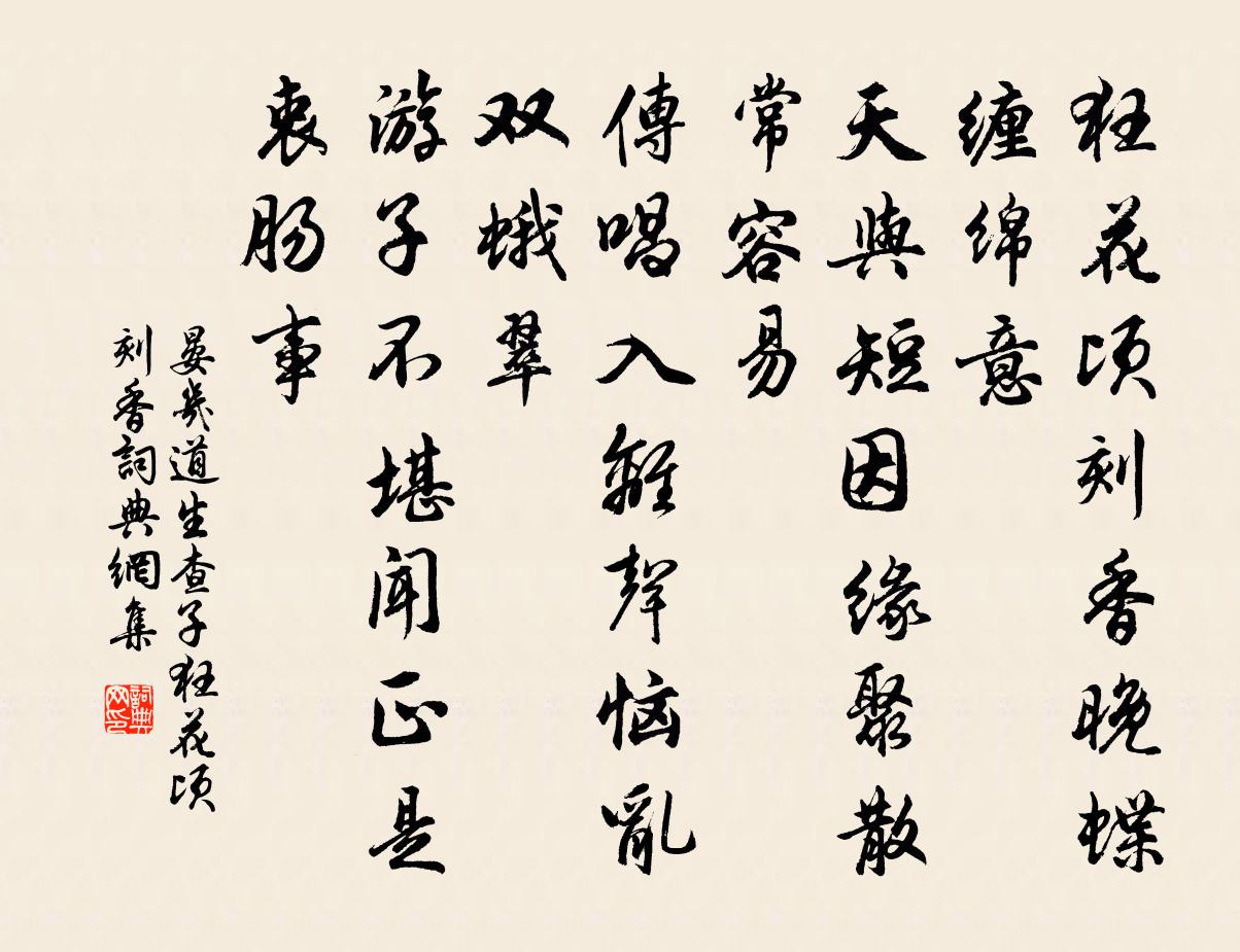 詩詞名句歷史字典書法欣賞書法字典國語詞典說文解字康熙字典古漢語字典標 題 作 者 詩 句 生查子·狂花頃刻香作者:晏幾道 朝代:宋代生查子·狂花頃刻香原文狂花頃刻香,晚蝶纏1|1綿意。天與短因緣,聚散常容易。傳唱入離聲,惱亂雙蛾翠。遊子不堪聞,正是衷腸事。詩詞問答問:生查子·狂花頃刻香的作者是誰?答:晏幾道問:生查子·狂花頃刻香寫於哪個朝代?答:宋代問:生查子·狂花頃刻香是什麼體裁?答:詞問:晏幾道的名句有哪些?答:晏幾道名句大全晏幾道生查子·狂花頃刻香書法欣賞生查子·狂花頃刻香書法作品注釋狂花:春花盛開。晚蝶:秋蝶。唐彥謙《秋晚高樓》:“晚蝶飄零驚宿雨。”離聲:離別的歌聲樂曲。雙蛾:雙眉。標籤:離別,寫景詩詞推薦臨溪樓敖邁〔宋代〕花溪老子昔喜花,紅雲紫霞香滿家。竹溪逸士昔愛竹,翠靄蒼煙陰繞屋。羌茲偉人臨溪樓,唐相之裔來溪頭。奄有戚氏·晚秋天柳永〔宋代〕晚秋天,一霎微雨灑庭軒。檻菊蕭疏,井梧零亂,惹殘煙。悽然,望江關,飛雲黯淡夕陽間。當時宋玉悲感,向此鵲橋仙·送粉卿行辛棄疾〔宋代〕轎兒排了,擔兒裝了,杜宇一聲催起。從今一步一回頭,怎睚得、一千餘里。舊時行處,舊時歌處,空有燕泥香墜菩薩蠻·月華如水籠香砌孫光憲〔唐代〕月華如水籠香砌,金鐶碎撼門初閉。寒影墮高檐,鉤垂一面簾。碧煙輕裊裊,紅戰燈花笑。即此是高唐,掩屏秋夢送狄宗亨王昌齡〔唐代〕秋在水清山暮蟬,洛陽樹色鳴皋煙。送君歸去愁不盡,又惜空度涼風天。送率府程錄事還鄉杜甫〔唐代〕鄙夫行衰謝,抱病昏忘集。常時往還人,記一不識十。 程侯晚相遇,與語才傑立。熏然耳目開,頗覺聰明入。 點絳唇·縣齋愁坐作葛勝仲〔宋代〕秋晚寒齋,藜床香篆橫輕霧。閒愁幾許。夢逐芭蕉雨。 雲外哀鴻,似替幽人語。歸不去。亂山無數。斜日荒城鼓荷葉杯·五月南塘水滿毛奇齡〔清代〕五月南塘水滿,吹斷,鯉魚風。小娘停棹濯纖指,水底,見花紅。虞美人·曲闌深處重相見納蘭性德〔清代〕曲闌深處重相見,勻淚偎人顫。淒涼別後兩應同,最是不勝清怨月明中。半生已分孤眠過,山枕檀痕涴。憶來何事滿宮花·月沉沉尹鶚〔唐代〕月沉沉,人悄悄,一炷後庭香裊。風流帝子不歸來,滿地禁花慵掃。離恨多,相見少,何處醉迷三島?漏清宮樹子有約司馬光〔宋代〕黃梅時節家家雨,青草池塘處處蛙。有約不來過夜半,閒敲棋子落燈花。歸朝歡·別岸扁舟三兩隻柳永〔宋代〕別岸扁舟三兩隻。葭葦蕭蕭風淅淅。沙汀宿雁破煙飛,溪橋殘月和霜白。漸漸分曙色。路遙山遠多行役。往來人,唐禪社首樂章·順和賀知章〔唐代〕至哉含柔德,萬物資以生。常順稱厚載,流謙通變盈。聖心事能察,增廣陳厥誠。黃祇僾如在,泰折俟鹹亨。謁金門·楊花落李清臣〔宋代〕楊花落。燕子穿朱閣。苦恨春醪如水薄。閒愁無處著。去年今日王陵舍,鼓角秋風。千歲遼東。回首人間萬事空。步蟾宮·東風又送酴釄信佚名〔清代〕東風又送酴釄信,早吹得、愁成潘鬢。花開猶似十年前,人不似、十年前俊。水邊珠翠香成陣。也消得、燕窺鶯認鷓鴣天·惜別嚴仁〔宋代〕一曲危弦斷客腸。津橋捩柂轉牙檣。江心雲帶蒲帆重,樓上風吹粉淚香。瑤草碧,柳芽黃。載將離恨過瀟湘。請君絕句杜甫〔唐代〕兩個黃鸝鳴翠柳,一行白鷺上青天。窗含西嶺千秋雪,門泊東吳萬里船。雨霖鈴·寒蟬淒切柳永〔宋代〕寒蟬淒切,對長亭晚,驟雨初歇。都門帳飲無緒,留戀處,蘭舟催發。執手相看淚眼,竟無語凝噎。念去去,千里雨晴王駕〔唐代〕雨前初見花間蕊,雨後兼無葉里花。蛺蝶飛來過牆去,卻疑春色在鄰家。代贈二首·其一李商隱〔唐代〕樓上黃昏欲望休,玉梯橫絕月中鉤。(月中鉤 一作:月如鉤)芭蕉不展丁香結,同向春風各自愁。名句推薦國無常強,無常弱。奉法者強,則國強;奉法者弱,則國弱。韓非及後人《韓非子·有度》 安得倚天劍,跨海斬長鯨。李白《臨江王節士歌》 得賢者安存,失賢者危亡戴聖《大戴禮記·保傅第四十八》 蒼旻霽涼雨,石路無飛塵。岑參《暮秋山行》 江村獨歸處,寂寞養殘生。杜甫《奉濟驛重送嚴公四韻》 西園有分,斷柳淒花,似曾相識。吳文英《瑞鶴仙·秋感》 人歸落雁後,思發在花前。薛道衡《人日思歸》 得天下英才而教育之。孟子《孟子·盡心章句上·第二十節》 但恨處非位,愴悢使心傷。阮籍《詠懷八十二首·其七十九》 帶長劍兮挾秦弓,首身離兮心不懲。屈原《國殤》