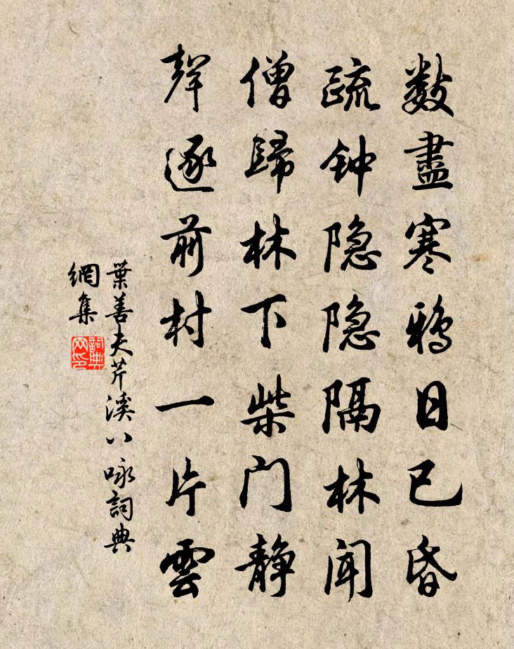 詩詞名句歷史字典書法欣賞書法字典國語詞典說文解字康熙字典古漢語字典標 題 作 者 詩 句 芹溪八詠作者:葉善夫 朝代:宋代芹溪八詠原文數盡寒鴉日已昏,疏鍾隱隱隔林聞。僧歸林下柴門靜,聲逐前村一片雲。詩詞問答問:芹溪八詠的作者是誰?答:葉善夫問:芹溪八詠寫於哪個朝代?答:宋代葉善夫芹溪八詠書法欣賞芹溪八詠書法作品詩詞推薦組以時果供饋予以酒為報張舜民〔宋代〕饉歲無時果,秦人饜草茶。開奩驚見李,對客喜浮瓜。為乏瓊瑤報,聊稱旨酒嘉。中郎不憂老,有女可傳家。聞武均州報已復西京陸游〔宋代〕白髮將軍亦壯哉,西京昨夜捷書來。胡兒敢作千年計,天意寧知一日回。列聖仁恩深雨露,中興赦令疾風雷。懸知紹興以後祀五方帝六十首佚名〔宋代〕萬彙揫斂,時惟冬序。蠢爾黎氓,入此室處。酌獻告神,禮以時舉。賴此陰下,民有所怙。題城侍者剡溪圖陸游〔宋代〕暮境侵尋兩鬢絲,湖邊自葺小茆茨。從今步步俱回棹,不獨山陰興盡時。處士妻十首劉克莊〔宋代〕當日獻皇后,逃生屋壁間。何如伴龐老,同入鹿門山。西江月(次韻趙路分)韓淲〔宋代〕脈脈蜂黃蝶粉,盈盈水秀山明。賣花聲里聽吹餳。佳麗芳華韻勝。下上休看舞燕,惺忪一任啼鶯。枕痕屏曲夢關情沖嗇書事曹勛〔宋代〕山居終日不開門,室有南窗氣自溫。人籟暫休天籟息,月華將冷照黃昏。送清涼上人皎然〔唐代〕何意欲歸山,道高由境勝。花空覺性了,月盡知心證。永夜出禪吟,清猿自相應。感舊陸游〔宋代〕君不席見資中名席士有李石席,八月秋席濤供筆力,初為博士不暖席,晚補台郎俄復斥。諸公熟睨亦太息,摧壓至題惠安寺增勝堂王銍〔宋代〕心是華嚴境,圓機更善根。一塵猶可見,十勝不為繁。放鶴掃松逕,呼猿開竹門。妙高峰頂住,客到亦忘言。登白衣寺鐘樓朱翌〔宋代〕憑高真欲馭西風,百里纖毫盡發蒙。樓觀相望秋色里,江山爭麗海光中。雲容入座如相識,足力緣梯尚不窮。肯使因送客過六叔趙蕃〔宋代〕荷衣綠破碎,稻實亂撐拄。秋悲空多風,雲重乃不雨。黃花已成昨,白酒真漫舉。小作談笑期,暫紓追送苦。冷泉林洪〔宋代〕一泓清可沁詩脾,冷暖年來只自知。流出西湖載歌舞,回頭不是在山時。臨江仙(訪梅)劉辰翁〔宋代〕西曲罥衣迷去路,雪銷斷岸無痕。尋花不擬到前村。暖風初轉袖,小徑忽開門。卻憶臨塘橋下馬,暗香不是黃昏。天淨沙·為董針姑作呂止庵〔元代〕玉纖屈損春蔥,遠山壓損眉峰。早是閒愁萬種。忽聽得賣花聲送,繡針兒不待穿絨。次韻師厚病間十首黃庭堅〔宋代〕桃李一春期,松柏千歲永。經玄事寂寞,發白官閒冷。草綠艾如張,波清蜮司影。東里與無趾,渠有幸不幸。白薴歌戴復古〔宋代〕雪為緯,玉為經。一織三滌手,織成一片冰。清如夷齊,可以為衣。陟彼西山,於以採薇。二老堂葛立方〔宋代〕去家才隔水一股,二老堂成三百弓。鴒原暮下沙水暖,雁行夜落霜天空。竹根酌酒不妨醉,花萼斲詩如許工。坐久句許元〔宋代〕芍藥瓊花應有恨,維揚新什獨無名。彭州歌汪元量〔宋代〕彭州昔號小成都,城市繁華錦不如。尚有遺儒頭雪白,見人猶自問詩書。彭州又曰牡丹鄉,花月人稱小雒陽。自笑名句推薦江漢思歸客,乾坤一腐儒。杜甫《江漢》 雖有戈矛之刺,不如恭儉之利也。荀子《荀子·榮辱》 禮者,所以正身也;師者所以正禮也。荀子《荀子·修身》 驚起卻回頭,有恨無人省。蘇軾《卜運算元·黃州定慧院寓居作》 羈心積秋晨,晨積展游眺。謝靈運《七里瀨》 禍褔無不自己求之者。孟子《孟子·公孫丑章句上·第四節》 忙日苦多閒日少,新愁常續舊愁生。陸游《浣溪沙·和無咎韻》 涉江玩秋水,愛此紅蕖鮮。李白《折荷有贈》 福善之門莫美於和睦,患咎之首莫大於內離。班固《漢書·傳·宣元六王傳》 日長籬落無人過,惟有蜻蜓蛺蝶飛。范成大《四時田園雜興·其二》