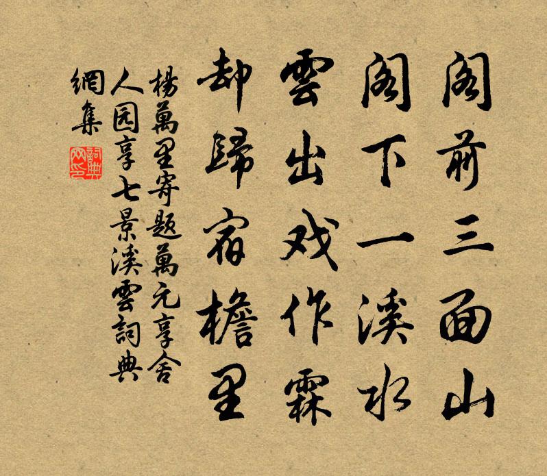 詩詞名句歷史字典書法欣賞書法字典國語詞典說文解字康熙字典古漢語字典標 題 作 者 詩 句 寄題萬元享舍人園享七景溪雲作者:楊萬里 朝代:宋代原文閣前三面山,閣下一溪水。雲出戲作霖,卻歸宿檐里。詩詞問答問:《寄題萬元享舍人園享七景溪雲》的作者是誰?答:楊萬里問:該詩寫於哪個朝代?答:宋代問:楊萬里的名句有哪些?答:楊萬里名句大全書法欣賞寄題萬元享舍人園享七景溪雲書法作品詩詞推薦曲江林寬〔唐代〕曲江初碧草初青,萬轂千蹄匝岸行。傾國妖姬雲鬢重,薄徒公子雪衫輕。瓊鐫狒犭術繞觥舞,金蹙辟邪拏撥鳴。柳簡雲臥趙崇鉘〔宋代〕憶君心事如流水,流向江頭作暮潮。想得潮平沙有雪,白鏗鐵版和 * 。弄筆吟邵雍〔宋代〕人生所貴有精神,既有精神卻不純。弄假像真終是假,將勤補拙總輸勤。因飢得飽飽猶病,為病求安安未真。人誤送人赴沅州任翁卷〔宋代〕舊貢包茅地,中存古意長。去程逢岳雪,上事帶春陽,霧結硃砂氣,波流白芷香。大夫祠寂寞,煩與奠椒漿。九月十日獨游鐘山項安世〔宋代〕天時少佳日,人事多嬰懷。選勝難兩遇,卜征非一乖。平生夢鍾阜,一月榜秦淮。半世跡方近,三旬心始諧。允哲嵩山汪元量〔宋代〕客行天地中,嵩峰何突兀。鳥道阻且修,馬煩行復歇。一入玉女窗,便覺幽興發。好鳥鳴嚶嚶,細草亂如發。石城聞荒雞張嵲〔宋代〕但可摧頹悲失旦,不應風雨誤司晨。書生久已垂華發,豈是當年起舞人。觀中芙蓉盛開王洋〔宋代〕秋木日動搖,秋容日修整,況復白琳宮,焚香事幽屏。胡為彼美人,犯此清淨境。仙官儼環佩,注目朝倒景。豈容應天長馮延巳〔唐代〕石城山下桃花綻,宿雨初收雲未散。南去棹,北歸雁,水闊天遙腸欲斷。倚樓情緒懶,惆悵春心無限。忍淚蒹葭風涇溪羅隱〔唐代〕涇溪石險人競懼,終歲不聞傾覆人。卻是平流無石處,時時聞說有沈淪。寄會稽公徐侍郎(公時在王傅)劉長卿〔唐代〕搖落淮南葉,秋風想越吟。鄒枚入梁苑,逸少在山陰。老鶴無衰貌,寒松有本心。聖朝難稅駕,惆悵白雲深。謁金門(春暮有感)楊冠卿〔宋代〕傷漂泊。負了花前期約。寒食清明都過卻。愁懷無處著。晴日柳陰池閣。風絮斜穿簾幕。簾外鞦韆閒彩索。斷腸人上浙西張帥十首廖行之〔宋代〕榷酤誰雲一切功,軍儲百萬若為豐。能令利入皆公上,從此深根得裕農。論頭賈似道〔宋代〕大頭圓結菢,腦搭淺無多。絲路根根透,光明亮不摩。詠破屏風(一作章孝標詩)姚合〔唐代〕時人嫌古畫,倚壁不曾收。露滴膠山斷,風吹絹海秋。殘雪飛屋裡,片水落床頭。尚勝凡花鳥,君能補綴不。生查子高觀國〔宋代〕飛花澹澹風,破暖疏疏雨。香潤玉階塵,翠濕紗窗霧。鈿箏離雁行,寶篋留釵股。惟有鳳樓魂,夜夜江南路。【南呂】一枝花_不戀蝸角名孫叔順〔元代〕不戀蝸角名,豈問蠅頭利?世情看冷暖,人面逐高低。閒是閒非,僻掉的都伶俐,百年身圖畫裡。本待要快活逍遙金剛隨機無盡頌一合相理分第三十釋印肅〔宋代〕塵塵井覷驢,莫怪目區區。妄迷爭瓦礫,不識夜明珠。謝彭大夫惠寒山詩三首曹勛〔宋代〕平生為物役,年紀積漸老。不省這個意,老得越顛倒。自讀二詩來,迷雲掃空照。我為謝彭翁,且喜無煩惱。劉王花塢方信孺〔宋代〕綠陰到處小舟藏,淺水漂紅五里香。不見芳華舊亭宛,桃花應解笑劉郎。名句推薦桂魄飛來光射處,冷浸一天秋碧。蘇軾《念奴嬌·中秋》 葉落當歸根,雲沉久必起。錢嶫《憫黎詠》 孫郎微笑,坐來聲噴霜竹黃庭堅《念奴嬌·斷虹霽雨》 舊時王謝堂前燕,飛入尋常百姓家。劉禹錫《烏衣巷》 無材可去補蒼天,枉入紅塵若許年。曹雪芹《紅樓夢·第一回》 小人肥口,君子肥身。佚名《增廣賢文·下集》 兩處春光同日盡,居人思客客思家。白居易《望驛台》 自是相思抽不盡,卻教風雨怨秋聲。鄭燮《詠芭蕉》 上苑風煙好,中橋道路平。白居易《洛橋寒食日作十韻》 青春花姊不同時。淒涼生較遲。吳文英《醉桃源·芙蓉》
