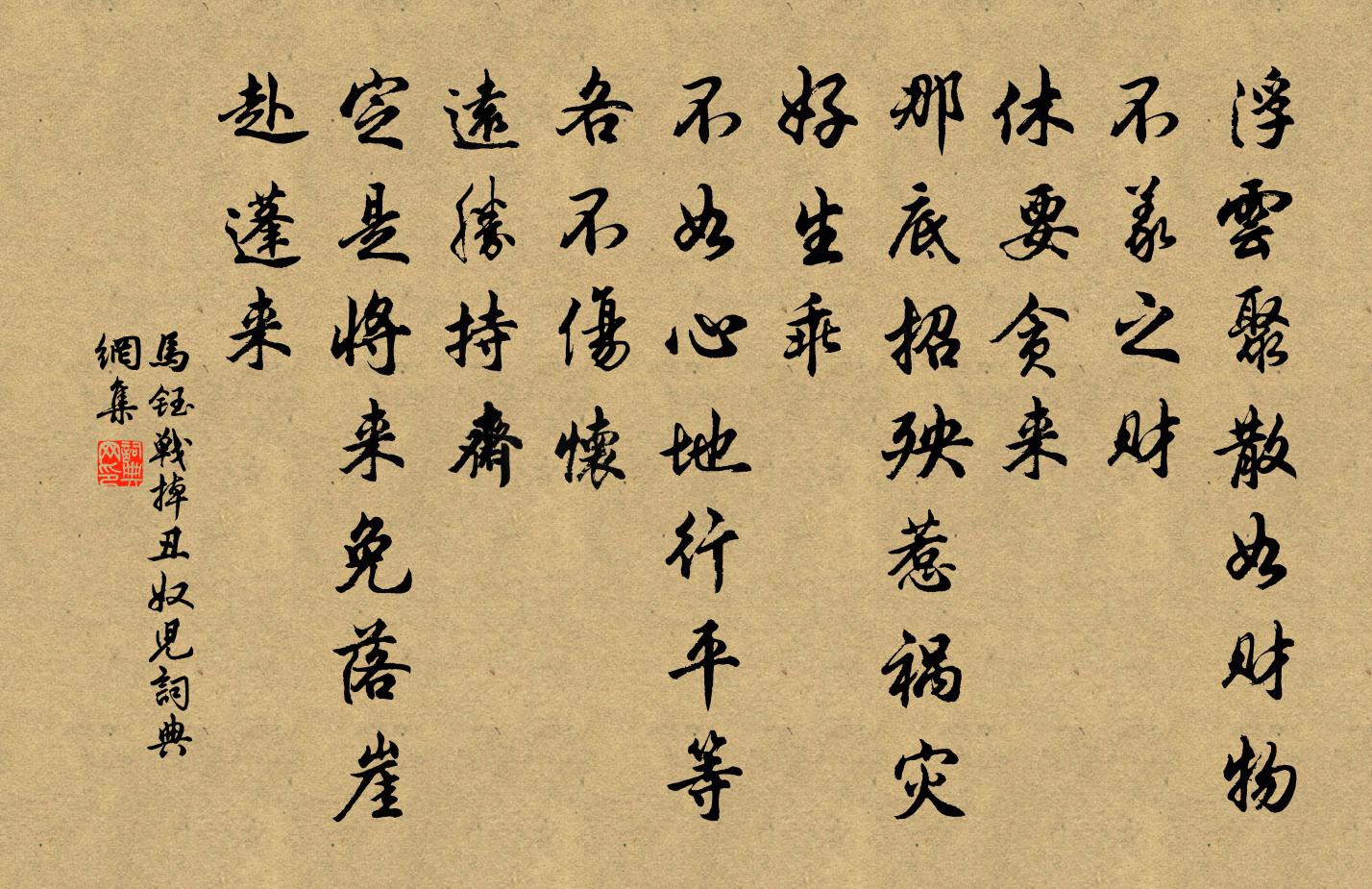 詩詞名句歷史字典書法欣賞書法字典國語詞典說文解字康熙字典古漢語字典標 題 作 者 詩 句 戰掉醜奴兒作者:馬鈺 朝代:元代戰掉醜奴兒原文浮雲聚散如財物,不義之財。休要貪來。那底招殃惹禍災。好生乖。不如心地行平等,各不傷懷。遠勝持齋。定是將來免落崖。赴蓬來。詩詞問答問:戰掉醜奴兒的作者是誰?答:馬鈺問:戰掉醜奴兒寫於哪個朝代?答:元代問:戰掉醜奴兒是什麼體裁?答:詞馬鈺戰掉醜奴兒書法欣賞戰掉醜奴兒書法作品詩詞推薦狼山韓元吉〔宋代〕天外奇峰認九華,路人指點是狼牙。他年刻石題車馬,會遣山前屬漢家。南山羅漢贊十六首黃庭堅〔宋代〕香醉山中夏木陰,來禽磊磊承風霧。山鳥沖飛墮聖前,小僧澡雪羞時供。胡奴知是說法時,故奉金爐聽時事。有說贈薛總管棄官從□陳著〔宋代〕壯年自下退工夫,看破人閒戲劇圖。靈運在家心已放,知章還里計非迂。梅花夢好拋鴛侶,蕙帳閒多引鶴雛。湖海游龍山寺六祖故居也胡寅〔宋代〕范陽盧以仕南遷,卜宅空山不計年。間氣有鍾超象類,美材無匠制方圓。誰能判斷風旛話,等是追隨粥飯緣。攜客句釋惠崇〔宋代〕露寒金掌重,天近玉繩低。賢者之孝二百四十首二王林同〔宋代〕要以孝行取,寧將學業論。錫無慚玉友,銓可謂金昆。鷓鴣天元好問〔金代〕憔悴鴛鴦不自由。鏡中鸞舞只堪愁。庭前花是同心樹,山下泉分兩玉流。金絡馬,木蘭舟。誰家紅袖水西樓。春風頌古一百首釋智愚〔宋代〕以玉抵鵲,以鼠為璞。眇然視之,太虛寥廓。交傍晚戴帥初除夕並寄弟觀二首陳著〔宋代〕兄弟相依友在鄰,又添一歲話情真。梅花素入兩年眼,椒酒難醫百病身。敝帚自珍從眾笑,破皮非怪亦多嗔。柴門嚴陵釣台下作權德輿〔唐代〕絕頂聳蒼翠,清湍石磷磷。先生晦其中,天子不得臣。心靈棲顥氣,纓冕猶緇塵。不樂禁中臥,卻歸江上春。潛驅偈三首釋進英〔宋代〕報慈有一公案,諸方未曾結斷。幸遇改旦拈出,各請高著眼看。江月二首李流謙〔宋代〕秋江與秋月,誰遣恰相和。借我蓑衣著,三人亦未多。相和歌辭。採蓮曲徐彥伯〔唐代〕妾家越水邊,搖艇入江煙。既覓同心侶,復采同心蓮。折藕絲能脆,開花葉正圓。春歌弄明月,歸棹落花前。題淵明採菊圖子璿所作趙蕃〔宋代〕雲出無心還自歸,亂峰明處日西微。白衣不至東籬寂,滿把菊花風動衣。次開祖使君韻兼呈端叔大夫聖域長老晁補之〔宋代〕神龍異凡馬,頭角要須斂。崢嶸法雲窟,跳出有家范。金剛不吐焰,已落天魔膽。一派感慈中,無波寒湛湛。是波小寒食周文璞〔宋代〕從來寒食多風雨,不料窮鄉亦管弦。壯歲心情悲昨夢,異鄉時序感漢年。偶隨遊子來溪上,因與棠梨立路邊。從此龜溪即事五首高斯得〔宋代〕頑雲蔀鶴嶺,積雪明龜溪。枌榆社已到,斯焉卜幽棲。亦有好事人,除館溪之西。門巷寄深窈,青山有攀躋。平生十一月五夜風雪寒甚燃薪取暖戲作五字陸游〔宋代〕束薪從澗底,及此不時求。力比鵝黃酒,功如狐白裘。分才具糜粥,餘事暖衾稠。復恐成驕惰,三更起飯牛。即事陳允平〔宋代〕重重簾幕燕翩翩,塵鎖朱樓十四弦。榆火漸催寒食節,海棠花畔縛鞦韆。次韻和岳醵飲西峰寺分韻成詩十四首見寄陳著〔宋代〕春夏交承紅與綠,歲寒三友松與竹。我是蟾宮老桂枝,獨受上天風霜足。名句推薦沖天香陣透長安,滿城盡帶黃金甲。黃巢《不第後賦菊》 東風漸綠西湖柳,雁已還、人未南歸。周密《高陽台·送陳君衡被召》 流水便隨春遠,行雲終與誰同。晏幾道《臨江仙·鬥草階前初見》 白鳥一雙臨水立,見人驚起入蘆花。戴復古《江村晚眺》 志,氣之帥也。孟子《孟子·公孫丑章句上·第二節》 相思了無益,悔當初相見。朱彝尊《憶少年·飛花時節》 塞上秋風鼓角,城頭落日旌旗。元好問《江月晃重山·初到嵩山時作》 離愁萬種,醉鄉一夜頭白。施耐庵《念奴嬌·天南地北》 人胸中各有個聖人,只自信不及,都自埋倒了。王陽明《傳習錄·卷下·門人陳九川錄》 霧失樓台,月迷津渡。秦觀《踏莎行·郴州旅舍》