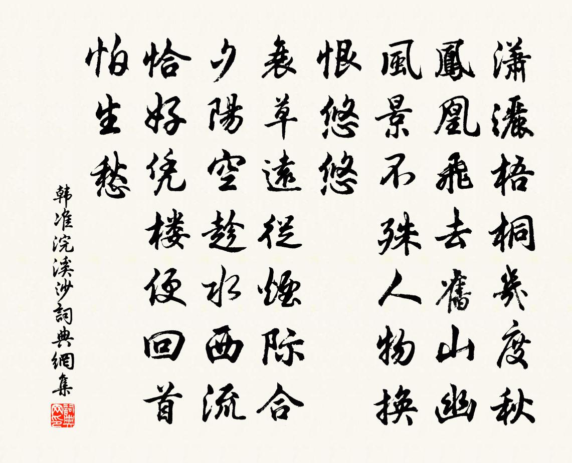 詩詞名句歷史字典書法欣賞書法字典國語詞典說文解字康熙字典古漢語字典標 題 作 者 詩 句 浣溪沙作者:韓準 朝代:宋代浣溪沙原文瀟灑梧桐幾度秋。鳳凰飛去舊山幽。風景不殊人物換,恨悠悠。衰草遠從煙際合,夕陽空趁水西流。恰好憑樓便回首,怕生愁。詩詞問答問:浣溪沙的作者是誰?答:韓準問:浣溪沙寫於哪個朝代?答:宋代問:浣溪沙是什麼體裁?答:詞韓準浣溪沙書法欣賞浣溪沙書法作品詩詞推薦贈花李群玉〔唐代〕酒為看花醞,花須趁酒紅。莫令芳樹晚,使我綠尊空。金谷園無主,桃源路不通。縱非乘露折,長短盡隨風。次韻君俞三詩時在山下李復〔宋代〕西陵大火流,南融已頹征。涼風拂庭樹,槭槭起秋聲。遙夜抱膝坐,耿耿河漢明。豈無尊中酒,非君誰與傾。偶書邵雍〔宋代〕美食無使饜,饜則不能受。善人無使倦,倦則不能久。官小拜人喜,官高拜人恥。官職自外來,中心何若此。登望京樓賦令狐綯〔唐代〕夷門一鎮五經秋,未得朝天不免愁。因上此樓望京國,便名樓作望京樓。用十梅韻簽馮簿王炎〔宋代〕銀鉤入翠珉,文字本膚淺。以書不以辭,恃此或行遠。中齋歸自海上見訪劉應鳳〔宋代〕拂石為床蓆白雲,鯨魚背上有歸人。諫書檄草俱成血,野服黃冠再見身。麈尾悲酸渾欲死,燈前瀟灑儼如神。更闌鵲橋仙(七夕)向子諲〔宋代〕澄江如練,遠山橫翠,一段風煙如畫。層樓傑閣倚晴空,疑便是、支磯石下。寶奩瓊鑒,淡勻輕掃,縴手弄妝初罷薛舍人母方氏太恭人挽章二首楊萬里〔宋代〕熊膽平生苦,魚軒脕歲榮。芝蘭今柱史,苗裔古玄英。寒食花爭泣,元宵燭半明。從今好時節,萱砌罷君口。雜曲歌辭。簇拍陸州佚名〔唐代〕西去輪台萬里餘,故鄉音耗日應疏。隴山鸚鵡能言語,為報閨人數寄書。不寐四首楊萬里〔宋代〕老來只願酒難醒,酒力才醒夢便驚。露滴新寒欺病骨,宦遊如夢記平生。深山五鼓雞吹角,落月一窗鵝打更。等待跋潘默成詩王柏〔宋代〕不動心齋有素規,稜稜風骨太清奇。殘書斷帖人爭寶,誰識先生媿祿詩。秋泉薛濤〔唐代〕泠色初澄一帶煙,幽聲遙瀉十絲弦。長來枕上牽情思,不使愁人半夜眠。真娘墓林景熙〔宋代〕歌聲舞影散春霞,月殉香魂幾落花。休恨天家無分到,漢妃青冢落胡沙。和王倅見惠十篇曹勛〔宋代〕伊昔晉室雄,風流藹於門。至今掇危科,儒行歸後昆。子舍江左來,應喜今尚存。寄雍陶先輩姚鵠〔唐代〕知音杳何處,書札寄無由。獨宿月中寺,相思天畔樓。露凝衰草白,螢度遠煙秋。悵望難歸枕,吟勞生夜愁。牛庵後古松五株方岳〔宋代〕山中老子一間屋,屋後秦人五大夫。丘壑得專閒日月,衣冠甚偉古眉須。計今當是百年物,著我添成六老圖。已有偈頌六十首釋曇華〔宋代〕世人住處我不住,世人行處我不行。不是與人難共住,大都緇素要分明。贈易卜崔江處士(袁州)韓偓〔唐代〕白首窮經通秘義,青山養老度危時。門傳組綬身能退,家學漁樵跡更奇。四海盡聞龜策妙,九霄堪嘆鶴書遲。壺中句錢聞詩〔宋代〕今君試看錫山碑,天下何泉居第一。對月贈答二首趙蕃〔宋代〕閨中月是天涯月,照妾遙知亦照君。月解令人千里共,人能似月兩頭分。名句推薦不怨天,不尤人。孔子弟子《論語·憲問篇》 山明水淨夜來霜,數樹深紅出淺黃。劉禹錫《秋詞二首》 當時相候赤欄橋,今日獨尋黃葉路。周邦彥《玉樓春·桃溪不作從容住》 人方為刀俎,我為魚肉司馬遷《史記·項羽本紀》 子用私道者家必亂,臣用私義者國必危。劉向《戰國策·趙二·趙燕後胡服》 寧我負人,毋人負我。陳壽《三國志·魏書·武帝紀》 古路無行客,寒山獨見君。劉長卿《碧澗別墅喜皇甫侍御相訪》 何時更杯酒,再得論心胸。李白《魏郡別蘇明府因北游》 唯有閒愁將不去,依舊住,伴人直到黃昏雨。段克己《漁家傲·詩句一春渾漫與》 雲橫秦嶺家何在?雪擁藍關馬不前。韓愈《左遷至藍關示侄孫湘》
