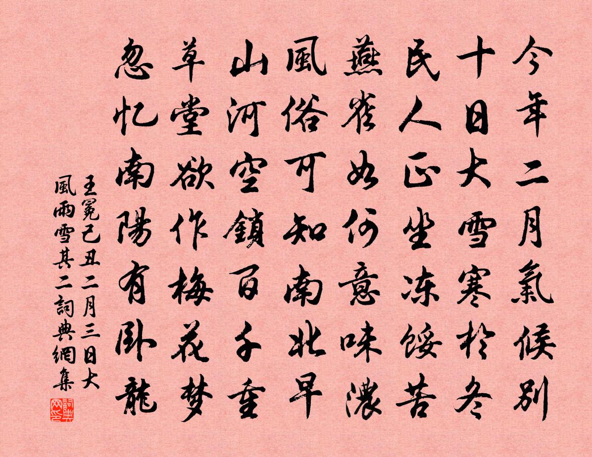今年二月氣候別,十日大雪寒於冬。民人正坐凍餒苦,燕雀如何意味濃?風俗可知南北早,山河空鎖百千重。
