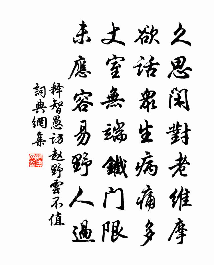 詩詞名句歷史字典書法欣賞書法字典國語詞典說文解字康熙字典古漢語字典標 題 作 者 詩 句 訪趙野雲不值作者:釋智愚 朝代:宋代訪趙野雲不值原文久思閒對老維摩,欲話眾生病痛多。丈室無端鐵門限,未應容易野人過。詩詞問答問:訪趙野雲不值的作者是誰?答:釋智愚問:訪趙野雲不值寫於哪個朝代?答:宋代釋智愚訪趙野雲不值書法欣賞訪趙野雲不值書法作品詩詞推薦寄舒州樂學士徐鉉〔唐代〕皖伯台前綠樹春,吳塘初下碧溪分。舊遊風景長牽夢,遙羨高齋望白雲。訪道者不遇杜荀鶴〔唐代〕寂寂白雲門,尋真不遇真。只應松上鶴,便是洞中人。藥圃花香異,沙泉鹿跡新。題詩留姓字,他日此相親。南鄉子 於公索幻化王哲〔元代〕幻化色身繞。電腳餘光水面泡。忽有忽無*速甚,如飈。過隙白駒旋旋飄。何不悟虛囂。早早回頭養玉苗。苗上金念奴嬌李久善〔宋代〕東君試手,向南枝著意,爭先時節。縱有丹青誰便忍,輕點肌膚冰雪。色借瓊瑰,香分蘭麝,元自標孤潔。沖寒獨秋日訪同人李鹹用〔唐代〕忽憶金蘭友,攜琴去自由。遠尋寒澗碧,深入亂山秋。見後卻無語,別來長獨愁。幸逢三五夕,露坐對冥搜。宿仙山浸碧軒二首王柏〔宋代〕冒黑投精剎,呼燈讀舊詩。平分禪榻穩,共聽雨聲馳。魚鼓催行色,溪山挽故知。人生萍聚散,後會復何時。拋纏頭詞施肩吾〔唐代〕翠娥初罷繞樑詞,又見雙鬟對舞時。一抱紅羅分不足,參差裂破鳳凰兒。漁父詠 閒題王哲〔元代〕生死輪迴何太速。改顏換百人難識。有個風狂常自足。常自足。逍遙處處孤眠宿。愁煞諸公歡折哭。恰如堂下三間浙幕李端公泛建溪黃滔〔唐代〕越城吳國結良姻,交發芙蓉幕內賓。自顧幽沈槐省跡,得陪清顯諫垣臣。分題曉並蘭舟遠,對坐宵聽月狖頻。更愛和友人喜相遇十首李鹹用〔唐代〕為儒自愧已多年,文賦歌詩路不專。肯信披沙難見寶,只憐苫草易成編。燕昭寤寐常求駿,郭隗尋思未是賢。且固詠梅五十首呈史尚書釋紹嵩〔宋代〕官梅一樹小池頭,繞著瑤芳看不休。為語鄰舟莫吹笛,冰肌香骨未禁愁。挽黃參議趙蕃〔宋代〕給事勛庸太史詩,凜然人物見家規。霜須同老豈無種,孝友深根真得師。治行所居皆可紀,人亡於此嘆吾衰。舊聞再用才子富文華校讎天祿閣韻贈周教授陳造〔宋代〕窮途有快意,辟席得異聞。青天千萬里,翳日帶煙雲。今者君子後,滿窺崔蔡文。當此陣堂堂,嘆我提孤軍。和元舉叔見謝載酒之韻二首楊萬里〔宋代〕南溪溪北北山邊,風月公何得猶專。挈榼慚無葉落酒,贈詩如得漢陰鯿。次韻劉貢父獨直省中蘇軾〔宋代〕明窗畏日曉先暾,高柳鳴蜩午更喧。筆老新詩疑有物,心空客疾本無根。隔牆我亦眠風榻,上馬君先鎖月軒。共喜孫莘老寄墨四首蘇軾〔宋代〕徂徠無老松,易水無良工。珍材取樂浪,妙手惟潘翁。(潘谷作墨,雜用高麗煤。)魚胞熟萬杵,犀角盤雙龍。墨見敏中初到邠寧秋日登城樓詩詩中頗多鄉思因以寄和白居易〔唐代〕想爾到邊頭,蕭條正值秋。二年貧御史,八月古邠州。絲管聞雖樂,風沙見亦愁。望鄉心若苦,不用數登樓。五和劉克莊〔宋代〕江湖浩渺常存闕,雲漢昭回妙闡坤。妓或攜來安石墅,客誰畔去翟公門。戴花老豈非同姓,拾穗翁猶有遠孫。殺馬贈三局能師二絕蘇轍〔宋代〕旅食江乾秋復春,歸耕未遂不勝貧。憑師細考何年月,可買山田養病身。野塘雜興黃敏求〔宋代〕仕進固所願,貧賤亦所憂。抱璞不自珍,過取則中羞。不如寂寞濱,橫此野水舟。時乎儻可為,肯遜伊與周。著書名句推薦去年今日臥燕台,銅鼓中宵隱地雷王守仁《元夕二首》 快上西樓,怕天放、浮雲遮月。辛棄疾《滿江紅·中秋寄遠》 悠悠卷旆旌,飲馬出長城。李世民《飲馬長城窟行》 白露橫江,水光接天。蘇軾《前赤壁賦》 風水人間不可無,也須陰騭兩相扶。馮夢龍《醒世恆言·卷一》 聰以知遠,明以察微。司馬遷《史記·五帝本紀》 精於物者以物物,精於道者兼物物。荀子《荀子·解蔽》 萬里不惜死,一朝得成功。高適《塞下曲》 芳草年年惹恨幽。想前事悠悠。石延年《燕歸梁·春愁》 每見寒士將達,必有一段謙光可掬。袁黃《了凡四訓·謙德之效》
