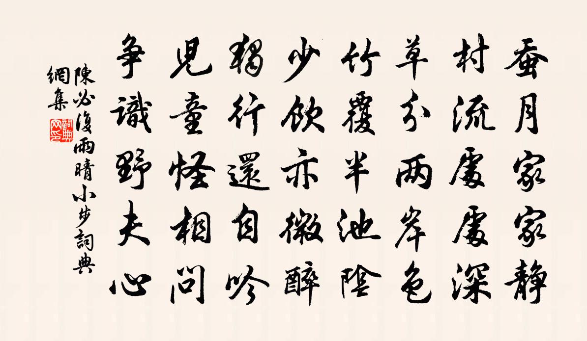 詩詞名句歷史字典書法欣賞書法字典國語詞典說文解字康熙字典古漢語字典標 題 作 者 詩 句 雨晴小步作者:陳必復 朝代:宋代雨晴小步原文蠶月家家靜,村流處處深。草分兩岸色,竹覆半池陰。少飲亦微醉,獨行還自吟。兒童怪相問,爭識野夫心。詩詞問答問:雨晴小步的作者是誰?答:陳必復問:雨晴小步寫於哪個朝代?答:宋代陳必復雨晴小步書法欣賞雨晴小步書法作品詩詞推薦曾禪人唯之釋智愚〔宋代〕當頭一諾未為親,大道難將語默分。不聽晚風江上笛,一聲吹破碧天雲。山農項安世〔宋代〕江上見山農,畲田用火攻。鼓聲為號令,竹援當畿對。生理猿猱似,年華豆粟供。無功隨薄祿,愧汝若為容。頌證道歌證道歌釋印肅〔宋代〕六代傳衣天下聞,參禪學道□紛紛。爭似丹霞燒木佛,傍觀赤爛墮幽昏。雜詩七首黃庭堅〔宋代〕少年不愛萬金身,歌舞尋春愁送春。滿眼紛華心寂寞,長安市上酒家人。如夢令許有壬〔元代〕有淚綠窗偷灑。有恨錦箋難寫。消瘦不勝春,玉骨都無一把。風雅。風雅。正值文君新寡。秋日登郡樓望贊皇山感而成詠李德裕〔唐代〕昔人懷井邑,為有掛冠期。顧我飄蓬者,長隨泛梗移。越吟因病感,潘鬢入秋悲。北指邯鄲道,應無歸去期。次歸耕堂稀字韻楊冠卿〔宋代〕精忠貫日古來稀,帷幄從容扈六飛。風虎雲龍方際會,故鄉未許我公歸。涼夜有懷 自此後詩並為應舉時作。白居易〔唐代〕清風吹枕席,白露濕衣裳。好是相親夜,漏遲天氣涼。雨後送李將軍還祠偕同寅飲一杯亭趙汝愚〔宋代〕民感桑林雨,雲施李靖龍。精誠天地動,意願鬼神從。村喜禾花實,峰看嶺岫重。白旗輝烈日,遙映一杯濃。和蘇伯承題恂恂軒黃公度〔宋代〕可但溫恭九族敦,平生鄉黨更恂恂。山林得趣身長健,門館無私物自春。一室琴尊對鹹籍,百年膠漆付雷陳。共傳戲贈乾越尼子歌劉長卿〔唐代〕鄱陽女子年十五,家本秦人今在楚。厭向春江空浣沙,龍宮落髮披袈裟。五年持戒長一食,至今猶自顏如花。亭亭雜詠一百首柳家婢劉克莊〔宋代〕忽見牙郎態,吁嗟悔失身。不虞小婢子,曾是柳家人。跋韓澗泉詩趙蕃〔宋代〕周漢歷歷上下秦,侯王將相史疊陳。辱斯榮斯仁不仁,桃源鹿門商山人。南磵遠孫澗之濱,所以三人入呻吟。桃源浣溪沙·傾國傾城恨有餘薛昭蘊〔五代〕傾國傾城恨有餘,幾多紅淚泣姑蘇,倚風凝睇雪肌膚。吳主山河空落日,越王宮殿半平蕪,藕花菱蔓滿重湖。早起待明詩郭印〔宋代〕夜闌呼仆起,四視有無雲。天際星猶爛,山頭樹未分。蟲鳴何限苦,雞唱不曾聞。欲驗東方白,頻看掌上文。妾薄命常理〔唐代〕十五玉童色,雙蛾青彎彎。鳥銜櫻桃花,此時刺繡閒。嬌小恣所愛,誤人金指環。艷花句引落,滅燭屏風關。妾怕冬夜讀几案間雜書得六言二十首劉克莊〔宋代〕六郎子晉後身,董君漢廷近親。大羅天女男妾,飽陶公主肥人。句朱晉〔宋代〕冰玉詞新吐,塵埃氣不留。和英州太守何智翁次韻馮仲禮麻江橋鄭俠〔宋代〕疊石樑空太守賢,一年功力倍千年。惠從今日流終古,智是當時決九川。有競輪蹄何雜沓,無情風月亦流連。紅燈偈十三首釋慧空〔宋代〕雪峰五月五日,不假神符妙術。只有頂門一錐,鐵佛也須汗出。名句推薦雪紛紛,掩重門,不由人不斷魂,瘦損江梅韻。關漢卿《大德歌·冬》 遙知未眠月,鄉思在漁歌。杜荀鶴《送人游吳》 李白如今已仙去,月在青天幾圓缺?唐寅《把酒對月歌》 水榭風微玉枕涼。牙床角簟藕花香。蘇庠《浣溪沙·書虞元翁書》 人生百年有幾,念良辰美景,休放虛過。元好問《驟雨打新荷》 心心視春草,畏向階前生。王維《雜詩三首 / 雜詠三首》 玉爐香,紅蠟淚,偏照畫堂秋思。溫庭筠《更漏子·玉爐香》 自別西風憔悴甚,凍雲流水平橋。陳維崧《臨江仙·寒柳》 稻根科斗行如塊,田水今年一尺寬。范成大《夏日田園雜興》 為問山翁何事,坐看流年輕度,拚卻鬢雙華。葉夢得《水調歌頭·秋色漸將晚》