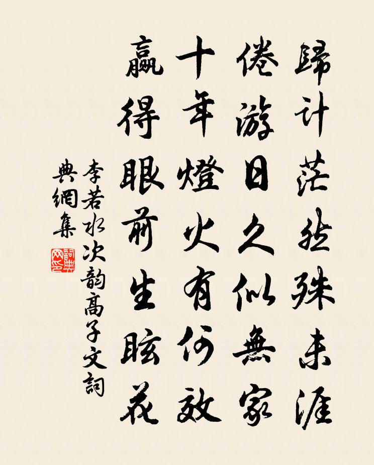 詩詞名句歷史字典書法欣賞書法字典國語詞典說文解字康熙字典古漢語字典標 題 作 者 詩 句 次韻高子文作者:李若水 朝代:宋代次韻高子文原文歸計茫然殊未涯,倦遊日久似無家。十年燈火有何效,贏得眼前生眩花。詩詞問答問:次韻高子文的作者是誰?答:李若水問:次韻高子文寫於哪個朝代?答:宋代李若水次韻高子文書法欣賞次韻高子文書法作品詩詞推薦雪月交光劉一止〔宋代〕正五雲飛仗,縞練褰裳,亂空交舞。拂石歸來,向玉階微步。欲喚冰娥,暫憑風使,為掃氛驅霧,漸見停輪,人間點絳唇(社日雨)王之道〔宋代〕春意催花,片雲又作朝來雨。淡勻深注。紅紫紛無數。社日人家,準擬行春去。痴兒女。倚門凝佇。借問東郊路。王夢得捕蝗二首章甫〔宋代〕江頭曉日方曈曈,僕夫喘汗天無風。茅檐汲井洗塵土,野寺煮餅燒油蔥。平生憂國寸心赤,在處喔詩雙鬢蓬。村民孟子周公之過陳普〔宋代〕過血乖離慘極刑,人情天理豈其真。天心處置非無意,故把瑕疵累聖人。酬故人還山宋鼎〔唐代〕舉棹乘春水,歸山撫歲華。碧潭宵見月,紅樹晚開花。肅穆輕風度,依微隱徑斜。危亭暗松石,幽澗落雲霞。思鳥禪人並化主寫真求贊釋正覺〔宋代〕靜復湛存,潮退珊瑚之根;智隨用奔,派發崑崙之源。光風草木獻春像,霽夜魚龍吞月魂。次韻費同叔解嘲魏了翁〔宋代〕低頭涸轍問波臣,沃以嘉言力萬鈞。逆耳倒言誠愛助,解嘲謝謗返離真。若微君告誰能及,幸不吾欺乃敢嗔。彼是九月二十五書事二首方回〔宋代〕蒼顏未怯冷風吹,過了殘秋更自奇。細嚼菊花吞美酒,閒拈柿葉寫新詩。繄誰屢賀參元火,與客仍消李遠棋。七十木蘭花(甘泉岩)曾原郕〔宋代〕斷崖拋雪瀑,又潛溜、入山跟。聽暗壁潺湲,山中紫霧,山下紅雲。當年七僧甚處,但空餘、老剎靠嶙峋。底事神故經略華文趙郎中崇憲挽章三首曹彥約〔宋代〕國是歸宗相,儒科看嫡傳。與時常落落,持論極拳拳。柄用無韓范,師承有澗瀍。衣冠何足論,父子世稱賢。謝連州沈殿丞惠石余靖〔宋代〕遺我岩岩石,拜嘉賢使君。何當天共補,應免玉偕焚。想自乘槎得,知從飲羽分。試將簷畔累,尚帶故山雲。沙苑南渡頭王昌齡〔唐代〕秋霧連雲白,歸心浦漵懸。津人空守纜,村館復臨川。篷隔蒼茫雨,波連演漾田。孤舟未得濟,入夢在何年?次韻十詩樓鑰〔宋代〕甥舅相尋向酒邊,相忘情話更怡然。人言難過雙延閣,自愧叨聯兩大天。只覺光陰詩里過,何妨枕簟醉時眠。此中鷓鴣天朱敦儒〔宋代〕我是清都山水郎。天教分付與疏狂。曾批給雨支風券,累上流雲借月章。詩萬首,酒千觴。幾曾著眼看侯王。玉樓院口寫望黎廷瑞〔宋代〕短艇搖搖對晚屏,推篷念遠不勝情。風前落木心猶壯,雨後歸雲氣未平。湖汊條條新築塞,圩頭處處薄收成。道逢漢宮春佚名〔宋代〕橫吹聲沉,倚危樓紅日,江轉天斜。黃塵邊火澒洞,何處吾家。胎禽怨夜,半乘風、玄露丹霞。先生笑,飛空一劍和此陽先生感興詩二十首劉黻〔宋代〕陰陽著太極,萬化惟一中。權衡迭軒輊,樞紐相始終。人受命以生,今古穉耄同。彼昏自不覺,安用尤聵聾。宿酇侯鎮汪藻〔宋代〕微涼初破候蟲秋,露草螢光已不流。搔首與誰論往事,星河無語下城頭。宿州張耒〔宋代〕野雲不作雪,仲冬氣猶蒸。岸雨濕枯柳,北風生浪聲。昨日飲我者,主人出金觥。酒薄亦足醉,青蛾慣逢迎。紛紛次韻子權京口夜宿見寄王令〔宋代〕寒江漠漠客帆稀,獨泊扁舟望翠微。已瀉綠醽聊自適,更邀白鳥共忘機。水閒海月寒初上,樹盡秋城碧自圍。嗟我名句推薦溪谷少人民,雪落何霏霏!曹操《苦寒行》 東面望者不見西牆,南鄉視者不睹北方呂不韋《呂氏春秋·覽·有始覽》 南山與秋色,氣勢兩相高。杜牧《長安秋望》 夜聞歸雁生鄉思,病入新年感物華。歐陽修《戲答元珍》 龜游蓮葉上,鳥宿蘆花里。李白《姑孰十詠》 吳姬越艷楚王妃,爭弄蓮舟水濕衣。王昌齡《採蓮曲二首》 冰泮寒塘水綠,雨余百草皆生。韋應物《三台》 白髮悲花落,青雲羨鳥飛。岑參《寄左省杜拾遺》 知而弗為,莫如勿知;親而弗信,莫如勿親。佚名《孔子家語·子路初見》 非得賢之難,用 之難。非用之難,信之難。房玄齡《晉書·列傳·第二十二章》
