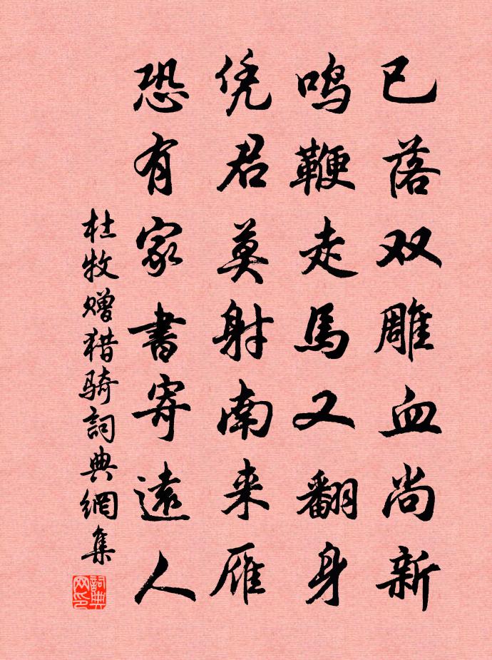 詩詞名句歷史字典書法欣賞書法字典國語詞典說文解字康熙字典古漢語字典標 題 作 者 詩 句 贈獵騎作者:杜牧 朝代:唐代贈獵騎原文已落雙鵰血尚新,鳴鞭走馬又翻身。憑君莫射南來雁,恐有家書寄遠人。詩詞問答問:贈獵騎的作者是誰?答:杜牧問:贈獵騎寫於哪個朝代?答:唐代問:贈獵騎是什麼體裁?答:七絕問:杜牧的名句有哪些?答:杜牧名句大全杜牧贈獵騎書法欣賞贈獵騎書法作品詩詞推薦漁家傲(金山)米芾〔宋代〕昔日丹陽行樂里。紫金浮玉臨無地。寶閣化成彌勒世。龍宮對。時時更有天花墜。浩渺一天秋水至。鯨鯢鼓鬣連山九曲櫂歌十首白玉蟾〔宋代〕聞道誰知鐵笛聲,石崖轟裂老龍驚。當年人已服丹去,千古荒亭秋草生。小園春思陸游〔宋代〕小軒愁入丁香結,幽徑春生荳蔻梢。若論此詩吟思苦,縱磨鐵硯也成凹。白鷺亭羅愚〔宋代〕千古城頭白鷺亭,鷺飛長是滿江汀。如何覽德輝台上,只有台存鳳不靈。門前柳姜特立〔宋代〕一桁門前柳,亭亭翠插空。悲秋宋玉宅,學舞楚王宮。夜映樓台月,朝牽鞭荇風。多情二三月,亂絮撲房櫳。梅花楊平洲〔宋代〕支頤半睡月明中,仿佛仙人薄霧籠。喚起夢魂簾幙悄,天香自到不因風。傳香枕史鳳〔唐代〕韓壽香從何處傳,枕邊芳馥戀嬋娟。休疑粉黛加鋌刃,玉女旃檀侍佛前。春日鄜州贈裴居言李頻〔唐代〕雖將身佐幕,出入似閒居。草色長相待,山情信不疏。燈前春睡足,酒後夜寒余。筆硯時時近,終非署簿書。永遇樂·京口北固亭懷古辛棄疾〔宋代〕千古江山,英雄無覓孫仲謀處。舞榭歌台,風流總被,雨打風吹去。斜陽草樹,尋常巷陌,人道寄奴曾住。想當年丁未十月見梅一點陳淳〔宋代〕清清一點玉,枯枝絕鮮鮮。歷歷霜林奇,未省有此妍。雅如哲君子,覺在群蒙先。揭之几案上,使我心洒然。憶東坡王之道〔宋代〕虛堂回響聲,皎月形和影。春到也須還,長紅多紫啼條梗。況有光風麗日,能消積雪繁霜,青女休言勝。扶搖借便題富陽嚴先生祠耕春堂金履祥〔宋代〕西望先生舊釣台,無窮山色鎖崔嵬。閒婦故國耕春雨,遂起頹風生暮雷。萬事盡隨江水去,千年寧幾客星來。北山河口逢江州朱道士因聽琴盧綸〔唐代〕廬山道士夜攜琴,映月相逢辨語音。引坐霜中彈一弄,滿船商客有歸心。吊李元賓墳孟郊〔唐代〕曉上荒涼原,吊彼寂寥魂。眼咽此時淚,耳淒在日言。冥冥千萬年,墳鎖孤松根。清露被皋蘭孫顧〔唐代〕九皋蘭葉茂,八月露華清。稍與秋陰合,還將曉色並。向空羅細影,臨水泫微明。的皪添幽興,芊綿動遠情。夕芳次畢叔文見貽二首趙蕃〔宋代〕山川略吳楚,歲月涉春秋。為米愧元亮,乘舟思子猷。黑貂塵土重,白鬢雪霜稠。志合成三益,詩來減四愁。傳舍中竹一首王阮〔宋代〕澀蕊浮花不足看,歲寒獨與此君觀。籜龍滿野今千變,翔鳳何時下一餐。日對吏文瀟灑在,天生官地保全難。明年千蹊王安石〔宋代〕千蹊百隧散林丘,圖畫風煙一色秋。但有興來隨處好,楊朱何苦涕橫流。人月圓·山中書事張可久〔元代〕興亡千古繁華夢,詩眼倦天涯。孔林喬木,吳宮蔓草,楚廟寒鴉。數間茅舍,藏書萬卷,投老村家。山中何事?松宿保全寺方鳳〔宋代〕捫蘿山逕迥,流水石橋分。一雨過秋寺,千峰生暮雲。望窮迷野色,沙遠見鷗群。煙藹蒼茫外,寥寥清磬聞。名句推薦台榭空濛煙柳暗,白鳥銜魚欲舞。納蘭性德《摸魚兒·午日雨眺》 敵者,利害相衝,死生弗容;未察之無以辨友,非制之無以成業。來俊臣《羅織經·制敵卷第五》 窈窕淑女,君子好逑。佚名《關雎》 驅雞上樹木,始聞叩柴荊。杜甫《羌村三首·其三》 菱葉縈波荷颭風,荷花深處小船通。白居易《採蓮曲》 今日暫同芳菊酒,明朝應作斷蓬飛。王之渙《九日送別》 初聞征雁已無蟬,百尺樓高水接天。李商隱《霜月》 芙蓉老秋霜,團扇羞網塵。李白《中山孺子妾歌》 行雲卻在行舟下,空水澄鮮,俯仰留連,疑是湖中別有天。歐陽修《採桑子·畫船載酒西湖好》 休說鱸魚堪膾,盡西風,季鷹歸未?辛棄疾《水龍吟·登建康賞心亭》