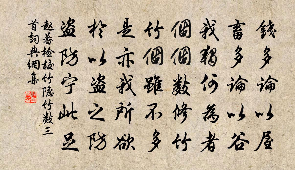 詩詞名句歷史字典書法欣賞書法字典國語詞典說文解字康熙字典古漢語字典標 題 作 者 詩 句 檢校竹隱竹數三首作者:趙蕃 朝代:宋代檢校竹隱竹數三首原文錢多論以屋,畜多論以谷。我獨何為者,個個數修竹。竹個雖不多,是亦我所欲。於以盜之防,盜防寧此足。詩詞問答問:檢校竹隱竹數三首的作者是誰?答:趙蕃問:檢校竹隱竹數三首寫於哪個朝代?答:宋代趙蕃檢校竹隱竹數三首書法欣賞檢校竹隱竹數三首書法作品詩詞推薦出東城門見牧牛曾豐〔宋代〕出逢春客放牛天,浩嘆微官久自纏。回首未能收白牯,歸家猶可養烏犍。小重山王哲〔元代〕世上人人做有為。榮華並富貴,*能為。錦衣肉飯斗多為。饒君會,一品又奚為。王哲不施為。麻衫兼紙襖,自堪喜遷鶯馮延巳〔唐代〕霧濛濛,風淅淅,楊柳帶疏煙。飄飄輕絮滿南園,牆下草芊眠。燕初飛,鶯已老,拂面春風長好。相逢攜手且高歌留題安州朱氏草堂歐陽修〔宋代〕俯檻臨流蕙徑深,平泉花木繞陰森。蛙鳴鼓吹春喧耳,草暖池塘夢費吟。賭墅乞甥賓對弈,驚鴻送目手揮琴。嗟予八用喜雨韻三首吳潛〔宋代〕殘暑如烝尚不禁,坐鄰三鼓斗杓沈。雨調可是月離畢,時熟元來歲在心。筋力不堪憑几案,頭顱惟便卸冠簪。呼童甲寅二月罷戶部勾院移群牧判官待次數月乙卯強至〔宋代〕誰容豺虎漏讒人,又遣花封食貧。漸老可無詩過日,連年唯有悶償春。奔波塵土非吾事,流浪江湖合此身。且信濁九張機佚名〔宋代〕四張機。咿啞聲里暗顰眉。回梭織朵垂蓮子。盤花易綰,愁心難整,脈脈亂如絲。古意閻寬〔唐代〕庭樹發華滋,瑤草復葳蕤。好鳥飛相從,愁人深此時。天中有靈匹,日夕嚬蛾眉。願逐飄風花,千里入遙帷。心逝看梅雜興釋永頤〔宋代〕青公古院一株梅,寒殿無人花自開。日暮老僧清梵罷,夜深偷照月華來。聞禽梅堯臣〔宋代〕禽鳴脫破褲,定無新易故。此語莫相譏,善貧知有素。偈頌二十五首釋如淨〔宋代〕八月十八錢塘潮,浙翁聲價潑天高。盡教四海弄潮手,徹底窮淵輥一遭。重揀擇,不辭勞,要透龍門繼鳳毛。忽然和答吳斗南賞木芙蓉見懷孫應時〔宋代〕曾向荊州一笑同,淋灕江漢酒千鍾。夾城雲蓋迎珠履,滿眼霜花照玉容。萬里壯遊前日事,十年此會幾時重。憶君瓦店雨作四首楊萬里〔宋代〕天嫌平野樹分明,便恐丹青畫得成。收入晚風煙雨里,自將水墨替丹青。寄題蕭民望扶疏堂二首楊萬里〔宋代〕不栽繁杏試晴紅,不種垂楊拂暖茸。堂下生涯無一物,月中修竹雪中松。贈日者朱俊甫二首劉克莊〔宋代〕謝公閉墅懶圍棋,董相還家且下帷。見說金甌殊未定,問君魁柄屬之誰。出劍門後日履危徑戲集轎兵方言魏了翁〔宋代〕籃輿陟險隘,兀兀不停轍。主人眩頭目,僕夫困唇舌。前疑樹梢拂,後慮崖石擦。方呼左畔蹺,復叫右竿捺。避礙梅氏梅樓鄭上村〔宋代〕山雲樓頭徹夜明,天風吹下讀書聲。勸君莫把離騷讀,見說梅花恨未平。范村午坐范成大〔宋代〕好風入修篁,槁葉舞而墮。斷續一蛩吟,高下雙蝶過。凍樾午陰圓,靜極成痴坐。老便几杖供,慵廢誦弦課。 * 晚臥二首趙蕃〔宋代〕軒小才堪置竹床,晚來新浴快初涼。掃除諸妄歸真想,檐卜林中聞妙香。遠遊十首韓元吉〔宋代〕紫皇宴瓊台,鳳舞鸞且歌。翠鬟兩仙發,倚歌奏雲和。秀色炯雙璧,晴雲灩秋波。曲終顧我笑,奈此人間何。贈以名句推薦借錢塘潮汐,為君洗盡,岳將軍淚!陳德武《水龍吟·西湖懷古》 木落山空天遠大,送飛鴻、北去傷懷久。戴復古《賀新郎·寄豐真州》 兒女紛紛夸結束,新樣釵符艾虎。劉克莊《賀新郎·端午》 喪雖有禮,而哀為本焉。墨子《墨子·02章 修身》 相見時難別亦難,東風無力百花殘。李商隱《無題·相見時難別亦難》 東飛伯勞西飛燕,黃姑織女時相見。蕭衍《東飛伯勞歌》 凡行軍越過山險而陣,必依附山谷,一則利水草,一則附險固,以戰則勝。佚名《百戰奇略·第四卷·谷戰》 王師北定中原日,家祭無忘告乃翁。陸游《示兒》 雨聲颼颼催早寒,胡雁翅濕高飛難。杜甫《秋雨嘆三首》 隔牖風驚竹,開門雪滿山。王維《冬晚對雪憶胡居士家》