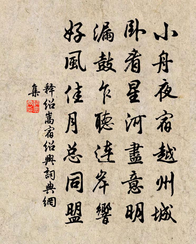 詩詞名句歷史字典書法欣賞書法字典國語詞典說文解字康熙字典古漢語字典標 題 作 者 詩 句 宿紹興作者:釋紹嵩 朝代:宋代宿紹興原文小舟夜宿越州城,臥看星河盡意明。漏鼓乍聽連岸響,好風佳月總同盟。詩詞問答問:宿紹興的作者是誰?答:釋紹嵩問:宿紹興寫於哪個朝代?答:宋代釋紹嵩宿紹興書法欣賞宿紹興書法作品詩詞推薦仙佛之孝十首寒山子林同〔宋代〕鍋里爺娘語,寒山太猛生。不妨時著眼,直是得人驚。山居雜詩九十首曹勛〔宋代〕前村有經社,香火訊屢通。攜朋閒步往,老人顏有童。一杯苦澀茗,滿塘蒲稗風。笑顧紙上佛,何時供渠儂。次韻王正之提刑大卿病中見寄之韻,正之得請范成大〔宋代〕名卿緒前輩,風格如玉山。累累培塿中,見此高孱顏。攬轡忽思歸,無人解縻賢。飄颻駕紫車,浮雲視朱丹。向來吳中羊肉價高有感高公泗〔宋代〕平江九百一斤羊,俸薄如何敢買嘗。只把魚暇充兩膳,肚皮今作小池塘。贈三局能師二絕蘇轍〔宋代〕得失從來似偶然,因師聊復問行年。此生竟墮陰陽數,方信修行力未全。讀仲退和胡秀才詩有感斯文用韻徐瑞〔宋代〕文章聖外無誰語,獨立蒼茫只屢愛。從渠高眼空四海,自古名家能幾人。愛鳥怒蟹言何淺,畫虎雕龍技漫新。吾道和俞成大八月梅花洪咨夔〔宋代〕秋光深處送春來,青葉扶疏數點梅。料是知君新釀熟,攙先九月菊花開。觀使太尉張求頌釋如淨〔宋代〕居士眼睛吞佛祖,衲僧鼻孔透乾坤。眼睛鼻孔初無間,萬古宗門結痛冤。送方書記兼簡府主葉適〔宋代〕我昔防江之下流,獨許蔡子專軍謀。未能奏效累絲髮,已復負謗叢山丘。小范兵精思慮遠,片言坐折群疑滿。幕僚酬從弟惠連謝靈運〔南北朝〕寢瘵謝人徒,滅跡入雲峯。岩壑寓耳目,歡愛隔音容。永絕賞心望,長懷莫與同。末路值令弟,開顏披心胸。心胸逢漳州崔使君北歸張蠙〔唐代〕在郡多殊稱,無人不望回。離城攜客去,度嶺擔猿來。障寫經冬蕊,瓶緘落暑梅。長安有歸宅,歸見鎖青苔。挽湯丞相漢國夫人喻良能〔宋代〕七秩芳名盛,於今等逝波。承天登宰輔,看子掌編摩。鳳去青春獨,鸞回紫誥多。他年彤管史,兼述采蘩歌。題李孝廉書房耿湋〔唐代〕野情專易外,一室向青山。業就三編絕,心通萬事閒。鶯稀春木上,草遍暮階間。莫道歸繻在,來時棄故關。夢方飲藥或告之曰攻伐太過斯傷天和覺而識之方岳〔宋代〕過恭為足恭,過敬為繆敬。禮猶不可過,況以毒攻病。甚毒傷沖和,一快喪軀命。萬事有厥中,毋使血氣橫。子承風嘆呂溫〔唐代〕青海風,飛沙射面隨驚蓬。洞庭風,危牆欲折身若空。西馳南走有何事,會須一決百年中。鷓鴣天謝逸〔宋代〕桐葉成陰拂畫檐。清風涼處卷疏簾。紅綃舞袖縈腰柳,碧玉眉心媚臉蓮。愁滿眼,水連天。香箋小字倩誰傳。梅黃過從叔猥園郭岩〔宋代〕風流吾大阮,嘉遁狎鷗盟。築得野亭曠,到來雲水清。斜林收橡實,涇水給茶鐺。翻笑支公拙,買山空得名。春夜溫故六言二十首劉克莊〔宋代〕門前客已去矣,屋裡人安在哉。寒雀張羅可得,春燕銜泥不來。黃州竹徑斗杜牧〔唐代〕竹濁蟠小徑,屈折斗蛇來。三年得歸去,知繞幾千回?椒菊枕洪咨夔〔宋代〕矮檠矻初年,細字窘晚節。天憐蠹書障,神授鴻寶訣。金葩涼而嚴,丹寶溫以烈。兩囊貯風露,半簪藉霜雪。芬透名句推薦將入門,問孰存。將上堂,聲必揚。李毓秀《弟子規·謹》 凡學之道,嚴師為難。戴聖《禮記·學記》 所作福德不應貪著。鳩摩羅什譯《金剛經·不受不貪》 曉迎秋露一枝新,不占園中最上春。杜牧《紫薇花》 人事有代謝,往來成古今。孟浩然《與諸子登峴山》 兄弟之際,異於他人,望深則易怨,地親則易弭。顏之推《顏氏家訓·兄弟篇》 水調數聲持酒聽。午醉醒來愁未醒。張先《天仙子·水調數聲持酒聽》 百結愁腸郁不開,此生惆悵異鄉來。秋瑾《九日感賦》 日夕涼風至,聞蟬但益悲。孟浩然《秦中感秋寄遠上人 / 秦中寄遠上人》 易醉扶頭酒,難逢敵手棋。賀鑄《南歌子·疏雨池塘見》