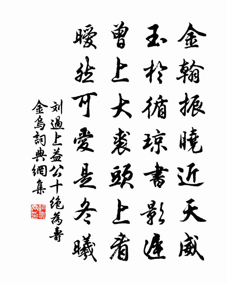 詩詞名句歷史字典書法欣賞書法字典國語詞典說文解字康熙字典古漢語字典標 題 作 者 詩 句 上益公十絕為壽金烏作者:劉過 朝代:宋代上益公十絕為壽金烏原文金翰振曉近天威,玉於循瓊書影遲。曾上大裘頭上看,曖然可愛是冬曦。詩詞問答問:上益公十絕為壽金烏的作者是誰?答:劉過問:上益公十絕為壽金烏寫於哪個朝代?答:宋代問:劉過的名句有哪些?答:劉過名句大全劉過上益公十絕為壽金烏書法欣賞上益公十絕為壽金烏書法作品詩詞推薦醉歌陸游〔宋代〕老夫檣竿插蒼石,水落岸沙痕數尺。江南秋盡未搖落,槲葉離離楓葉赤。楚人自古多悲傷,道傍行歌猶感激。野花二郎神曹勛〔宋代〕半陰未雨。霽曉寒、輕煙薄暮。乍過了挑青,名園深院,把酒偏宜細步。滿檻梅花,繞堤溪柳,徑暖遷鶯相語。春霜月陸游〔宋代〕枯草霜花白,寒窗月影新。驚鴉時繞樹,吠犬遠隨人。出仕讒銷骨,歸耕病滿身。世間輸壞衲,切莫勸冠巾。五日子刻立春衛涇〔宋代〕客中春到不知春,庭草青青入眼新。對酒可無人作伴,照書卻有雪為鄰。雕盤玉筍傳生菜,寶勝金花錫近臣。我已村晚張耒〔宋代〕深塢繁花麗,晴田細徑分。孤舟春水路,芳草夕陽村。暗雀投檐靜,昏鴉集樹喧。牛羊自歸晚,燈火掩衡門。句繆瑜〔宋代〕寒盟得問鷗。次韻知郡登高言懷鄭俠〔宋代〕莫向天涯說故鄉,人身不似雁隨陽。黃花滿手空佳節,千里有懷如雨腸。為許功名酬新地,不須愁緒付瑤觴。男兒偈頌七十六首釋師觀〔宋代〕咄這尊慈,口甜心苦。帶累我儂,破家盪戶。者僧話墮處,直下明明舉。一炷栴檀充宇宙,誰道黃金如糞土。題小室二首劉克莊〔宋代〕阡陌東西山北南,半生常帶散人銜。何曾雲夢芥 * ,一任狙公芧四三。合上大夫投欲死,甕間吏部寢方酣。可憐桂城早秋戎昱〔唐代〕遠客驚秋早,江天夜露新。滿庭惟有月,空館更何人。卜命知身賤,傷寒舞劍頻。猿啼曾下淚,可是為憂貧。題畫九首唐寅〔明代〕萬木號風疑虎吼,亂泉驚雨挾龍飛。世疑龍虎茌馴擾,卻許山人擅指揮。送王巽澤侍郎王炎〔宋代〕屈指桃溪上,差池二十年。知心寧易得,識面豈無緣。離別何須恨,平安可數傳。異時如索我,小隱翠微邊。秋思釋文珦〔宋代〕聽說相思情緒,難禁最是秋時。燕去重增別恨,雁來不服歸期。偶侍郡侯游群玉浪吟二絕聊記歲月時淳佑乙巳趙與泳〔宋代〕此景元來已不凡,高人那更說塵寰。清幽爽塏舒情思,頻賞無非吏事閒。客路朱繼芳〔宋代〕閨合空相憶,那知客路艱。背人前去鳥,迎面遠來山。夜泊孤燈悄,晨裝片月彎。猿聲不知處,杳杳白雲間。題董亨道畫西湖曹勛〔宋代〕湖上秋山翠作堆,湖光千頃漾漣漪。曉雲帖水菰蒲冷,正是吳江楓落時。鐘山朱元璋〔明代〕游山智盤旋,俯谷仰奇巔。松聲細入耳,雲生水石邊。敲竹猿長嘯,臨弆視鹿眠。白鶴來天翅,玄羽衣裳鮮。采芝和如晦二首陳襄〔宋代〕俱為澤國未朱轓守,同是冰聽白首郎。且喜朝廷憂外寄,故從書府輟班揚。雜詠陸游〔宋代〕宦途所至尚偷閒,何況湖邊晝掩關。未愛好風吹醉袖,且貪微雨養盆山。松徑郭岩〔宋代〕一逕深且紆,森森蔭松柏。清風池上來,幽思與之發。逸響諧素琴,涼陰散清帙。弘景或可邀,高懷共披豁。名句推薦鳥飛千白點,日沒半紅輪。白居易《彭蠡湖晚歸》 秋來愁更深,黛拂雙蛾淺楊無咎《生查子·秋來愁更深》 鳳簫聲動,玉壺光轉,一夜魚龍舞。辛棄疾《青玉案·元夕》 會當凌絕頂,一覽眾山小。杜甫《望岳》 凡道字,重且舒。勿急疾,勿模糊。李毓秀《弟子規·信》 人之命在天,國之命在禮荀子《荀子·強國》 萬里橋邊多酒家,遊人愛向誰家宿。張籍《成都曲》 簾控鉤,掩上珠樓,風雨替花愁喬吉《春閨怨·不系雕鞍門前柳》 孤燈寒照雨,濕竹暗浮煙。司空曙《雲陽館與韓紳宿別》 舒捲江山圖畫,應答龍魚悲嘯,不暇顧詩愁。楊炎正《水調歌頭·登多景樓》
