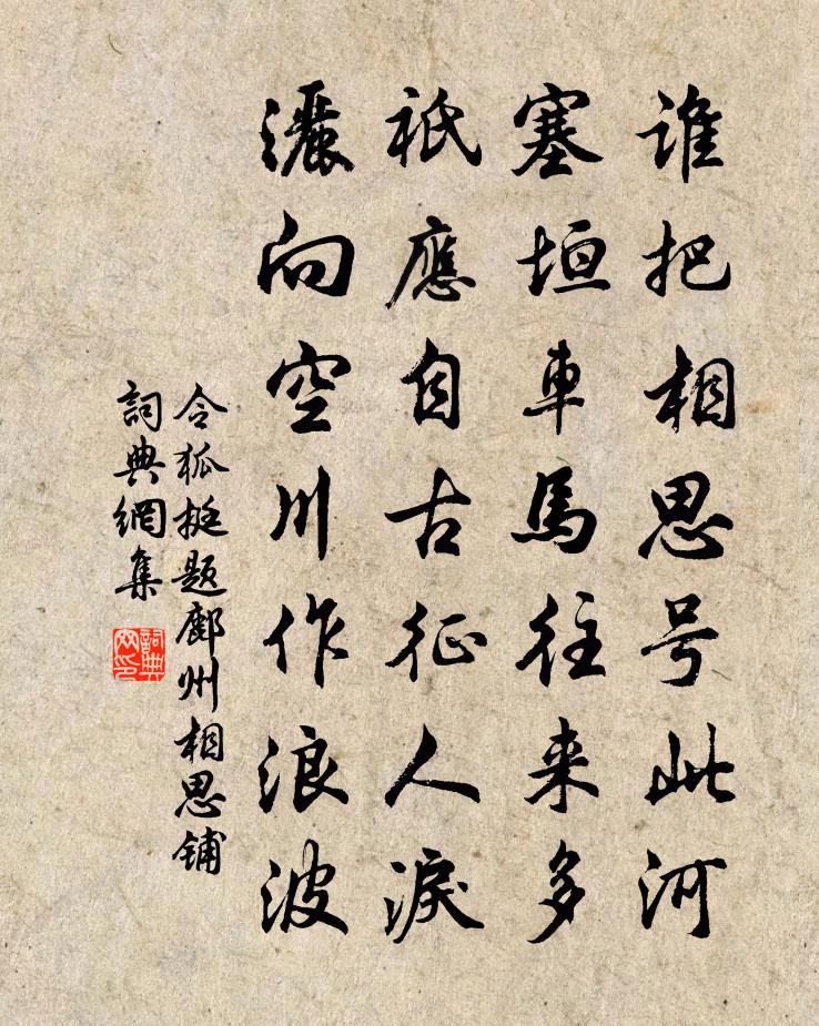 詩詞名句歷史字典書法欣賞書法字典國語詞典說文解字康熙字典古漢語字典標 題 作 者 詩 句 題鄜州相思鋪 / 令狐楚詩作者:令狐挺 朝代:宋代原文誰把相思號此河,塞垣車馬往來多。祇應自古征人淚,灑向空川作浪波。詩詞問答問:《題鄜州相思鋪 / 令狐楚詩》的作者是誰?答:令狐挺問:該詩寫於哪個朝代?答:宋代書法欣賞題鄜州相思鋪 / 令狐楚詩書法作品詩詞推薦同年譚綜掾江陵宋祁〔宋代〕鄉樹湘雲外,行轅楚塞東。不辭淹拔萃,聊欲辨無同。暝紫生寒岫,疏丹點暮楓。登樓有歸訊,為附北歸鴻。送戴漢老翁卷〔宋代〕三洞聳奇秀,雙溪瀉澄鮮。上有婺女光,照耀無窮年。儲靈復產異,人物相比肩。君雖生後來,識與先輩連。如筠齊天樂 張翔南寓金陵時,嘗有寄金子尚魏彥邵亨貞〔元代〕獨以賞音見許,而不知予頻年連嬰逆景,久疏詞筆,非復向時懷抱矣,戊申秋杪,邾仲羲持示詞卷,且辱彥文寄聲初冬快晴陪宣卿叔夏遊石頭庵過三生藏窮深極胡寅〔宋代〕石滑梯山祗自疲,誰雲此法妙難思。便教元亮荒三徑,也勝楊朱泣兩岐。同孫子直和李參政東園韻十絕洪咨夔〔宋代〕食肉玉關徒自苦,然臍郿塢太生痴。人心溪壑元無底,富貴功名十二時。和陶己酉歲九月九日蘇軾〔宋代〕今日我重九,誰謂秋冬交。黃花與我期,草中實後凋。香余白露乾,色映青松高。悵望南陽野,古潭霏慶霄。伯始次韻子由所居六詠蘇軾〔宋代〕先生飯土塯,無物與劉叉。何以娛醉客,時嗅砌下花。井水分西鄰,竹陰借東家。蕭然行腳僧,一身寄天涯。早行王觀〔宋代〕雞唱催人起,又生前去愁。路明殘月在,山露宿雲收。村店煙火動,漁家燈燭幽。趨名與趨利,行役幾時休。句諶祜〔宋代〕短褐尚時吟杜曲,采芝何處問春峰。傷春詞寄紫元四首白玉蟾〔宋代〕孤村古館雨淒淒,客里愁聞烏夜啼。枕冷衾寒才閉目,春風吹轉夢魂迷。和程閣學送小春茶韻四首袁說友〔宋代〕眼看節物去重來,又見寒梢數點梅。草木已隨新歲好,冬芽豫占一年魁。送吳蛻下第入蜀杜荀鶴〔唐代〕下第言之蜀,那愁舉別杯。難兄方在幕,上相復憐才。鳥徑盤春靄,龍湫發夜雷。臨邛無久戀,高桂待君回。和陳府教授見贈戴埴〔宋代〕遺風洙車濱,汲古酌犧樽。魚躍進池藻翻,鶯呼和浩特庭樹喧。樂山不樂水,居城猶居村。走筆送韓昕伯謁任廣文劉宰〔宋代〕芹宮競說廣文賢,姓字高縣袞綠邊。八十老翁無失德,三千弟子盡推先。和洪司令梅花吳泳〔宋代〕杼雲新卷雪泥乾,剪剪輕風薄薄寒。莫遣水龍吹別調,放教春在玉欄乾。贈閻少保王建〔唐代〕髭鬚雖白體輕健,九十三來卻少年。問事愛知天寶里,識人皆是武皇前。玉裝劍佩身長帶,絹寫方書子不傳。侍女憶毛易甫薛子舒劉克莊〔宋代〕昔在江東會集時,二君獨許話心期。春風蕭寺同登塔,落日荒台共讀碑。百吏染毫供草檄,萬花圍席看題詩。那知迎春姚合〔唐代〕半年留醉待花開,曉去迎春夜始回。風暖慢行尋曲水,天晴遠望立高台。亦知無處將詩請,唯得終朝把酒催。今日春雨絕句陸游〔宋代〕蕭條冬令侵春晚,淅瀝寒聲滴夜長。更事老翁頑到底,每言宜睡好燒香。濠州七絕 虞姬墓蘇軾〔宋代〕帳下佳人拭淚痕,門前壯士氣如雲。倉黃不負君王意,獨有虞姬與鄭君。名句推薦隨風潛入夜,潤物細無聲。杜甫《春夜喜雨》 四月清和雨乍晴,南山當戶轉分明。司馬光《客中初夏》 公生明,偏生暗荀子《荀子·不苟》 相思一夜梅花發,忽到窗前疑是君。盧仝《有所思》 不如歸去下簾鉤,心兒小,難著許多愁吳淑姬《小重山·謝了荼蘼春事休》 安危在出令,存亡在所任。司馬遷《史記·楚元王世家》 雁過孤峰曉,猿啼一樹霜。賈島《送天台僧》 李白能詩復能酒,我今百杯復千首。唐寅《把酒對月歌》 四百年來成一夢,堪愁。王安石《南鄉子·自古帝王州》 遙憐小兒女,未解憶長安。杜甫《月夜》