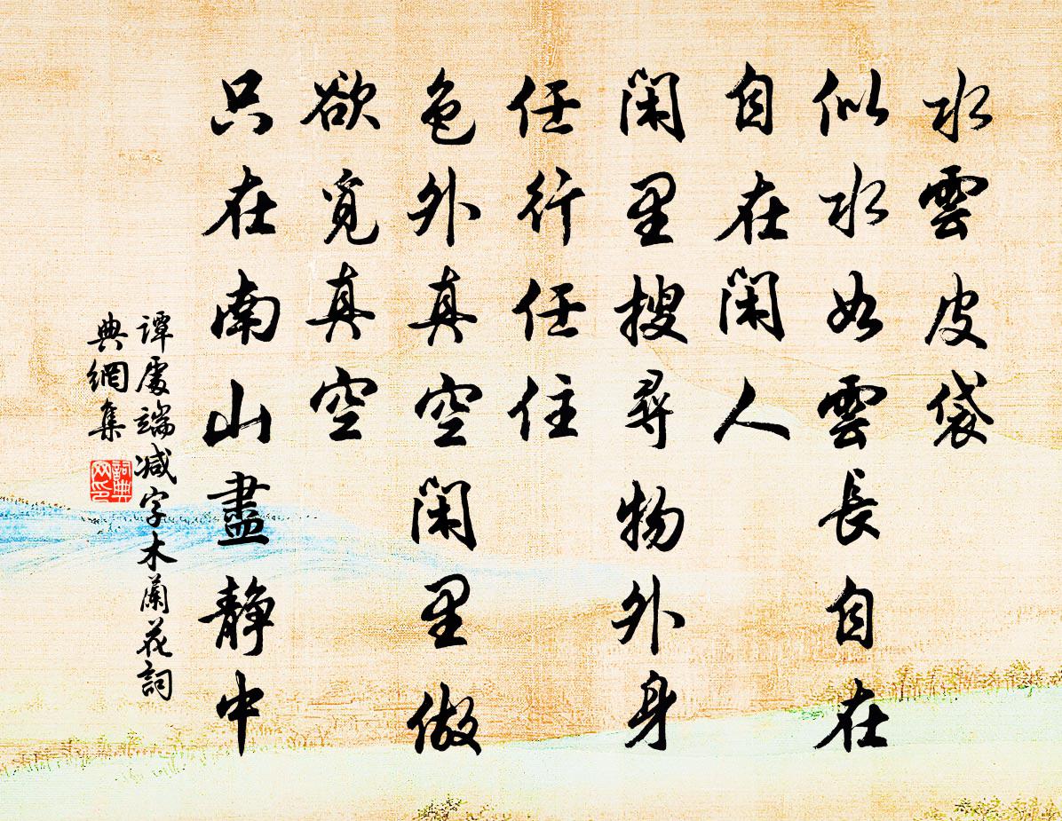 詩詞名句歷史字典書法欣賞書法字典國語詞典說文解字康熙字典古漢語字典標 題 作 者 詩 句 減字木蘭花作者:譚處端 朝代:元代減字木蘭花原文水雲皮袋。似水如雲長自在。自在閒人。閒里搜尋物外身。任行任住。色外真空閒里做。欲覓真空。只在南山盡靜中。詩詞問答問:減字木蘭花的作者是誰?答:譚處端問:減字木蘭花寫於哪個朝代?答:元代問:減字木蘭花是什麼體裁?答:詞譚處端減字木蘭花書法欣賞減字木蘭花書法作品詩詞推薦史太師病癒未果走賀誕辰伊邇作古詩三首寄之劉應時〔宋代〕真隱道骨堅,能御陰陽寇。不藉盧扁術,自得喬松壽。香馥東籬菊,樽余北海酒,裁詩千百篇,年年登袞繡。蔡州曾鞏〔宋代〕蔡州昔人居,遺堵不可尋。青石久埋沒,荒煙起空林。昔人依劉表,意氣傅至今。廣路競朱轂,深藏閟黃金。構難有感劉克莊〔宋代〕向來涉筆賦長楊,辱賜天家七寶床。黃吻少年評宿士,白頭宮女說先皇。走章台馬曾遊冶,攀鼎湖龍竟渺茫。縱使曾雲巢同相勉李玉澗不赴召戴復古〔宋代〕詔書催赴紫宸班,九奏君王乞掛冠。日暮倒行非我事,急流勇退有何難。地靈不隱金砂勝,秋水長流玉澗寒。好把送張如瑩強至〔宋代〕柏城親見五雲飛,歸奏嚴宸侍玉墀。重待三長專筆削,新遷八座總綱維。卻緣關輔初通屬,便向齋壇去把麾。暫使臨終作王世寧〔宋代〕翠羽旌幢仙子隊,紫雲樓閣玉皇家。人間風雨易分散,回首五陵空落花。釣翁秦韜玉〔唐代〕一竿青竹老江隈,荷葉衣裳可自裁。潭定靜懸絲影直,風高斜颭浪紋開。朝攜輕棹穿雲去,暮背寒塘戴月回。世上千秋歲 壽詞沈禧〔元代〕幸逢清世。四海皆兄弟。人未老,身無系。閒情湖水闊,高興吳山邃。酣歌后,黑甜一枕南窗睡。華誕今朝是。綺和孟世功二首吳芾〔宋代〕不是風標六歲除,閒中應是樂琴書。逢辰自合膺殊選,遁世何妨且隱居。已愛新詩如沈謝,更聽高論似嚴徐。時來東坡二首陳造〔宋代〕五載詩鳴臥雪堂,暮年長嘯走南荒。當時戲彩慈親側,豈復陳編羨范滂。從德麟自中盧游靈記事李廌〔宋代〕青溪翠壁瀉琮琤,洞府猶傳鬼谷名。幸有六經堪送老,不思唇舌慕從橫。六言雜興陸游〔宋代〕夢裡明明周孔,胸中歷歷唐虞。欲盡致君事業,先求養氣工夫。禪人並化主寫真求贊釋正覺〔宋代〕風觀痴甚,形骸老生,眉棱陰覺重,鼻息靜還清。二儀未兆,一點圓明。霜洗鬥牛濕。秋晴河漢橫。莫將毫忽痕空葉釋斯植〔宋代〕天涯誰與寄相思,殘片疏疏尚戀枝。一自西風寒勒後,凋零能得幾多時。萱草陳師道〔宋代〕喚作忘憂草,相看萬事休。若教花有語,郤解使人愁。劉致政家東岡池蓮甚盛昔嘗飲焉賦引敘別二首王阮〔宋代〕一枝曾吸碧筩杯,萬丈潮頭忽見催。斜倚闌乾獨惆悵,明年應是不能來。句王安石〔宋代〕昔時江令宅,今日段侯家。思秋香唐寅〔明代〕鞦韆盪舞腰肢嫩,窈窕嬌娜與雲平。咯咯笑聲郎仰面,竹林深處喚小名。挽仁山楊先生蒲壽宬〔宋代〕滴盡艱難淚,肝腸鐵似頑。忍教師道絕,還向我翁潸。命也吾何憾,天乎識固慳。平生修潔意,千載此西山。南柯子(問王立之督茶)陳師道〔宋代〕天上云為瑞,人間睡作魔,疏簾清簟汗成河。酒醒夢回眵眼、費摩娑。但有寒喧問,初無鳳鳥過。塵生銅碾網生羅名句推薦秋容淺淡映重門,七節攢成雪滿盆。曹雪芹《詠白海棠》 十日春寒不出門,不知江柳已搖村。蘇軾《正月二十日往岐亭郡人潘古郭三人送余於女王城東禪莊院》 莫辭秉燭通霄坐,明日相思隔隴煙。王守仁《諸門人送至龍里道中二首》 遠樹帶行客,孤城當落暉。王維《送綦毋潛落第還鄉 / 送別》 楚人悲屈原,千載意未歇。蘇軾《屈原塔》 見樂則淫侈,見憂則諍治,此人之道也。呂不韋《呂氏春秋·論·似順論》 寧可信其有,不可信其無。佚名《增廣賢文·上集》 松排山面千重翠,月點波心一顆珠。白居易《春題湖上》 將軍金甲夜不脫,半夜軍行戈相撥,風頭如刀面如割。岑參《走馬川行奉送出師西征 / 走馬川行奉送封大夫出師西征》 永憶江湖歸白髮,欲回天地入扁舟。李商隱《安定城樓》