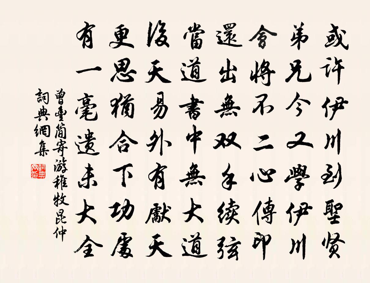 詩詞名句歷史字典書法欣賞書法字典國語詞典說文解字康熙字典古漢語字典標 題 作 者 詩 句 簡寄游稚牧昆仲作者:曾豐 朝代:宋代簡寄游稚牧昆仲原文或許伊川到聖賢,弟兄今又學伊川。會將不二心傳印,還出無雙手續弦。當道書中無大道,後天易外有先天。更思猶合下功處,有一毫遺未大全。詩詞問答問:簡寄游稚牧昆仲的作者是誰?答:曾豐問:簡寄游稚牧昆仲寫於哪個朝代?答:宋代曾豐簡寄游稚牧昆仲書法欣賞簡寄游稚牧昆仲書法作品詩詞推薦次韻伯庸待制上京寓直書事因以為寄柳貫〔元代〕舉頭涼影動明河,問訊仙人八月槎。斗下孤光懸太白,雲間長御挾纖阿。《霓裳》催按新聲遍,鳳詔需承曲宴多。柏子家風白玉蟾〔宋代〕山居剩得靜乾坤,竹鼎時將柏子溫。會似趙州參得透,等閒莫與俗夫論。以椰子茶瓶寄德孺二首黃庭堅〔宋代〕炎丘椰木實,入用隨茗椀。譬如楛矢砮,但貴從來遠。往時萬里物,今在籬落間。知公一拂拭,想我瘴霧顏。用前韻呈史繡使趙汝騰〔宋代〕吁嗟膚使襟期厚,來雇陳人老鬢班。席地樽開樵舍畔,停雲興在玉柯間。不知天上皇華貴,也共山中半日閒。好向燕居十六首彭龜年〔宋代〕酒盡或容求,恩傷不可收。偉哉王相國,沈默孰與侔。懷舊杜甫〔唐代〕地下蘇司業,情親獨有君。那因喪亂後,便有死生分。老罷知明鏡,悲來望白雲。自從失詞伯,不復更論文。湖學別蘇召叟劉過〔宋代〕失學老無成,寧不心自慊。子聊生吾後,逸俟眼未見。委身入罏錘,顧此金百鍊。有如頑鈍質,豈可便磨劃。看君滿庭芳邵緝〔宋代〕落日旌旗,清霜劍戟,塞角聲喚嚴更。論兵慷慨,齒頰帶風生。坐擁貔貅十萬,銜枚勇、雲槊交橫。笑談頃,匈奴八月十六夜與宗哲純甫翫月強至〔宋代〕結客城東樓,明月初出海。漸如水精盤,天宇無寸靄。清光如何買,厥價珠百琲。中秋一夕過,已覺人意改。冰輪立春都堂受誓祭九宮壇方岳〔宋代〕輦路香融雪未乾,雞人初唱五更寒。瓊幡第一番花信,吹上東皇太乙壇。和陶讀山海經十三首韻送機簡堂自景星岩再住吳芾〔宋代〕紛紛學禪者,腰包競奔走。才能脫葛藤,痴意便自負。求其道德尊,如師蓋希有。願傅上乘人,永光臨濟後。花時對雪張舜民〔宋代〕急霰飄零際,群芳爛熳中。半開先逐水,未落已隨風。兵渡金陵破,塵來繡嶺空。誰能勞樽酒,暫使客顏紅。好事近陳亮〔宋代〕籬菊吐寒花,香弄小園秋色。攜手畫闌西畔,憶去年同摘。小亭依舊鎖西風,往事已無跡。懶向碧雲深處,問征鴻題龍華寺王之望〔宋代〕孤枕僧庵夢不成,披衣推戶竹軒明。一天月色連秋色,萬樹風聲似水聲。小檻沉沉青嶂合,修檐冉冉白雲行。今宵懷廬岳舊隱杜荀鶴〔唐代〕一別三年長在夢,夢中時躡石稜層。泉聲入夜方堪聽,山色逢秋始好登。岩鹿慣隨鋤藥叟,溪鷗不怕洗苔僧。人間綠萼梅王之道〔宋代〕天然膩玉細生香,斜倚東風竚淡妝。可是春寒猶料峭,曉窗猶試綠羅裳。酬智叔見戲二首陳師道〔宋代〕百念皆空習尚存,稍修香火踏空門。槌腰摩腹非春事,割愛投閒覆玉樽。白 * 多猶可染,驂鸞興盡郤乘鯤。上界題寶山廣嚴院釋善建〔宋代〕垂手紅塵古所難,近天尺五啟禪關。玉繩低轉檐楹外,宮漏微傳幾席間。雲響度聲何處笛,翠棱當戶越州山。夢回送鍾員外(賦松)謝仲宣〔唐代〕送人多折柳,唯我獨吟松。若保歲寒在,何妨霜雪重。森梢逢靜境,廓落見孤峰。還似君高節,亭亭鮮繼蹤。次韻李秬新移牡丹二首一晁補之〔宋代〕史君著意與深培,為向吳宮好處來。得地且從三月暖,明年應更十分開。溱傍芍藥羞香骨,江里芙蓉妒艷腮。雲雨名句推薦貴上極則反賤,賤下極則反貴。司馬遷《史記·貨殖列傳》 最是秋風管閒事,紅他楓葉白人頭。趙翼《野步》 神椎鑿石塞神潭,白馬參覃赤塵起。溫庭筠《拂舞詞 / 公無渡河》 別有相思處,啼鳥雜夜風。尹式《別宋常侍》 綠楊芳草幾時休,淚眼愁腸先已斷。錢惟演《木蘭花·城上風光鶯語亂》 一聲聲,一更更。万俟詠《長相思·雨》 馬穿楊柳嘶,人倚鞦韆笑,探鶯花總教春醉倒。王磐《清江引·清明日出遊》 萬事莫貴於義。墨子《墨子·47章 貴義》 孫郎微笑,坐來聲噴霜竹黃庭堅《念奴嬌·斷虹霽雨》 悵望千秋一灑淚,蕭條異代不同時。杜甫《詠懷古蹟五首·其二》