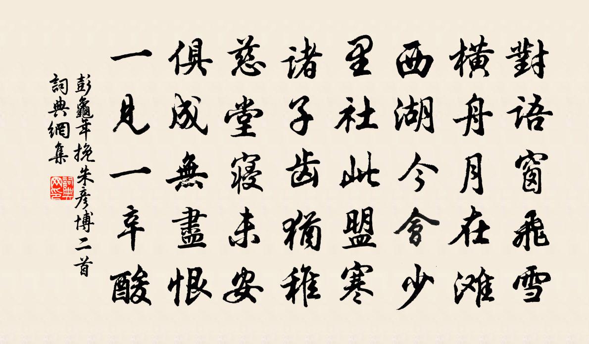 詩詞名句歷史字典書法欣賞書法字典國語詞典說文解字康熙字典古漢語字典標 題 作 者 詩 句 挽朱彥博二首作者:彭龜年 朝代:宋代挽朱彥博二首原文對語窗飛雪,橫舟月在灘。西湖今會少,里社此盟寒。諸子齒猶稚,慈堂寢未安。俱成無盡恨,一見一辛酸。詩詞問答問:挽朱彥博二首的作者是誰?答:彭龜年問:挽朱彥博二首寫於哪個朝代?答:宋代彭龜年挽朱彥博二首書法欣賞挽朱彥博二首書法作品詩詞推薦次韻曾文清公復熱句蘇泂〔宋代〕百頃滄波望似空,鑿冰吾欲浸其中。何言雷電不為雨,須信梧桐自有風。子晉台頭笙遠近,西真池面玉丁東。行箋宛丘道中張耒〔宋代〕日斜沙路馬翩翩,故欲迎涼不著鞭。誰解多情似新月,伴人歸去照人眠。巫山一段雲 望泉峰趙孟頫〔元代〕曉色飄紅葉,平沙枕碧流。泉聲雲影弄新秋。觸處是離愁。臉淚橫波漫,眉攢片月收。佳人慾笑卒難休。半整玉搔亮典座歸中峰庵釋崇岳〔宋代〕太白峰高宇宙低,先師靈骨不曾移。兒孫個個且如許,路上行人口似碑。謝楊景山送酒器黃庭堅〔宋代〕楊君喜我梨花盞,卻念初無注酒魁。矲矮金壺肯持送,挼莎殘菊更傳杯。暑行張鎡〔宋代〕誰敲白石生熱煙,舉頭見嶺思回鞭策。修竹林間有寒甃,莫打渴烏教近前。山居詩浮釋延壽〔宋代〕曠然不被興亡墜,豁爾難教寵辱驚。鼓角城遙無伺候,輪蹄路絕免逢迎。暖眠紙帳茅堂密,穩坐 * 石面平。只有清明張嵲〔宋代〕園幽春去遠,山暗綠初成。雨過林姿潤,風回池面平。十年空潦倒,萬里近清明。淚盡新阡樹,如今青葉生。走筆和張功父玉照堂十絕楊萬里〔宋代〕年年春信遣人疑,賺出詩人枉覓詩。著意探梅偏不發,月斜偶見一橫枝。夜觀汝溪二侄象棋四首錢時〔宋代〕對河車馬夜枰棋,活路經營盡入思。慮患謀身每如許,不應容易落便宜。贈劉師服韓愈〔唐代〕羨君齒牙牢且潔,大肉硬餅如刀截。我今呀豁落者多,所存十餘皆兀臲。匙抄爛飯穩送之,合口軟嚼如牛呞。妻兒人間王安石〔宋代〕人間投老事紛紛,才薄何能強致君。一馬黃塵南陌路,眼中唯見北山雲。舟行坐睡吳則禮〔宋代〕撩天鼻孔蟠雷車,世間諸法種種壞。飽參飯後 * 禪,花湖端為第一代。次韻常粹俞君任二首陳造〔宋代〕匆匆同醉記前年,客路重逢亦偶然。理窟扣君彌入域,生涯憐我欠加鞭。了知富貴難投足,共約歸來徑息肩。舊欲晚題江館(一作晚秋江館書事寄姚郎中)周賀〔唐代〕病寄曲江居帶城,傍門孤柳一蟬鳴。澄波月上見魚擲,晚徑葉多聞犬行。越島夜無侵閣色,寺鐘涼有隔原聲。故園吳姬曲 其二王冕〔元代〕吳姬來,香花未動游塵開。勾玉遲遲錦雲重,百花掩媚春徘徊王孫公子金無限,為君一笑成飛埃。句張鎡〔宋代〕古剎藏幽勝。二十一日風甚明日梅花無在者獨紅萼留枝間甚陳與義〔宋代〕昨日梅花猶可攀,今朝殘萼便斕班。群仙已御東風去,總脫絳袂留林間。春暮郊居寄朱舍人武元衡〔唐代〕幽深不讓子真居,度日閒眠世事疏。春水滿池新雨霽,香風入戶落花餘。目隨鴻雁窮蒼翠,心寄溪雲任卷舒。回首初榮曾豐〔宋代〕{上艹下爭}{上艹下爭}者梅,十月初榮。於郡之廳,有罍有觥。主禮孔誠,洽其歡聲。之子初榮,為鄉為馨。名句推薦不辭山路遠,踏雪也相過。張九齡《答陸澧》 君子不器。孔子弟子《論語·為政篇》 勸君頻入醉鄉來,此是無愁無恨處。晏幾道《玉樓春·雕鞍好為鶯花住》 商人重利輕別離,前月浮梁買茶去。白居易《琵琶行 / 琵琶引》 抽刀斷水水更流,舉杯消愁愁更愁。李白《宣州謝朓樓餞別校書叔雲》 青林翠竹,四時俱備。陶弘景《答謝中書書》 荊江日落陣雲低,橫戈躍馬今何時。納蘭性德《送蓀友》 奸不容細,私告任坐使然也。韓非及後人《韓非子·制分》 未能拋得杭州去,一半勾留是此湖。白居易《春題湖上》 漠漠輕寒上小樓,曉陰無賴似窮秋。淡煙流水畫屏幽秦觀《浣溪沙·漠漠輕寒上小樓》