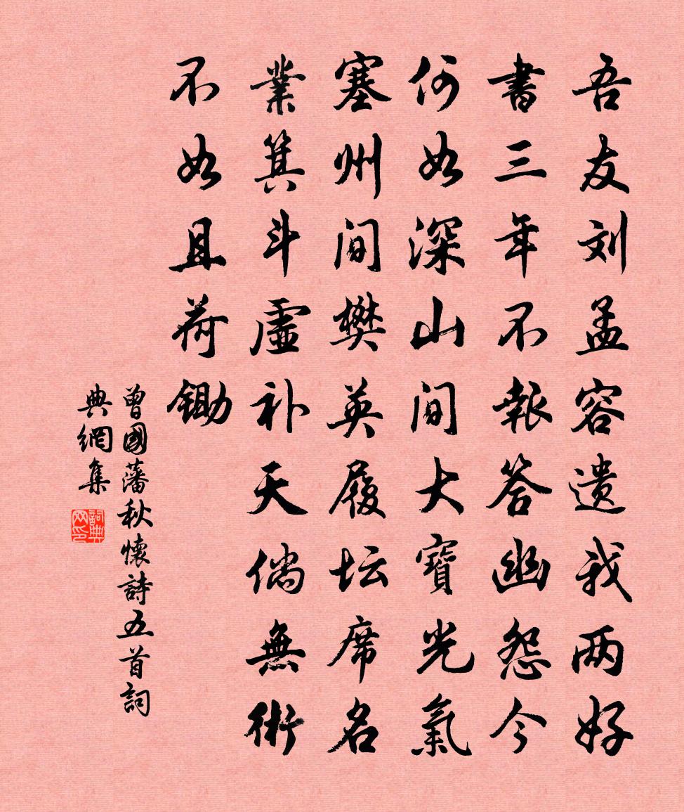 詩詞名句歷史字典書法欣賞書法字典國語詞典說文解字康熙字典古漢語字典標 題 作 者 詩 句 秋懷詩五首作者:曾國藩 朝代:清代秋懷詩五首原文吾友劉孟容,遺我兩好書。三年不報答,幽怨今何如?深山間大寶,光氣塞州間。樊英履壇席,名業箕斗虛。補天倘無術,不如且荷鋤。詩詞問答問:秋懷詩五首的作者是誰?答:曾國藩問:秋懷詩五首寫於哪個朝代?答:清代曾國藩秋懷詩五首書法欣賞秋懷詩五首書法作品詩詞推薦題蟄庵王柏〔宋代〕一蟄了千悞,心安境自寬。軒昂就收斂,自在覓艱難。龍怕烏台勘,人疑蕙帳寒。欲知舒捲意,編簡靜中看。頌證道歌證道歌釋印肅〔宋代〕宗跡通,說亦通,兩處由來劍刃鋒。八還要義漫天訣,七處徵心理一同。孚舟亭新成賦十絕方回〔宋代〕六爻虛實相為用,二位高卑各有宜。順撫說隨心不爽,風漂羅剎有還時。飲張壹齋月台潘璵〔宋代〕同上最高台,山頭晚色開。風才驅雨去,月漸出雲來。世事悲秋扇,吟情付酒杯。誰家砧杵動,寒計又相催。謝邢少連送葡萄豆蔻栽張栻〔宋代〕君家小圃占春光,眼看龍鬚百尺長。移向樓邊並寒井,明年垂實更陰涼。送虞司理赴官辰州二首項安世〔宋代〕當年有虞氏,初作理官名。正以蠻兼冠,須煩允與明。雲孫今筮仕,溪子正稱兵。淑問端能繼,淮夷不足平。集靈台二首張祜〔唐代〕日光斜照集靈台,紅樹花迎曉露開。昨夜上皇新授籙,太真含笑入簾來。虢國夫人承主恩,平明騎馬入宮門。卻嫌宿遷道中遇雪陸文圭〔宋代〕登車宿遷北,萬頃鋪瓊田。墨雲淇水光,上下玻璃天。六花時時飄,集我車上氈。左右拍手笑,翁似日鶴仙。失卻椒溪灘李鏜〔宋代〕一梁中截兩山連,雪布寒飛幾竅穿。深鑒卻疑通禹穴,長流應不比潮泉。崆峒影里分三峽,太極圖中會百種。神斧自賦催妝詩陳嶠〔唐代〕彭祖尚聞年八百,陳郎猶是小孩兒。易安齋韓元吉〔宋代〕紫陌猶千里,禪房自一家。翠深穿小徑,紅濕動迷花。絡石寒梢亂,欹岩碧乾斜。春江夜來雨,如為洗煙霞。望仙鋪梅癯兵〔宋代〕一叟搜盆婦絮羹,喜聞官至出相迎。兩三家自為鄰里,一半田皆無主名。登海山樓陳與義〔宋代〕萬航如鳧鷖,一水如虛空。此地接元氣,壓以樓觀雄。我來自中州,登臨眩沖融。白波動南極,蒼鬢承東風。人間謁金門盧祖皋〔宋代〕人寂寞。簾外翠陰如幄。團扇藤床花間錯。雨邊殘夢覺。翠淺粉銷香薄。臨鏡不忺梳掠。新恨悠悠無處托。棋聲閒又和喜雨四首劉克莊〔宋代〕催花小雨餞餘寒,衰病今朝始出山。移北阜文從汝笑,非西疇事勿予關。預知帝耜開耕籍,初灑天瓢遍城寰。便起送沈光赴福幕(一作送福州從事)李洞〔唐代〕泉齊嶺鳥飛,雨熟荔枝肥。南斗看應近,北人來恐稀。潮浮廉使宴,珠照島僧歸。幕下逢遷拜,何官著茜衣。受業師孫請贊釋法薰〔宋代〕削髮村院裡,僻陋少見聞。信腳到南地,也作住山人。龍床角畔脫空話,引得衲子如蜂屯。思歸未得,故國夢頻。次韻胡邦衡相迎周必大〔宋代〕路逢驛使嶺頭回,喜得新詩勝得梅。情似春風繰楚柳,句如臘雪屑韓瑰。只今皇側求賢席,底事公銜樂聖杯。台路偈三十五首釋祖珍〔宋代〕十五日已前,藏身處沒蹤跡。十五日已後,沒蹤跡處莫藏身。正當十五日,布袋頭開,全身顯露。不憐鵝護雪,且游金陵雨花台賀鑄〔宋代〕迢迢朱雀航,飛蓋共淩越。東風石子岡,芳草微徑絕。生公法堂在,清夜貯明月。回認城郭游,春華爛晴雪。長煙名句推薦山下孤煙遠村,天邊獨樹高原。王維《田園樂七首·其五》 菊暗荷枯一夜霜。新苞綠葉照林光。蘇軾《浣溪沙·詠橘》 一春魚雁無訊息,則見雙燕斗銜泥。關漢卿《大德歌·春》 雨雪雰雰,益之以霢霂。佚名《信南山》 黃昏鼓角似邊州,三十年前上此樓。李益《上汝州郡樓》 生有七尺之形,死唯一棺之土,唯立德揚名,可以不朽陳壽《三國志·魏書·文帝紀》 酒盈杯,書滿架,名利不將心掛。李珣《漁歌子·荻花秋》 民感桑林雨,雲施李靖龍。趙汝愚《雨後送李將軍還祠偕同寅飲一杯亭》 寥落古行宮,宮花寂寞紅。元稹《行宮》 去年元夜時,花市燈如晝。歐陽修《生查子·元夕》