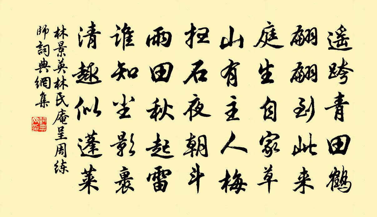 詩詞名句歷史字典書法欣賞書法字典國語詞典說文解字康熙字典古漢語字典標 題 作 者 詩 句 林氏庵呈周練師作者:林景英 朝代:宋代林氏庵呈周練師原文遙跨青田鶴,翩翩到此來。庭生自家草,山有主人梅。掃石夜朝斗,雨田秋起雷。誰知塵影裹,清趣似蓬萊。詩詞問答問:林氏庵呈周練師的作者是誰?答:林景英問:林氏庵呈周練師寫於哪個朝代?答:宋代林景英林氏庵呈周練師書法欣賞林氏庵呈周練師書法作品詩詞推薦失調名李清照〔宋代〕教我甚情懷。苦寒雍陶〔唐代〕今年無異去年寒,何事朝來獨忍難。應是漸為貧客久,錦衣著盡布衣單。次韻宋尚書山居{左牟右卓}然堂方岳〔宋代〕心亦元如止水淵,斷無塵想到諸賢。左蝸不斷追{左牟右卓}夢,說與青山恐未然。廣陵芍藥盛開品目比舊又多累日與同官賞嘆不蘇頌〔宋代〕應是圓玄降瑞精,散為穠麗遍邗城。重苞疊蕊三春後,膩臉豐肌百態生。一自毫堂甄異品,至今花譜續嘉名。都緣冬夜寄溫飛卿魚玄機〔唐代〕苦思搜詩燈下吟,不眠長夜怕寒衾。滿庭木葉愁風起,透幌紗窗惜月沈。疏散未閒終遂願,盛衰空見本來心。幽棲訪晦翁不遇一首王阮〔宋代〕陳良千里赴周公,正值商山去一鴻。腸斷膝行來處路,舞夸空過一番風。次韻何廉昉太守感懷述事十六首曾國藩〔清代〕溢觴初引一泓泉,流出蛟龍萬丈淵。從古精誠能破石,薰天事業不貪錢。腐儒封拜稱詩伯,上策屯耕在現田。巨海十二月十六日後殿朝謁孔武仲〔宋代〕晨光先到帝王州,別殿珠簾不上鉤。萬歲聲齊山獻壽,九門朝退海分流。參差雉尾回丹陛,杳遠雞聲下禁樓。年少九日上懷古堂徐璣〔宋代〕山前事跡古來多,風雨塵埃竟若何。惟有白衣秦處士,數篇佳句不曾磨。飛仙道中李新〔宋代〕鳥銜桃李墮高卑,陵谷逢春花作衣。猶憶去年攜小筥,上山獨自采春薇。澗流到海住家處,今我無家何更歸。修途滿江紅(雨後攜家游西湖,荷花盛開)范成大〔宋代〕柳外輕雷,催幾陣、雨絲飛急。雷雨過、半川荷氣,粉融香浥。弄蕊攀條春一笑,從教水濺羅衣濕。打梁州、簫鼓書事朱翌〔宋代〕春來何事可相關,撥置書叢得少閒。洗硯諦觀鸜鵒眼,焚香仍揀鷓鴣斑。花開北陌東阡外,人在朝三暮四間。俯仰故太夫人章氏輓詞二首范成大〔宋代〕積慶今如許,生兒得寧馨。軻親躬授教,韋子世傳經。壽斝明卿月,安輿拱使星。市橋何處在?夢斷一溪青。旅次錢塘方乾〔唐代〕此地似鄉國,堪為朝夕吟。雲藏吳相廟,樹引越山禽。潮落海人散,鍾遲秋寺深。我來無舊識,誰見寂寥心?賀廣東黃漕生辰六絕曾豐〔宋代〕詔會蟾宮籍里人,召還仙闕作仙賓。王宮專席談先聖,朝路分班謁上真。春夜陸游〔宋代〕寂寂春將暮,迢迢夜未央。膏殘燈焰短,杵急藥麈香。困思棲雙睫,羸軀寄一床。養慵新有味,初志悔軒昂。端午內中帖子詞太上皇后閣王珪〔唐代〕漢殿炎風少,輕涼已動衣。每來觀織室,不許夜停機。送盛君方強至〔宋代〕秋風木葉飛邊徹,日暮銅台別杯釂。燕姬一曲聲未終,交臂方攜忽南棹。相公鎮魏從辟書,玉帳三年奉談笑。密謀喜雨四首張耒〔宋代〕牆東有高樹,夏葉圓綠綺。西風才一夕,蕭颯遽如此。寒螿號其顛,蟋蟀曉未已。群動催流光,榮華難久恃。送游提刑秘閣赴召三首程公許〔宋代〕日馭中天運,冰山失勢多。可能群枉杜,端藉眾賢和。公去應前席,人言合上坡。調停前轍誤,國事竟如何。名句推薦紅酥手,黃縢酒,滿城春色宮牆柳。陸游《釵頭鳳·紅酥手》 丈夫非無淚,不灑離別間。陸龜蒙《別離》 春眠不覺曉,處處聞啼鳥。孟浩然《春曉》 日暮九疑何處?認舜祠叢竹。文廷式《好事近·湘舟有作》 事莫貴乎有驗,言莫棄乎無徴。徐幹《中論·上卷·貴驗》 火冷燈稀霜露下,昏昏雪意雲垂野。蘇軾《蝶戀花·密州上元》 勿言草卉賤,幸宅天池中沈約《詠新荷應詔》 遠夢歸侵曉,家書到隔年。杜牧《旅宿》 浮雲終日行,遊子久不至。杜甫《夢李白二首·其二》 夜雨做成秋,恰上心頭。納蘭性德《浪淘沙·夜雨做成秋》