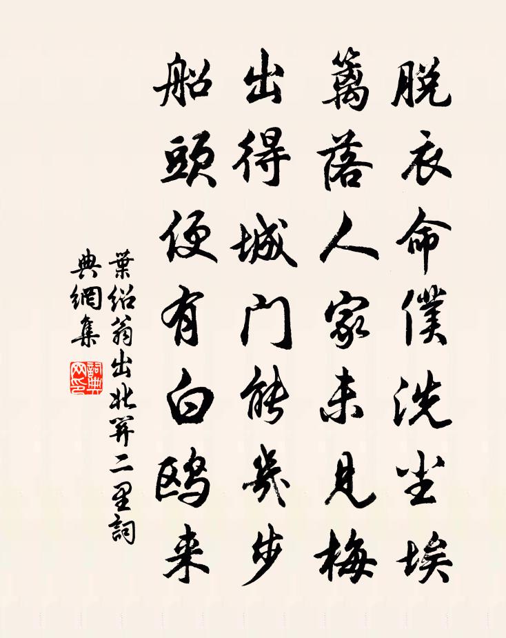 詩詞名句歷史字典書法欣賞書法字典國語詞典說文解字康熙字典古漢語字典標 題 作 者 詩 句 出北關二里作者:葉紹翁 朝代:宋代出北關二里原文脫衣命仆洗塵埃,籬落人家未見梅。出得城門能幾步,船頭便有白鷗來。詩詞問答問:出北關二里的作者是誰?答:葉紹翁問:出北關二里寫於哪個朝代?答:宋代葉紹翁出北關二里書法欣賞出北關二里書法作品詩詞推薦頌古四十八首釋慧開〔宋代〕捲起明明徹太空,太空猶未合吾宗。爭似從空都放下,綿綿密密不通風。下終南山過斛斯山人宿置酒李白〔唐代〕暮從碧山下,山月隨人歸。卻顧所來徑,蒼蒼橫翠微。相攜及田家,童稚開荊扉。綠竹入幽徑,青蘿拂行衣。歡言登新平樓李白〔唐代〕去國登茲樓,懷歸傷暮秋。天長落日遠,水淨寒波流。秦雲起嶺樹,胡雁飛沙洲。蒼蒼幾萬里,目極令人愁。紫蔕梅李龍高〔宋代〕外面看來本色非,香袍隱映省垣薇。誰知傲睨風霜底,不改平生一布衣。文宣王及其弟子贊宋高宗〔宋代〕兄弟之邦,士有廉庸。涵泳素教,表揭儒宗。杏壇探頤,洙泗從容。作興一時,莒父其封。浣溪沙(元夕後三日王文明席上)范成大〔宋代〕寶髻雙雙出綺叢。妝光梅影各春風。收燈時候卻相逢。魚子箋中此宛轉,龍香撥上語玲瓏。明朝車馬莫西東。與沈十九拾遺同游棲霞寺上方於亮上人院會宿二首權德輿〔唐代〕攝山標勝絕,暇日諧想矚。縈紆松路深,繚繞雲岩曲。重樓回樹杪,古像鑿山腹。人遠水木清,地深蘭桂馥。層台題靈岩羅榮祖〔宋代〕巨鰲戴山凌空起,橫絕碧雲千萬里。嵐風飛淨明彩霞,四字八紘皆望里。霧障高懸五老峰,朵朵肖削成芙蓉。天柱次韻仲輔山中之作李彌遜〔宋代〕岩陰坐清暝,目為山興注。妙意不可名,悠然與心晤。疏泉石中鳴,落葉衣上住。冷風起虛籟,還向無中去。三生句程大昌〔宋代〕有底滑稽堪羨處,金蓮燭里話窮酸。葺居五首蘇轍〔宋代〕東南皆民居,屋敗如齬齒。一完誠未能,綴葺聊且爾。內修晨夜虞,外結比鄰喜。無心本何營,生理未免此。和董判官寺居作陳師道〔宋代〕共作東州客,同棲古寺深。論交非有舊,不見解相尋。冷過清明節,悲生故國心。此身隨所寄,未足問升沉。失調名佚名〔宋代〕雲情雨意商量雪。天台三隱贊釋紹曇〔宋代〕門鉤弗解開扃,苕箒不能掃地。解說杜撰文書,背後有人切齒。往復無間釋重顯〔宋代〕日入酉,室內覆盆且依舊。塵塵彼彼丈夫兒,井中之物同哮吼。諷諫詩韋孟〔兩漢〕肅肅我祖,國自豕韋,黼衣朱紱,四牡龍旂。彤弓斯征,撫寧遐荒,總齊群邦,以翼大商,迭披大彭,勳績惟光。寄夾谷書隱何夢桂〔宋代〕當年曾憶賦高唐,回首邯鄲事渺茫。黃閣故人千里月,青山老我半頭霜。交情脈脈園中柳,憂思悠悠陌上桑。吹斷次韻徐太博方岳〔宋代〕沈郎吟處秋風老,今代何人詩斗南。練石補天君特妙,追雲逐月我何堪。極知才倍曹丕十,不但人如漢傑三。欲與送王甲宰青石縣魏野〔宋代〕陶潛但植當門柳,潘岳惟栽滿縣花。爭似伯玄青石去,教民先只種桑麻。游慈雲陳著〔宋代〕曉日烘晴一白晞,青蛙踏滑叩禪扉。千山流水溪聲活,二麥涵滋野色肥。僵臥不妨晴又出,興來誰肯夜空歸。弟兄名句推薦亂雲低薄暮,急雪舞迴風。杜甫《對雪》 鴻羽難憑芳信短,長安猶近歸期遠。盧祖皋《倦尋芳·香泥壘燕》 秋空明月懸,光彩露沾濕。孟浩然《秋宵月下有懷》 日落謝家池館,柳絲金縷斷。韋莊《歸國遙·春欲晚》 香幃風動花入樓,高調鳴箏緩夜愁。王昌齡《青樓怨》 釣者之恭,非為魚賜也;餌鼠以蟲,非愛之也。墨子《墨子·49章 魯問》 羞日遮羅袖,愁春懶起妝。魚玄機《贈鄰女 / 寄李億員外》 心之憂危,若蹈虎尾,涉於春冰。佚名《尚書·周書·君牙》 一朝權在手,便把令來行。佚名《增廣賢文·下集》 春晚綠野秀,岩高白雲屯。謝靈運《入彭蠡湖口》