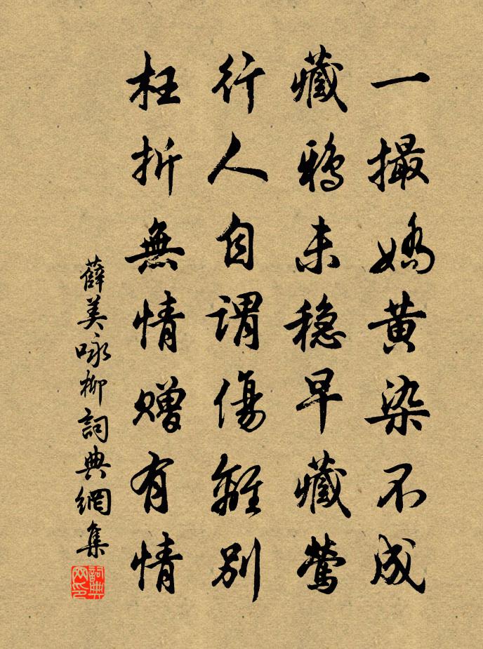 詩詞名句歷史字典書法欣賞書法字典國語詞典說文解字康熙字典古漢語字典標 題 作 者 詩 句 詠柳作者:薛美 朝代:宋代詠柳原文一撮嬌黃染不成,藏鴉未穩早藏鶯。行人自謂傷離別,枉折無情贈有情。詩詞問答問:詠柳的作者是誰?答:薛美問:詠柳寫於哪個朝代?答:宋代薛美詠柳書法欣賞詠柳書法作品詩詞推薦行婦怨次李編校韻戴表元〔宋代〕赤城岩邑今窮邊,路傍死者相枕眠。惟余婦女收不殺,馬上娉婷多少年。蓬頭垢面誰氏子,放聲獨哭哀聞天。傳聞題樊氏樓壁王灼〔宋代〕老秋氣已嚴,今日稍晴和。登君樓西翼,相對一酣歌。邊烽照仙關,大將方枕戈。吾儕無志用,心懾鬢先皤。強促湘妃怨陳羽〔唐代〕舜欲省蠻陬,南巡非逸游。九山沉白日,二女泣滄洲。目極楚雲斷,恨連湘水流。至今聞鼓瑟,咽絕不勝愁。寄趙昌甫陸游〔宋代〕杳杳雙鵲鳴庭除,東陽吏傳昌甫書。紙窮乃復得傑作,字字如刮造化爐。爾來此道苦寂寞,千里一士如鄰居。小兒征婦吟陳淳祖〔宋代〕虜退沙場洗戰斑,誰家不上望夫山。江邊迤邐春無賴,楊柳枝垂人不還。贈郭雄李曾豐〔宋代〕八載交盟尚未寒,相逢何處再開顏。互隨宦牒往來次,俱在梅頭南北間。臧若諱忘誰是谷,觸如爭勝孰肱謀。高軒春閒戲書三首李新〔宋代〕幾家桃李高低樹,一望江山表里春。寂寞無心看花去,懸知自有看花人。贈張山人談命姚勉〔宋代〕等閒客里捧茶甌,說到人間第一流。圯上遺編今在否,異時來問赤松游。追和白舍人詠白牡丹徐夤〔唐代〕蓓蕾抽開素練囊,瓊葩薰出白龍香。裁分楚女朝雲片,剪破姮娥夜月光。雪句豈須征柳絮,粉腮應恨帖梅妝。檻邊送淨道人徐鉉〔唐代〕北阜與西山,前期夢寐間。羨師乘興去,應擬此生閒。喬木人誰在,鱸魚我未還。歸心寄秋水,東去日潺潺。綠頭鴨 湖上遇雪,再用前韻張可久〔元代〕勝花時。臨風渺予思。厭春妍、紅嬌綠奼,鉛花只恁輕施。濕模糊、難描樹影,白**、盡改松姿。裙濺冰泥。鞋依韻和宣叔行舟相隔見寄梅堯臣〔宋代〕汴漲濺濺費挽牽,輕舟難若上青天。只知乘駃及先去,不意遲留落那邊。憶秦娥劉克莊〔宋代〕泥滑滑。一聲聲喚征鞍發。征鞍發。客亭楊柳,不禁攀折。荀郎衣上香初歇。蕭郎心下書難說。書難說。霎時吹散蝶戀花王炎〔宋代〕柳暗西湖春欲暮。無數青絲,不系行人住。一點心情千萬緒。落花寂寂風吹雨。喚起聲中人獨睡。千里明駝,不踏江南送北客,因憑寄徐州兄弟書(時年十五)白居易〔唐代〕故園望斷欲何如,楚水吳山萬里餘。今日因君訪兄弟,數行鄉淚一封書。曉上天津橋閒望偶逢盧郎中張員外攜酒同傾白居易〔唐代〕上陽宮裡曉鍾後,天津橋頭殘月前。空闊境疑非下界,飄搖身似在寥天。星河隱映初生日,樓閣蔥蘢半出煙。此處海棠二首傅察〔宋代〕恰恰清明昨產過,海棠幽獨占春多。杜陵不是無心賦,才薄難工奈若何。二十三日使風趙蕃〔宋代〕江行已屬北風權,此去寧憂上水船。臥聽招呼帆轉腳,起看飛濺水平舷。鷗乘逸氣沿仍溯,雁怯驚吹斷復連。玄妙道中累日不肉食至西縣市中得羊因小酌陸游〔宋代〕門外倚車轅,頹然就醉昏。棧余羊絕美,壓近酒微渾。一洗窮邊恨,重招去乾魂。客中無晤語,燈燼為誰繁?鼠狼二首釋寶曇〔宋代〕業為鼠技不能群,酷似狼貪卻畏人。歃血未乾猶竊粟,豈應秦了又生秦。名句推薦西北望鄉何處是,東南見月幾回圓。白居易《八月十五日夜湓亭望月》 時見幽人獨往來,縹緲孤鴻影。蘇軾《卜運算元·黃州定慧院寓居作》 見了你朝霞的顏色,便感到我落月的沉哀戴望舒《山行(見了你朝霞的顏色)》 況故人新擁,漢壇旌節。辛棄疾《滿江紅·漢水東流》 鳳簫聲動,玉壺光轉,一夜魚龍舞。辛棄疾《青玉案·元夕》 朱顏那有年年好,逞艷游、贏取如今韓疁《高陽台·除夜》 念碎劈芳心,縈思千縷,贈將幽素,偷翦重雲。吳文英《風流子·黃鐘商芍藥》 武皇去金閣,英威長寂寞江淹《銅爵妓》 風起,雪飛炎海變清涼。蘇軾《定風波·南海歸贈王定國侍人寓娘》 一年最好,偏是重陽。吳文英《惜黃花慢·菊》