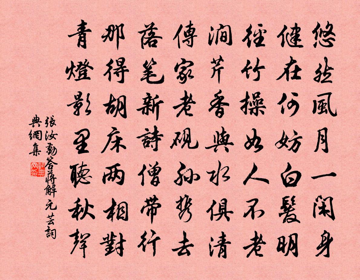 詩詞名句歷史字典書法欣賞書法字典國語詞典說文解字康熙字典古漢語字典標 題 作 者 詩 句 答蔣解元芸作者:張汝勤 朝代:宋代答蔣解元芸原文悠然風月一閒身,健在何妨白髮明。徑竹操如人不老,澗芹香與水俱清。傳家老硯孫攜去,落筆新詩僧帶行。那得胡床兩相對,青燈影里聽秋聲。詩詞問答問:答蔣解元芸的作者是誰?答:張汝勤問:答蔣解元芸寫於哪個朝代?答:宋代張汝勤答蔣解元芸書法欣賞答蔣解元芸書法作品詩詞推薦舟夜即事王安石〔宋代〕火炬臨遙岸,餘光照客船。水明魚中餌,沙暖鷺忘眠。感概無窮事,遲回欲曉天。山泉如有意,枕上送潺湲。南陽帝上各賦玉蝴蝶花一絕寇準〔宋代〕堪賞東君造化奇,裝成蝴蝶滿纖枝。粉融輕翅攢花蕊,疑是尋芳未去時。學佛吟邵雍〔宋代〕飽食豐衣不易過,日長時節奈愁何。求名少日投宣聖,怕死老年親釋迦。妄欲斷緣緣愈重,徼求去病病還多。長江塞翁吟周邦彥〔宋代〕暗葉啼風雨,窗外曉色瓏。散水麝,小池東。亂一岸芙蓉。蘄州簟展雙紋浪,輕帳翠縷如空。夢念遠別、淚痕重寄孫從之趙蕃〔宋代〕顧使斯人墨綬腰,不知誰合上丹霄。得非疲瘵要摩撫,是遣循良頒詔條。聞道過家猶數月,尚期論薦出公朝。過予郊廟歌辭。禪社首樂章。太和賀知章〔唐代〕昭昭有唐,天俾萬國。列祖應命,四宗順則。申錫無疆,宗我同德。曾孫繼序,享神配極。寄喬逸人羅隱〔唐代〕南經湘浦北揚州,別後風帆幾度游。春酒誰家禁爛漫,野花何處最淹留。欲憑尺素邊鴻懶,未定雕梁海燕愁。長短遠父往富沙兼簡馬莊父二首趙蕃〔宋代〕不待蒼然暮色,可應萬里須論。要悟須彌芥納,莫參雲夢胸吞。題彭澤後人吟樓釋斯植〔宋代〕結屋在雲端。悠然趣自安。江山隨望遠,星月近人寒。劍氣當空正,詩情對酒寬。往來庭畔叟,只作晉時看。奉和魯望漁具十五詠叉魚皮日休〔唐代〕列炬春溪口,平潭如不流。照見游泳魚,一一如清晝。中目碎瓊碧,毀鱗殷組繡。樂此何太荒,居然愧川後。金甖花聯句楊萬里〔宋代〕兩日風狂雨更顛,取將暖去正衣單。金甖花發關誰事,何用夜來如許寒。送相十高元善二首楊萬里〔宋代〕稚子煩君一一看,丁寧莫道好求官。老來正要團欒唑,伴我伙風把釣竿。勝勝慢(草詞)趙長卿〔宋代〕濃芳滿地,秀色連天,和煙帶雨萋萋。幾許芳心,還解報得春暉。當時謝郎夢裡,似殷勤、傳與新詩。卻為甚、動仙佛之孝十首蘇仙公林同〔宋代〕世傳蘇氏子,白日去登仙。念母留空櫃,敲時即得錢。春使道中作三首歐陽修〔宋代〕客夢方在家,角聲已催曉。◇◇行人起,共怨角聲早。馬蹄終日踐冰霜,未到思回空斷腸。少貪夢裡還家樂,早起送翁靈舒赴越帥分韻得欲字戴栩〔宋代〕越峰羅四圍,越水鏡相燭。我昔扁舟來,十日看不足。天垂禹祠旁,海入秦望曲。荒寒暝色歸,牛背下鴝鵒。興亡送魏騎曹充宇文侍御判官分按山南孫逖〔唐代〕雲雨陽台路,光華驛騎巡。勸農開夢土,恤隱惠荊人。樓迥吟黃鶴,江長望白蘋。觀風布明詔,更是漢南春。玩殘雪寄江南尹劉大夫許渾〔唐代〕艷陽無處避,皎潔不成容。素質添瑤水,清光散玉峰。眠鷗猶戀草,棲鶴未離松。聞在金鑾望,群仙對九重。春盡出郊張榘〔宋代〕薔薇花落筍斑斑,醖釀清和數日間。杜宇不知春去了,又啼斜日過前山。黃鶴洞中仙 俗喝馬卜運算元王哲〔元代〕正被離家遠。衰草寒煙染。水隔孤村兩三家,你不牽上他馬,獨立沙汀岸。叫得船離岸。舉棹波如練。漁叟停船問名句推薦歌泣不成天已暮,悲風日夜起江生。魏禧《登雨花台》 新寒中酒敲窗雨,殘香細裊秋情緒。納蘭性德《菩薩蠻·新寒中酒敲窗雨》 犯刑若履虎,不畏落爪牙。李白《秦女休行》 其人雖已沒,千載有餘情。陶淵明《詠荊軻》 紅粉佳人休使老,風流浪子莫教貧。佚名《增廣賢文·上集》 卷盡殘花風未定,休恨,花開元自要春風。辛棄疾《定風波·暮春漫興》 應是天仙狂醉,亂把白雲揉碎。李白《清平樂·畫堂晨起》 玉璫緘札何由達,萬里雲羅一雁飛。李商隱《春雨》 朝看水東流,暮看日西墜。錢福《明日歌》 雲雷,屯;君子以經綸。佚名《易傳·象傳上·屯》