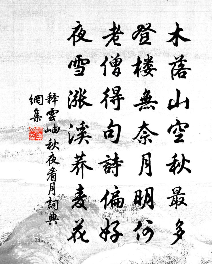 詩詞名句歷史字典書法欣賞書法字典國語詞典說文解字康熙字典古漢語字典標 題 作 者 詩 句 秋夜看月作者:釋雲岫 朝代:宋代秋夜看月原文木落山空秋最多,登樓無奈月明何。老僧得句詩偏好,夜雪漲溪蕎麥花。詩詞問答問:秋夜看月的作者是誰?答:釋雲岫問:秋夜看月寫於哪個朝代?答:宋代釋雲岫秋夜看月書法欣賞秋夜看月書法作品詩詞推薦眉州借景亭汪元量〔宋代〕巍亭借景引壺觴,元佑詩人翰墨香。蒼峽雷霆龍意氣,碧崖煙雨豹文章。隔鄰修竹娟娟靜,夾道枯桑冉冉黃。水泛邵伯埭下寄高郵陳郎中徐鉉〔唐代〕故人相別動經年,候館相逢倍慘然。雇我飲冰難輟棹,感君扶病為開筵。河灣水淺翹愁鷺,柳岸風微噪暮蟬。欲識郊廟歌辭。周郊祀樂章。治順樂佚名〔唐代〕羽衛離丹闕,金軒赴泰壇。珠旗明月色,玉佩曉霜寒。黼黻龍衣備,琮璜寶器完。百神將受職,宗社保長安。詩一首胡銓〔宋代〕夜讀文公猛虎詩,云何虎死忽悲啼。人生未省向來事,虎死方羞前所為。昨日猶能食熊豹,今朝無計奈狐狸。我曾題睢陽五老圖歐陽謙之〔宋代〕厚德良多積善根,賢才他日在兒孫。當知相里非凡婿,豈有陳平久席門。五老繪圖千載譽,群公詩禮百年存。憑君鳳凰台馮去非〔宋代〕許大乾坤里,那無一鳳鳴。台欹紅日晚,梧拂翠雲生。瑣瑣六朝夢,悠悠千古情。寒潮如有恨,時打石頭城。蒲徐夤〔唐代〕濯秀盤根在碧流,紫茵含露向晴抽。編為細履隨君步,織作輕帆送客愁。疏葉稍為投餌釣,密叢還礙採蓮舟。鴛鴦讀漢紀徐夤〔唐代〕布衣空手取中原,勁卒雄師不足論。楚國八千秦百萬,豁開胸臆一時吞。周子及盬簿輓詩二首楊萬里〔宋代〕科目連雙中,聲名莫二渠。手曾攀折檻,客有淚辭車。速化非吾事,偷閒只古書。黑頭黃壤去,有昊定何如。晚泊陸游〔宋代〕樓上嗚嗚角,橋邊點點燈。聚沙新到雁,趁渡獨歸僧。日隱山光暗,天低海氣蒸。居人笑老子,醉發亂鬅鬙。九日有感二首強至〔宋代〕憶昨方陪上相筵,召書忽到菊杯前。主人舉酒勤令飲,一醉秋風恰二年。過昭君村(村在歸州東北四十里)白居易〔唐代〕靈珠產無種,彩雲出無根。亦如彼姝子,生此遐陋村。至麗物難掩,遽選入君門。獨美眾所嫉,終棄於塞垣。唯此偶作二首白玉蟾〔宋代〕露滴中宵月,松搖古谷風。三身紅萏菡,四智碧芙蓉。方壺何澹〔宋代〕玉壺清景面瑤池,便入丹青也自宜。挾冊幾回成獨往,壺公應笑一書痴。送楊議卿赴舉文同〔宋代〕寒日照殘樹,新霜結衰草。有客奉高薦,策馬奔遠道。聲名近轉大,文字素已好。壯歲雖可恃,榮科亦宜早。勉自泛免口占金履祥〔宋代〕皇家科目喜宏開,試比抽拈不擇才。多少官人無著處,不知能得幾人來。二十九日過小將軍大將軍嶺項安世〔宋代〕復嶺參差意出群,行人遙指兩將軍。黥彭只麽空山老,不向中原早策勛。送僧赴黃山沐湯泉兼參禪宗長老杜荀鶴〔唐代〕聞有湯泉獨去尋,一瓶一缽一無金。不愁亂世兵相害,卻喜寒山路入深。野老禱神鴉噪廟,獵人沖雪鹿驚林。患身正陽堂宴勞凱旋詩沈約〔南北朝〕凱入同高宴。飲至均多祜。昔往歌採薇。今來歡杕杜。善戰惟我皇。勝之不窺戶。推轂授神謨。余壯終能賈。浩蕩建隆以來祀享太廟十六首佚名〔宋代〕猗歟太祖,受命於天。化行區宇,功溢簡編。武威震耀,文德昭宣。開基垂統,億萬斯年。名句推薦想當年、空運籌決戰,圖王取霸無休。柳永《雙聲子·晚天蕭索》 盡道隋亡為此河,至今千里賴通波。皮日休《汴河懷古二首》 京口瓜洲一水間,鐘山只隔數重山王安石《泊船瓜洲》 正入萬山圈子裡,一山放過一山攔楊萬里《過松源晨炊漆公店》 君子坦蕩蕩,小人長戚戚。孔子弟子《論語·述而篇》 紛紛墜葉飄香砌。夜寂靜,寒聲碎。范仲淹《御街行·秋日懷舊》 垂楊拂綠水,搖艷東風年。李白《折楊柳》 談歡則字與笑並,論戚則聲共泣偕劉勰《文心雕龍·誇飾》 惟有綠荷紅菡萏,卷舒開合任天真。李商隱《贈荷花》 潦倒不通世務,愚頑怕讀文章。曹雪芹《紅樓夢·第三回》