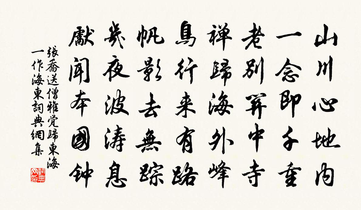 詩詞名句歷史字典書法欣賞書法字典國語詞典說文解字康熙字典古漢語字典標 題 作 者 詩 句 送僧雅覺歸東海(一作海東)作者:張喬 朝代:唐代原文山川心地內,一念即千重。老別關中寺,禪歸海外峰。鳥行來有路,帆影去無蹤。幾夜波濤息,先聞本國鍾。詩詞問答問:《送僧雅覺歸東海(一作海東)》的作者是誰?答:張喬問:該詩寫於哪個朝代?答:唐代書法欣賞送僧雅覺歸東海(一作海東)書法作品注釋全唐詩:卷638-37詩詞推薦坦老求題真歇宏智竹庵同游雁山酬唱真跡軸後釋紹曇〔宋代〕天生三個老冤魔,狹路相逢沒柰何,□把肚腸摟抉看,曲於四十九盤多。白雲端和尚贊二首釋宗杲〔宋代〕少處更減,多處又添。達磨不會,卻反西天。寄謝新安豐守胡達孝見遺近詩一軸便呈甘叔異趙蕃〔宋代〕向子識損益,揚雄愛清靜。我行蕭灘上,二宅駕輒命。而於酬唱中,又得胡安豐。詩作文選體,字有眉山蹤。掃門詩一首張珍奴〔宋代〕逢師許多時,不說些兒個。及至如今悶,損我援筆末。象之席上賦得寒字韓維〔宋代〕愛子林亭勝,高秋駐馬鞍。梨紅先著露,竹碧自生寒。慘戚傷多事,淹留強一歡。所嗟怯杯酌,不得倒吾冠。送高執中赴文州楒林李新〔宋代〕兩眼追霜鷹,鐵石懸肺腑。何為向北風,送子淚如雨。平生珍古交,及今未多數。相逢漢江曲,聊作蘋鷗聚。我疾題余文叔山間四時之樓舒岳祥〔宋代〕輕財好事余文叔,磊落襟期端不俗。外方避地客來多,我亦從君借書屋。屋前曲徑繞淪漪,池上高樓新結束。一條將道洛先寄太師文相公宋祁〔宋代〕兩鬢蓬飛歲月侵,收還秘殿上恩深。鳥毛落盡那勝彈,桐尾燒焦敢望琴。前日化工依大冶,今茲舊物恃遺簪。塵容次韻潁叟弟耕堂雜興六首蘇泂〔宋代〕已芸何似與人芸,水旱螟蝗不可聞。必欲糠粞飽雞鶩,明年余作勸農文。頌古一百二十一首釋宗杲〔宋代〕丹山生鸑鷟,師子產狻猊。棒下摩醯眼,徒夸第一機。遣興陸游〔宋代〕療飢惟恃粥,動步已須人。欲午猶支枕,經旬不過鄰。鵲棲寒自穩,鷗沒遠難馴。莫笑謀身拙,黃冠學季真。用李參政韻並錄寄舟峰師四首曹勛〔宋代〕峙玉層水瑩肺肝,秉鎂風節素岩岩。交河諭旨師無戰,榆塞宣恩俗舊銜。成算已功休大樹,洞章詠志發幐緘。斯篇偈頌八十七首釋慧開〔宋代〕參禪要真實,真造無疑地。聞非未必非,說是未必是。黃龍設三關,曹洞列五位。坐斷主人公,且不落第二。嵩山望幸王邕〔唐代〕峻極位何崇,方知造化功。降靈逢聖主,望幸表維嵩。隱映連青壁,嵯峨向碧空。象車因葉瑞,龍駕願升中。萬歲七月二日大風作一晝夜方止土人去此風潮信也張嵲〔宋代〕風不終朝聞老氏,撼山今既一期余。得非造化誇能事,要使人無盡信書。春日雜興十首秦觀〔宋代〕桃李用事辰,鮮明奪雲綺。繁華一朝去,默默慚杞梓。時徂鷹化鳩,地遷橘為枳。獨有羨門生,後天猶不死。旅舍聽雨柴隨亨〔宋代〕夜長難得寐,況復雨淋淫。百事不如意,一時都上心。客程歧路遠,歸興海濤深。賴有東林社,招搖賦賞音。解蹀躞方千里〔宋代〕院宇無人晴晝,靜看簾波舞。自憐春晚,漂流尚羈旅。那況淚濕征衣,恨添客鬢,終日子規聲苦。動離緒。謾徘徊和柳子玉官舍十首之土榻黃庭堅〔宋代〕榻前鼓吹蛙一部,榻上古木吟風雨。客來相倚竹根眠,免令不解陳登去。旅中偶成釋斯植〔宋代〕風吹客袂寒,飄泊在長安。對雨春題盡,看雲夜坐殘。遠山平楚水,蒼漢接吳灘。遙憶天台寺,相攜去不難。名句推薦賭近盜,淫近殺。馮夢龍《警世通言·卷三十五》 百畝庭中半是苔,桃花淨盡菜花開。劉禹錫《再游玄都觀》 鳥向檐上飛,雲從窗里出。吳均《山中雜詩》 樓前綠暗分攜路,一絲柳、一寸柔情。吳文英《風入松·聽風聽雨過清明》 父為考,母為妣。佚名《爾雅·釋親》 今年春淺臘侵年。冰雪破春妍。蘇軾《一叢花·今年春淺侵年》 夢斷香消四十年,沈園柳老不吹綿。陸游《沈園二首》 沙場烽火連胡月,海畔雲山擁薊城。祖詠《望薊門》 丞相祠堂何處尋,錦官城外柏森森。杜甫《蜀相》 仁者見之謂之仁,知者見之謂之知佚名《易傳·繫辭傳上·第五章》